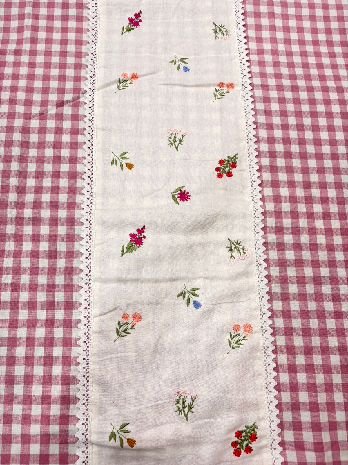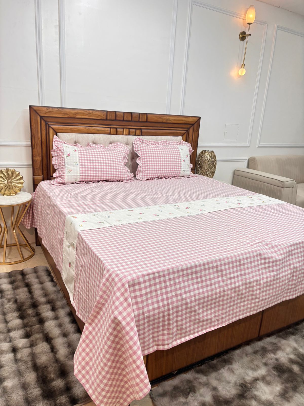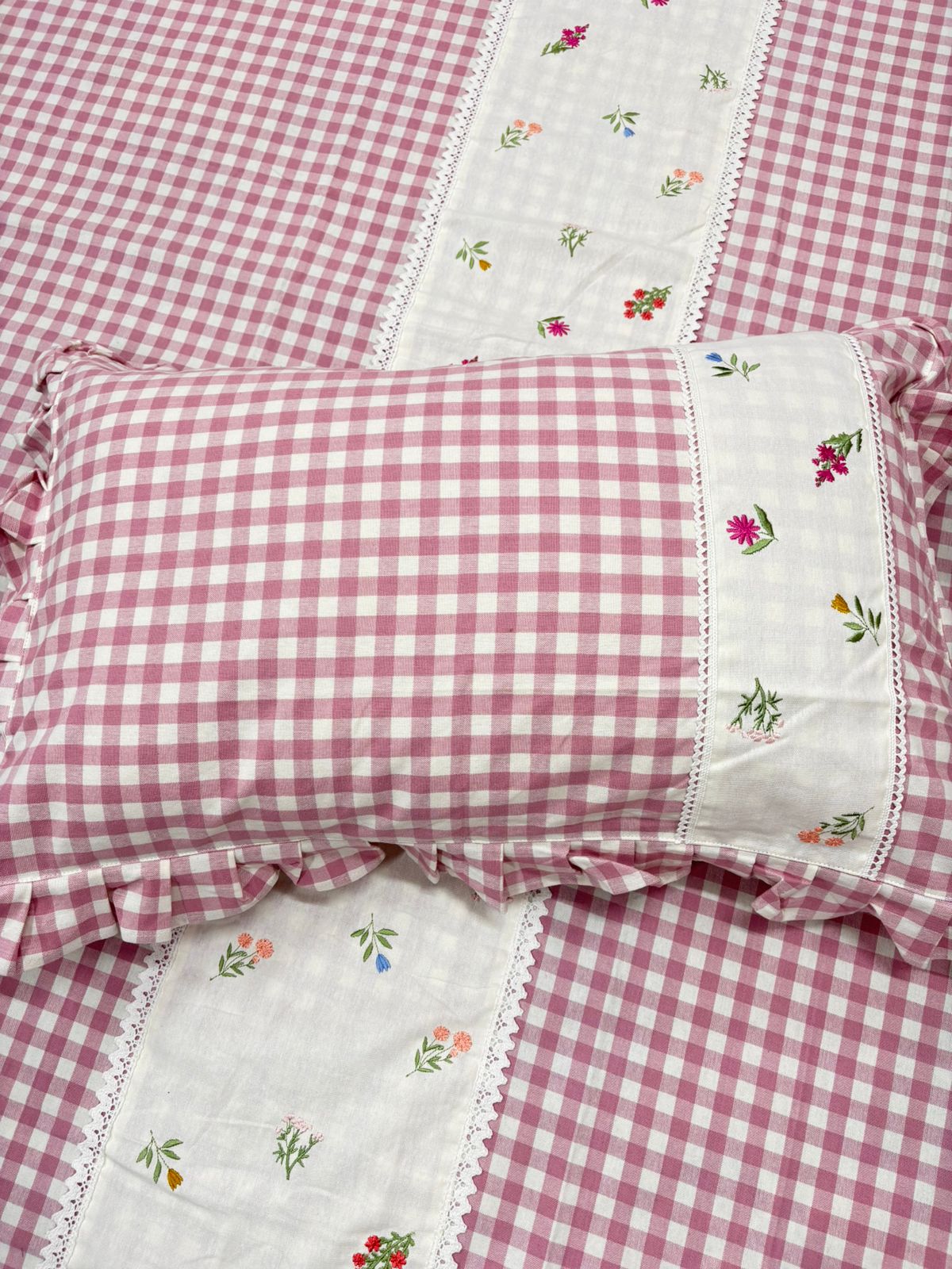 Give your bedroom a soft and charming makeover with this pastel pink gingham bedsheet. Featuring a classic check pattern paired with a delicate floral panel, it perfectly blends sweetness with sophistication πŸ’•