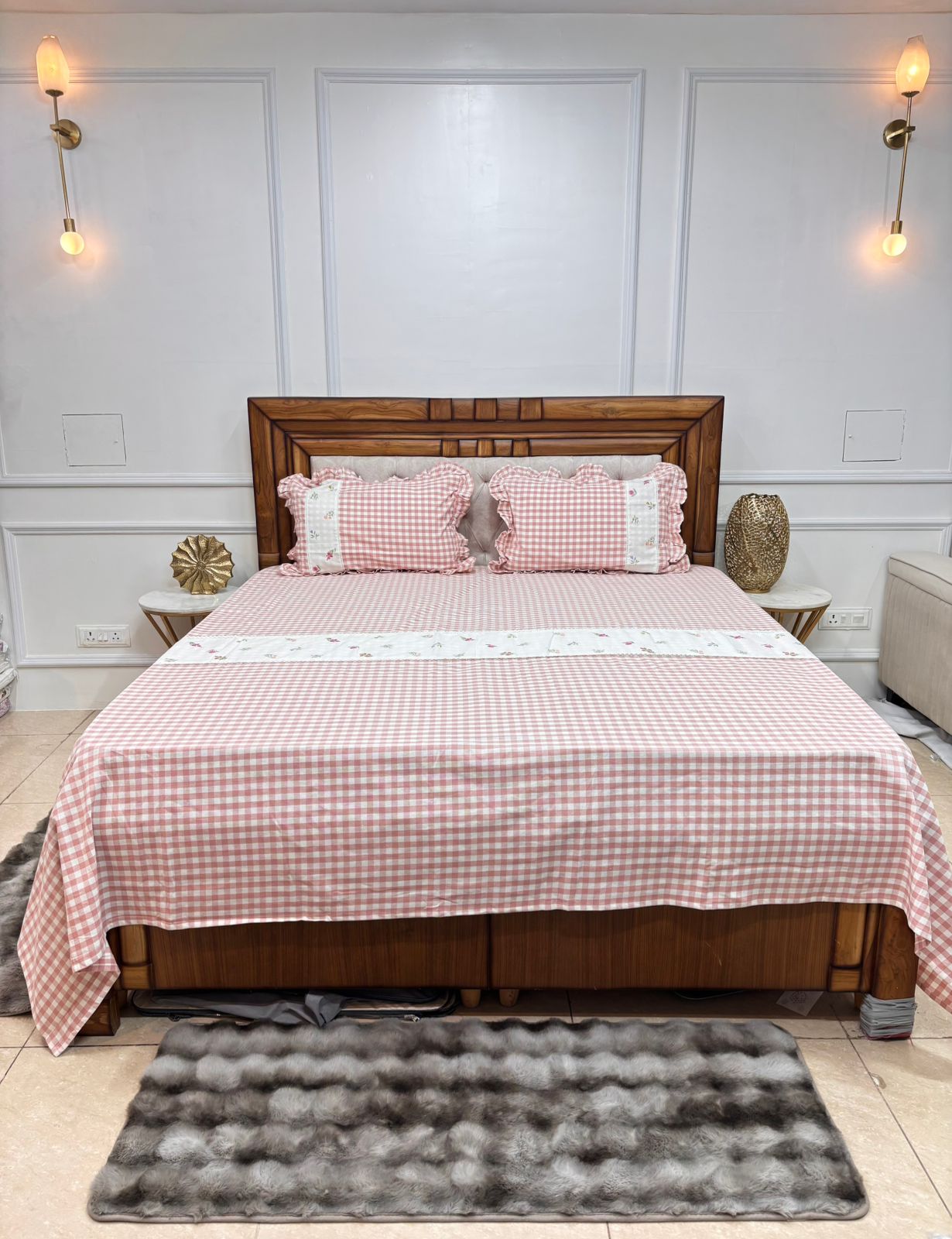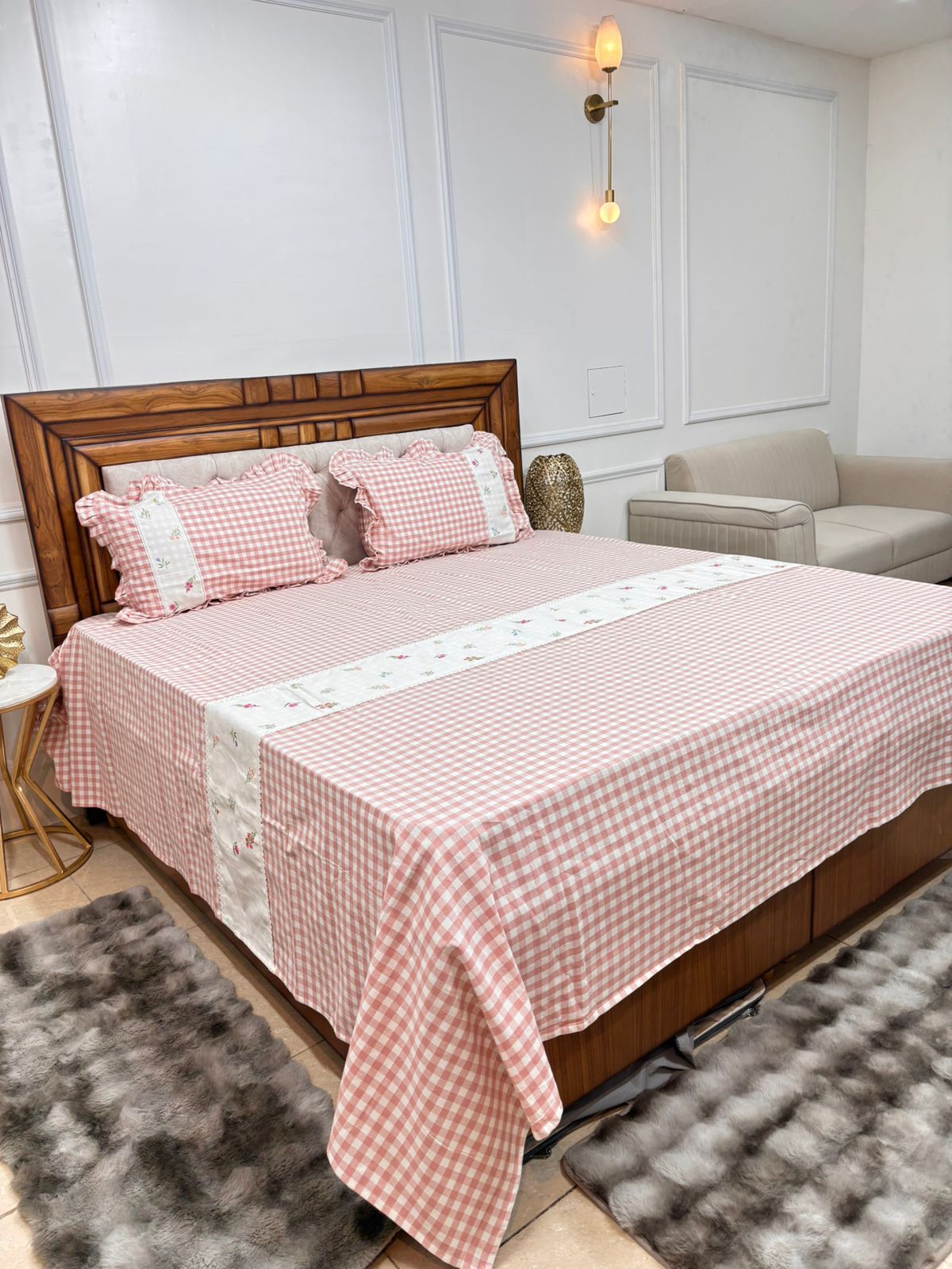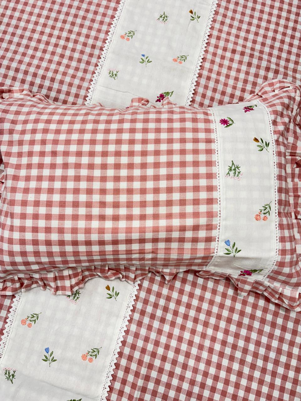 Add a touch of warmth and charm to your bedroom with this beautiful blush pink checkered bedsheet. Featuring a classic gingham pattern paired with a delicate floral stripe, it creates a perfect blend of cozy comfort and elegant design πβ¨