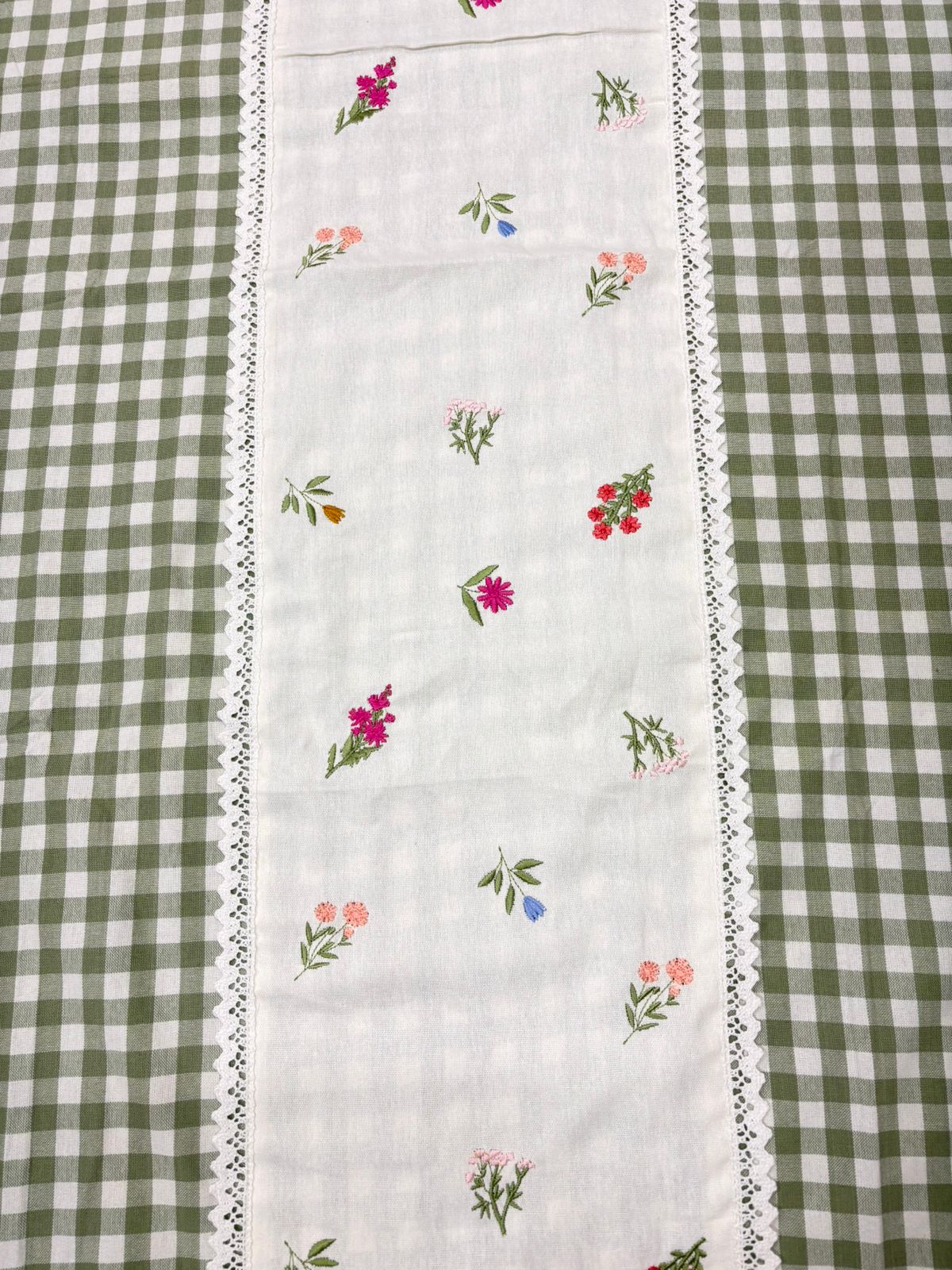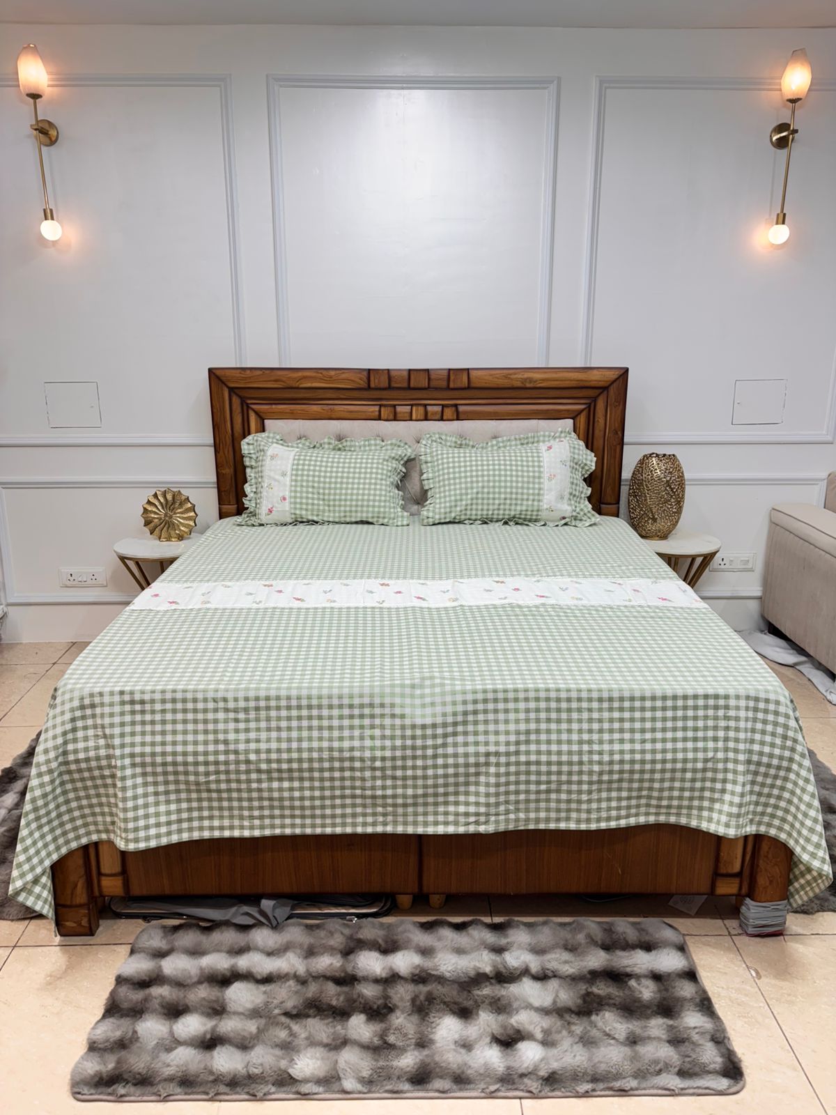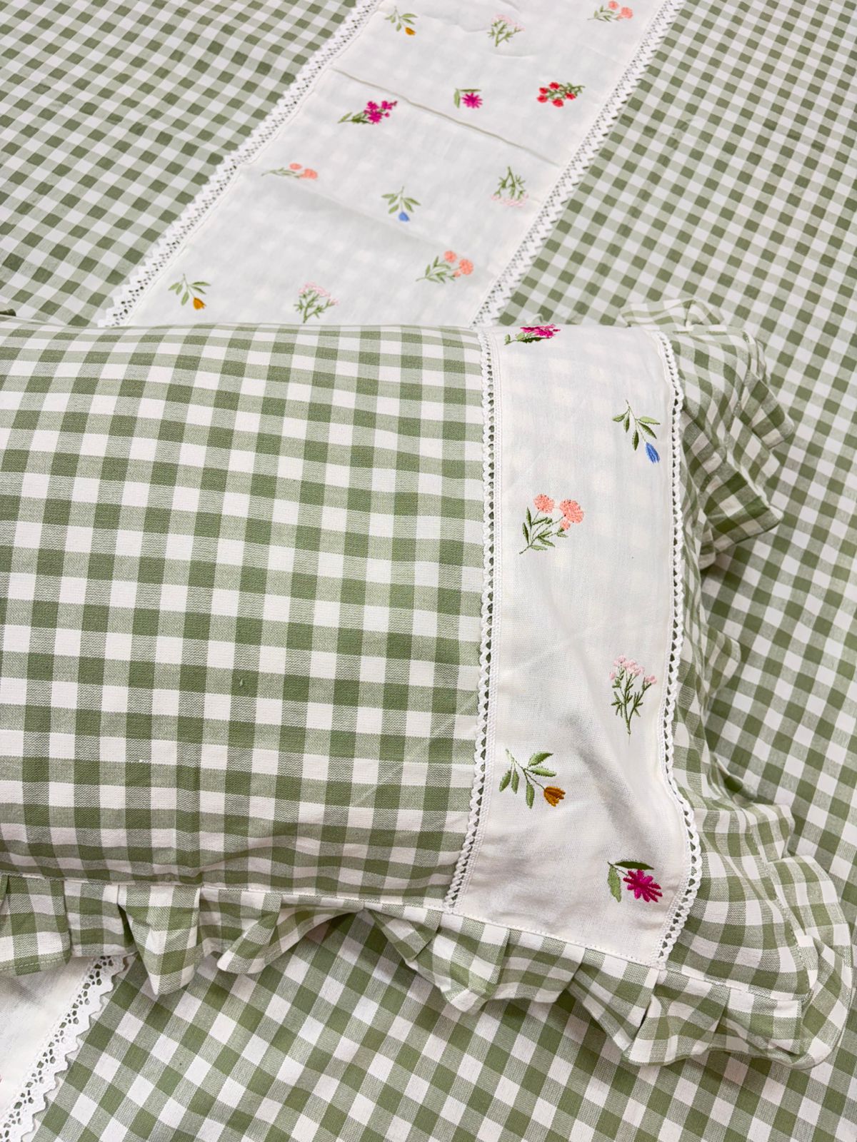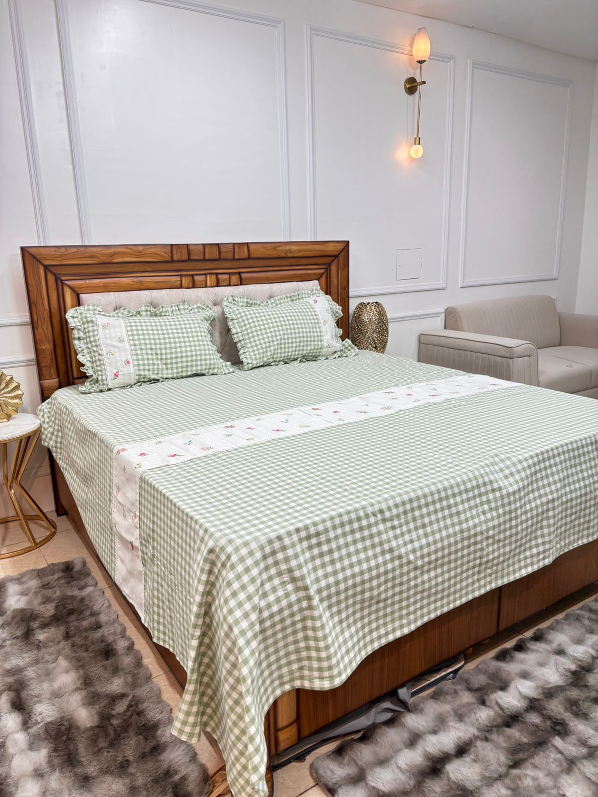 Add a refreshing charm to your bedroom with this soothing green checks bedsheet. Designed with a soft gingham pattern and complemented by a delicate floral stripe in the center, it brings a perfect balance of simplicity and elegance πβ¨