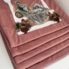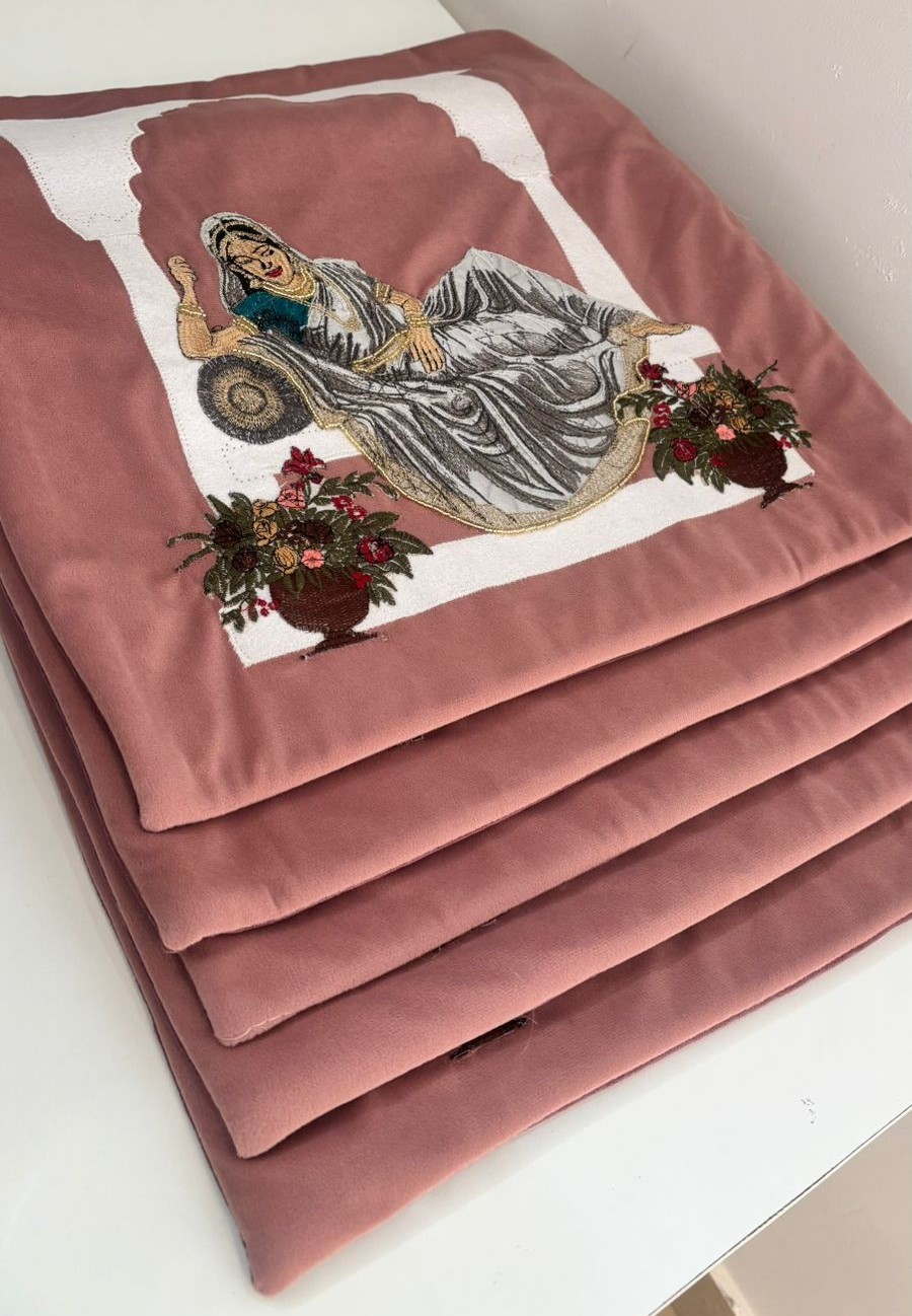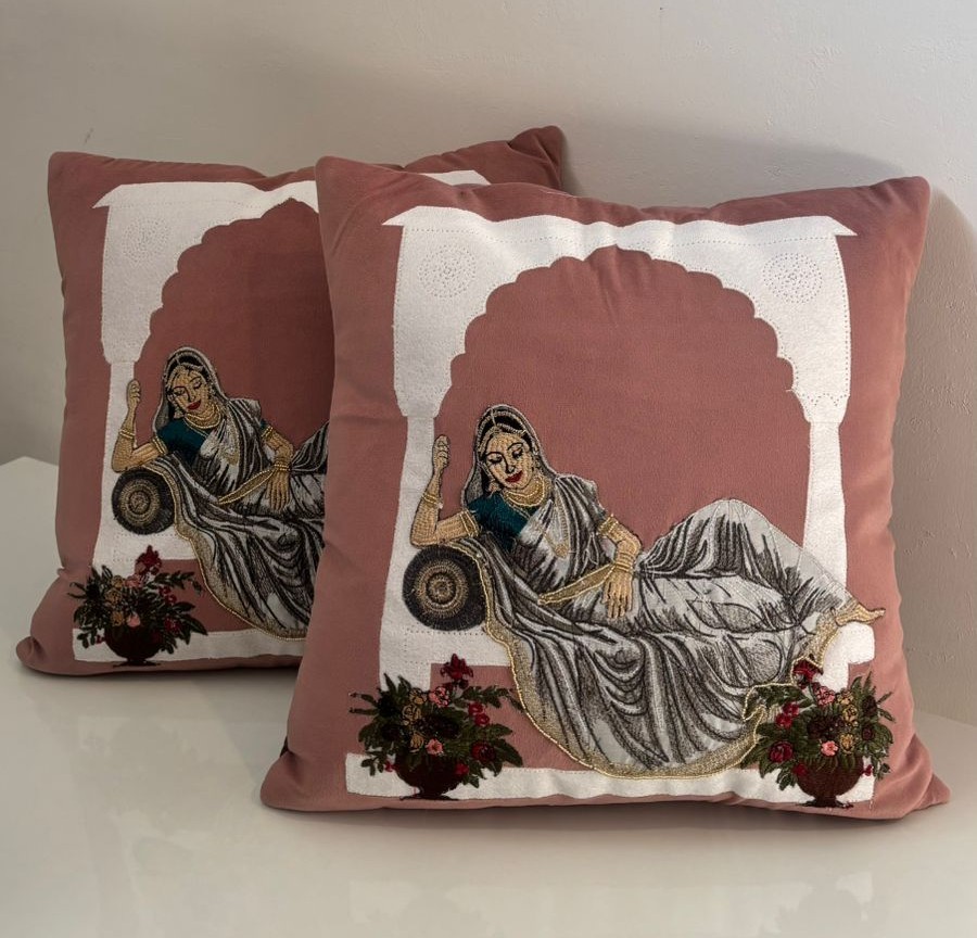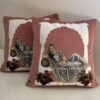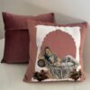 This elegant cushion cover features a graceful heritage-inspired artwork, beautifully embroidered on a soothing dusky rose (pink-brown) base. The detailed motif, framed with a soft ivory arch, adds a timeless and artistic charm to your living space.