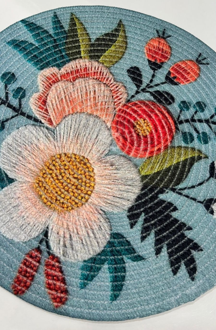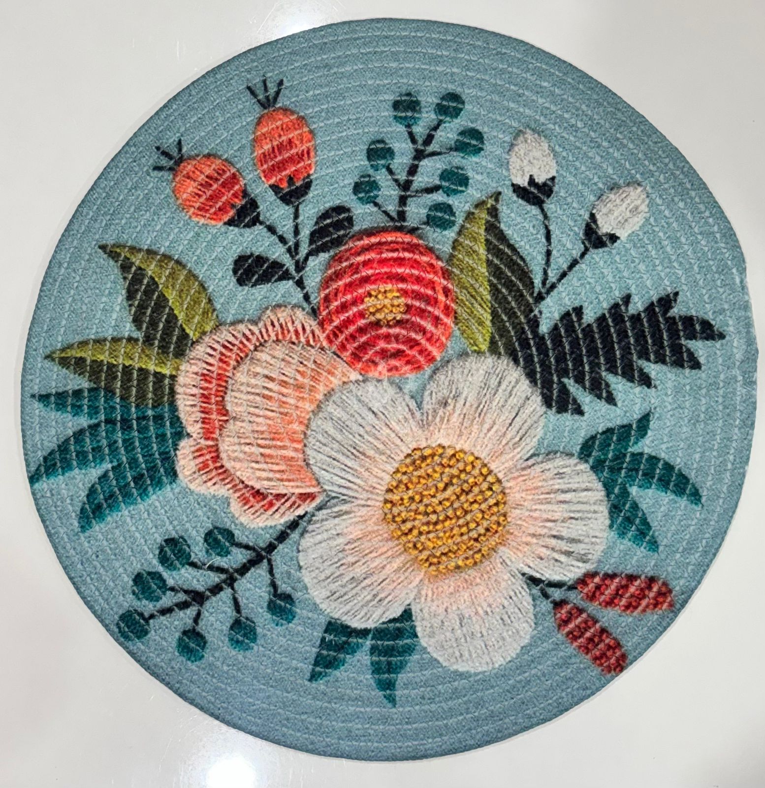 Bring the beauty of a garden to your tabletop with this stunning round floral placemat. This mat combines a traditional braided foundation with elaborate, multi-colored embroidery, creating a functional piece of art for your home.