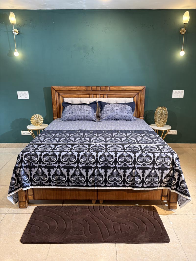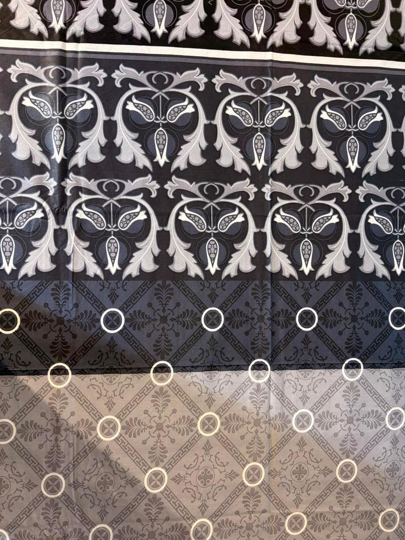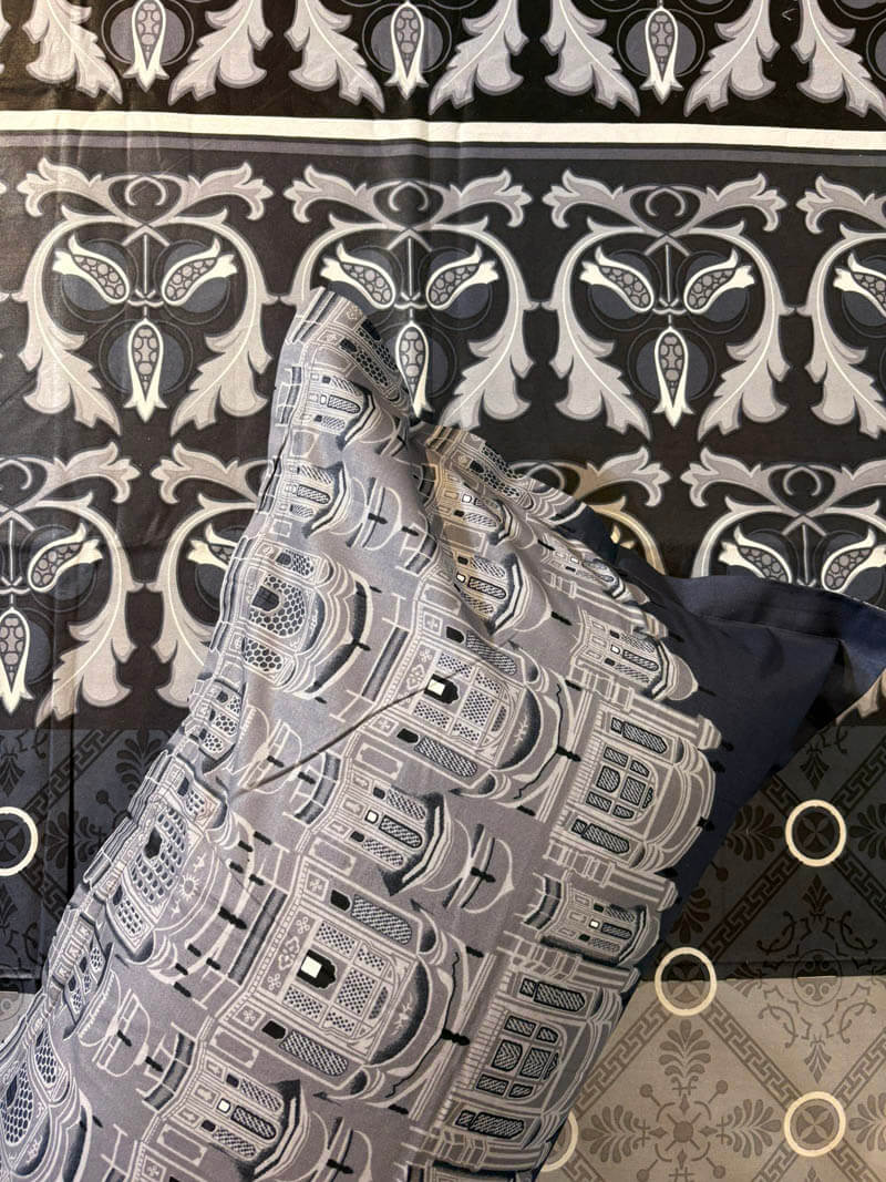 Bold and luxurious, this black and grey bedsheet features an ornate baroque-inspired floral design digitally printed on soft, breathable 100% cotton. A dramatic statement piece that adds depth and elegance to your king-size bed.