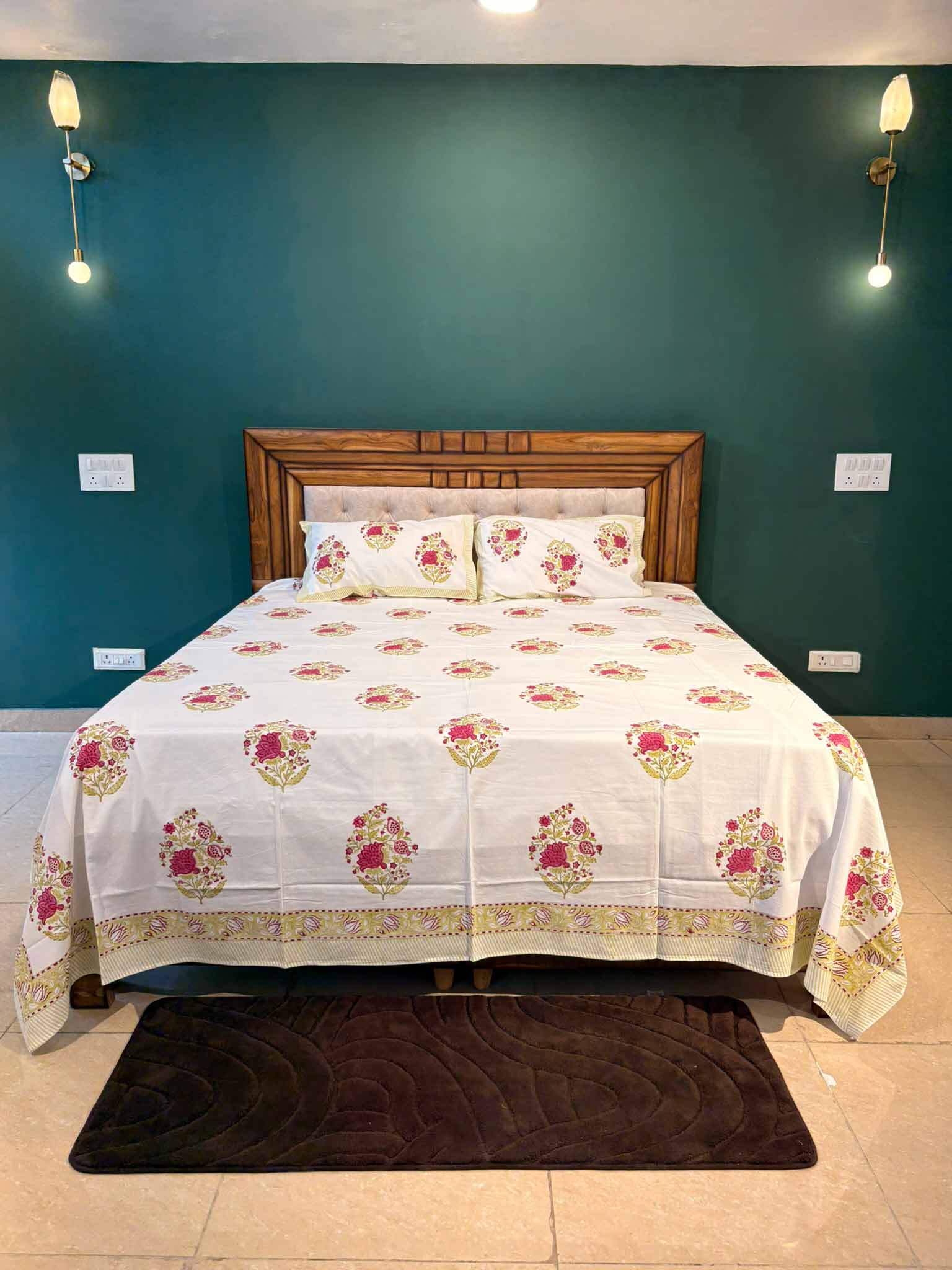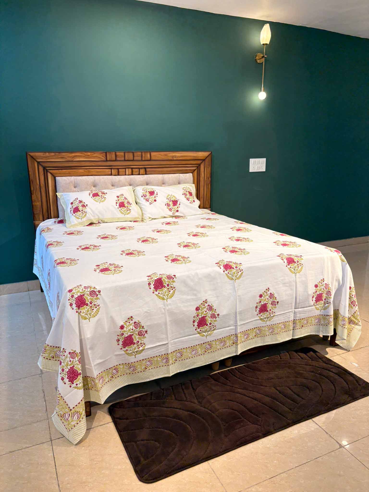 Delicate and charming, this Blush Bloom Buta bedsheet is hand block printed on soft, breathable 100 Percent cotton. A graceful, artisan-crafted choice for your king-size bed.