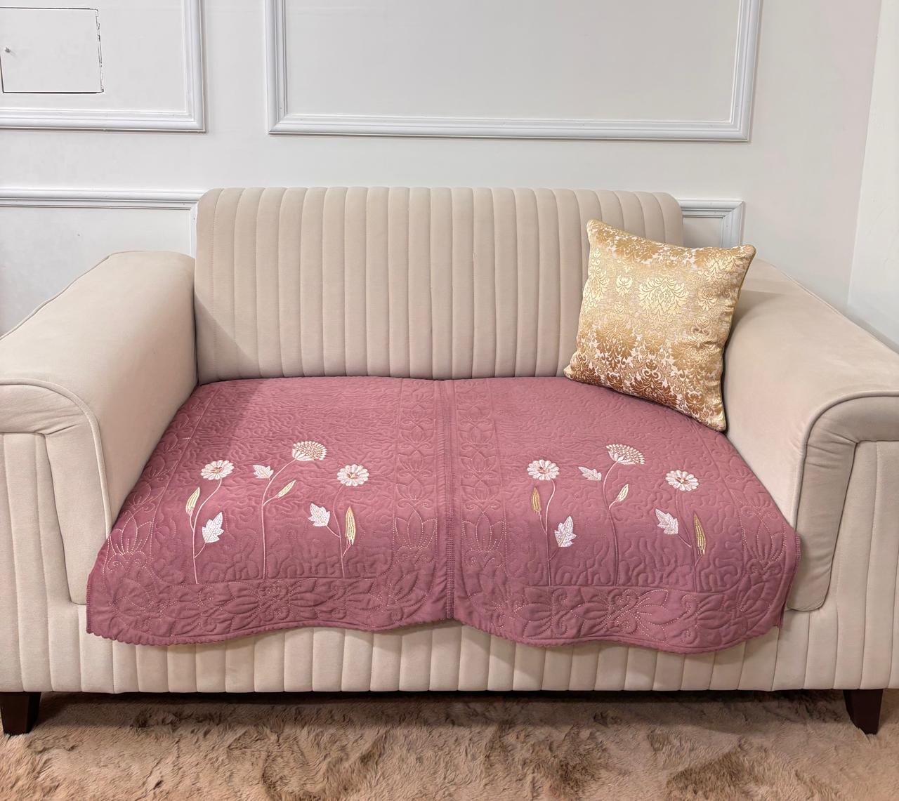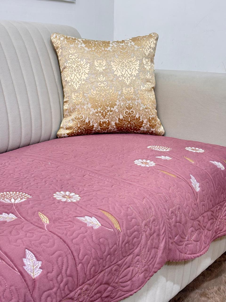 Add a soft, graceful charm to your living space with this beautiful blush pink sofa cover 🌸 Designed to bring warmth and elegance, this piece is perfect for creating a cozy yet luxurious vibe in your home.The delicate floral embroidery with subtle golden accents enhances its beauty, giving your sofa a refined and sophisticated look ✨ The quilted texture not only adds depth to the design but also provides a soft and comfortable seating experience.