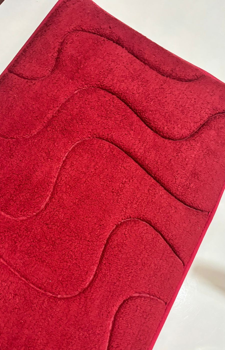 This elegant floor mat features a rich red tone with a smooth wave-inspired embossed design that adds depth and style to any space. Made with soft, plush fabric, it feels gentle underfoot while providing everyday comfort. The thick pile helps absorb moisture and dust, making it ideal for bedrooms, living areas, or near entrances.