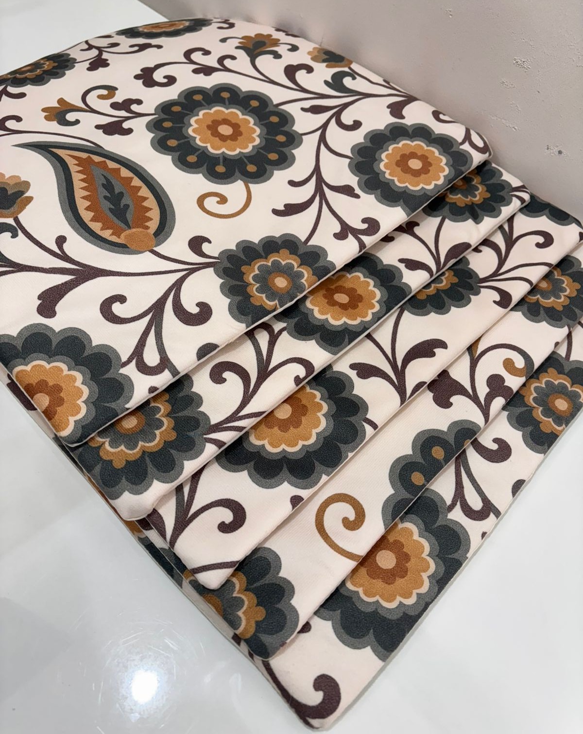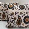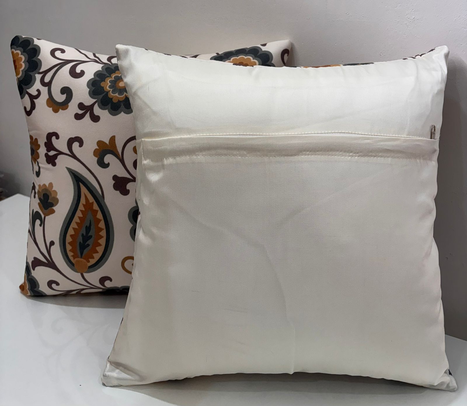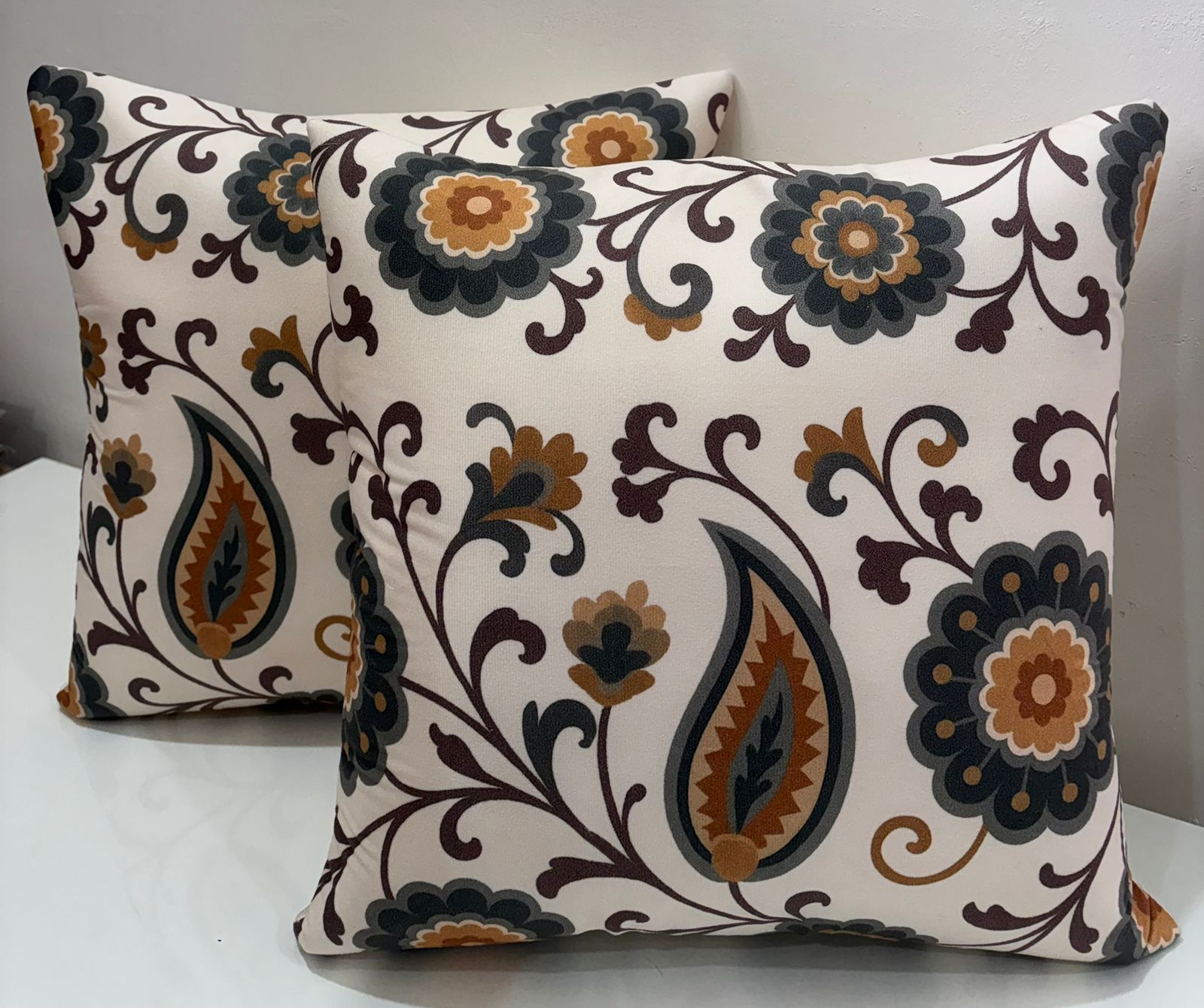 Elevate your home décor with this elegant cushion cover featuring a timeless floral and paisley pattern. Set on a soft ivory base, the design is highlighted with earthy tones of brown, mustard, and deep grey, creating a warm and sophisticated look. The flowing vines and floral motifs add a graceful touch, making it perfect for sofas, beds, or lounge seating. Ideal for both traditional and contemporary interiors.