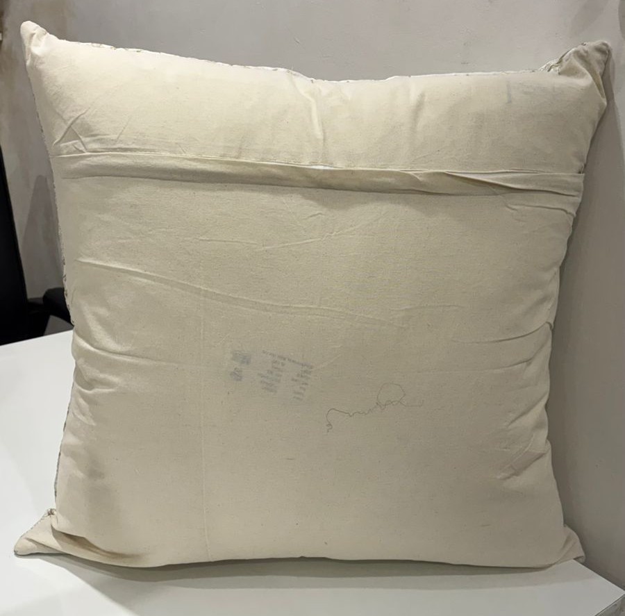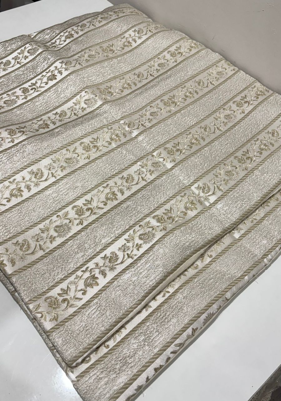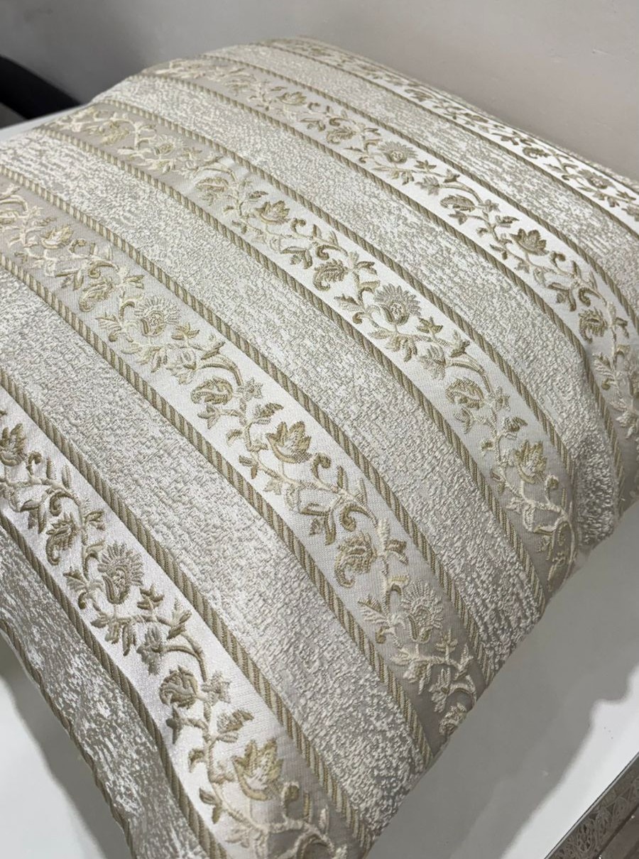 Enhance your home décor with this timeless cushion cover featuring graceful horizontal floral stripes. Designed in soothing ivory and beige tones, the cushion showcases delicately woven floral vine patterns that bring a refined, traditional elegance to any space. The textured base fabric adds depth and richness, while the symmetrical stripe layout creates a balanced and sophisticated look.