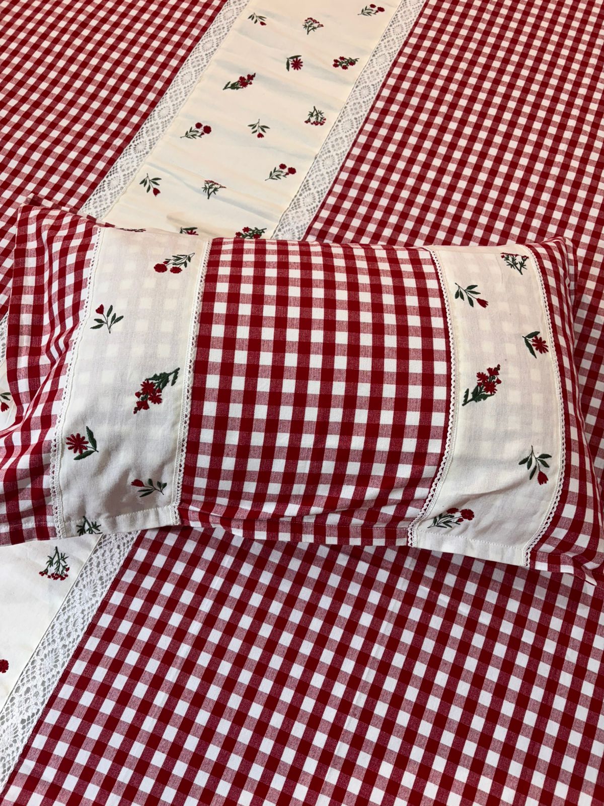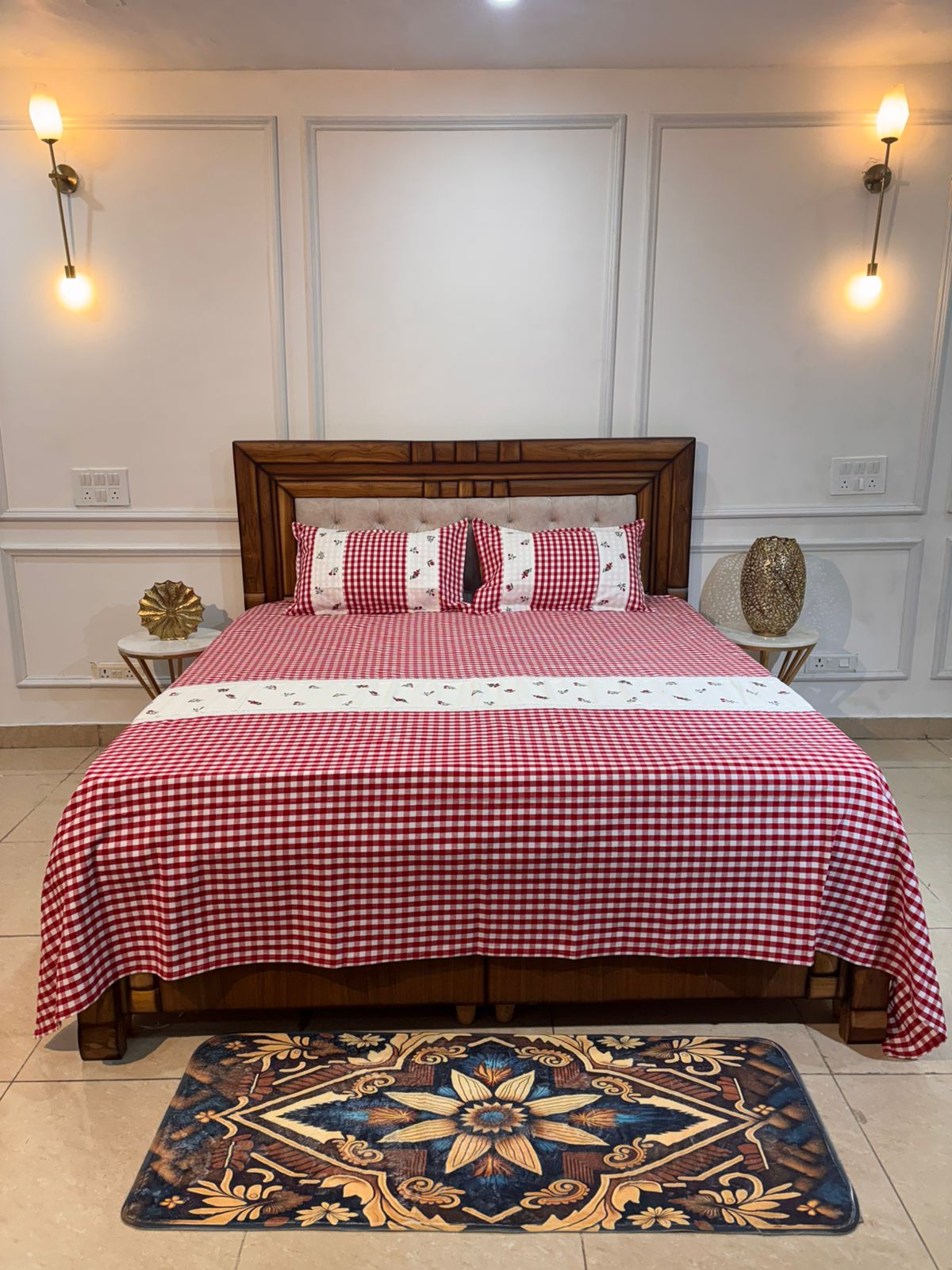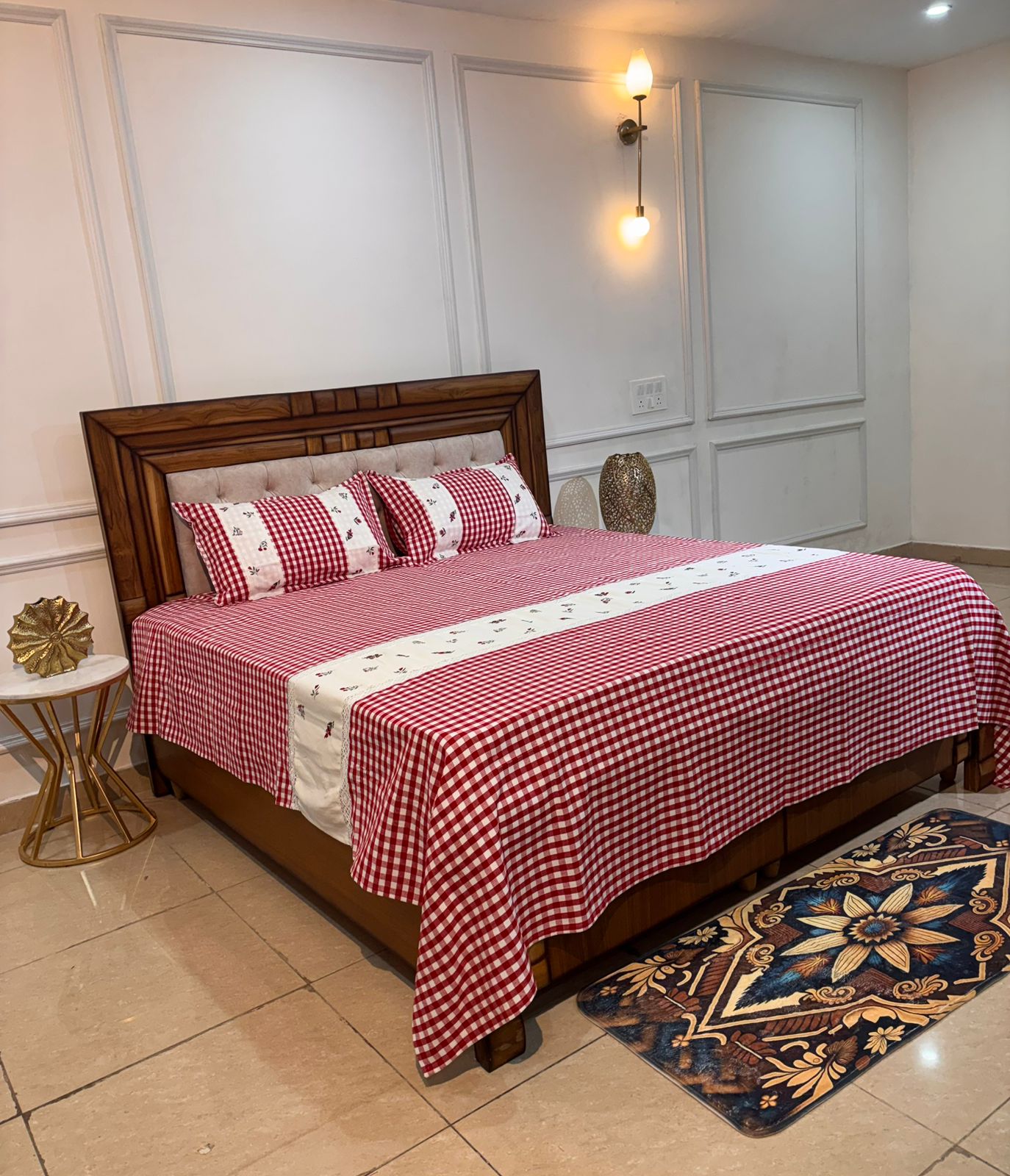 Bring timeless charm to your bedroom with this red and white checkered bedsheet set, inspired by classic gingham patterns. The bold yet balanced checks create a warm, inviting look, while the contrasting white band with subtle motifs adds a touch of elegance and visual interest.