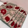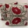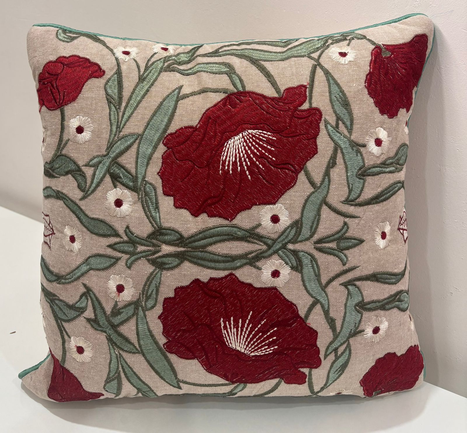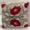 Make a bold yet elegant statement with this richly embroidered cushion cover. Featuring deep crimson floral motifs intertwined with soft green vines, the design feels artistic and timeless. Set against a warm neutral base, the detailed embroidery adds texture, depth, and handcrafted charm.