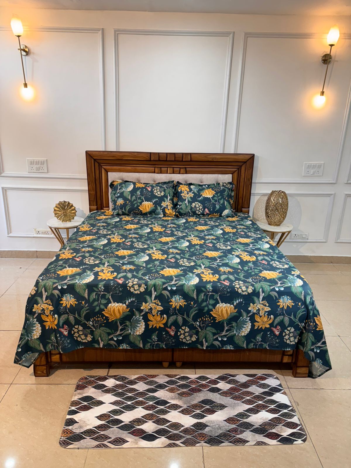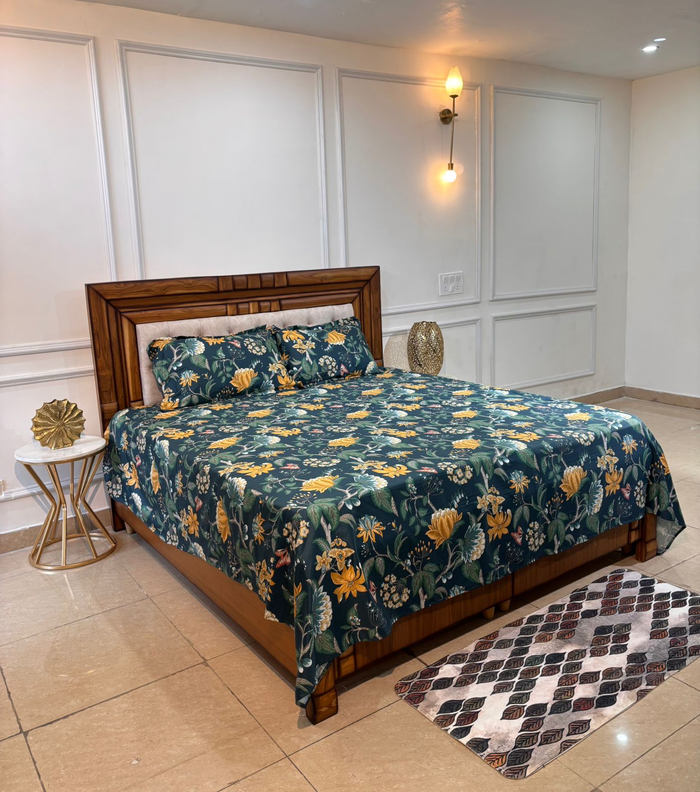 Elevate your bedroom décor with this rich dark green floral bedsheet set, beautifully highlighted with mustard yellow and soft leafy tones. The elegant botanical print creates a refreshing yet luxurious look, perfect for modern and classic interiors alike.
