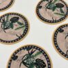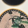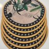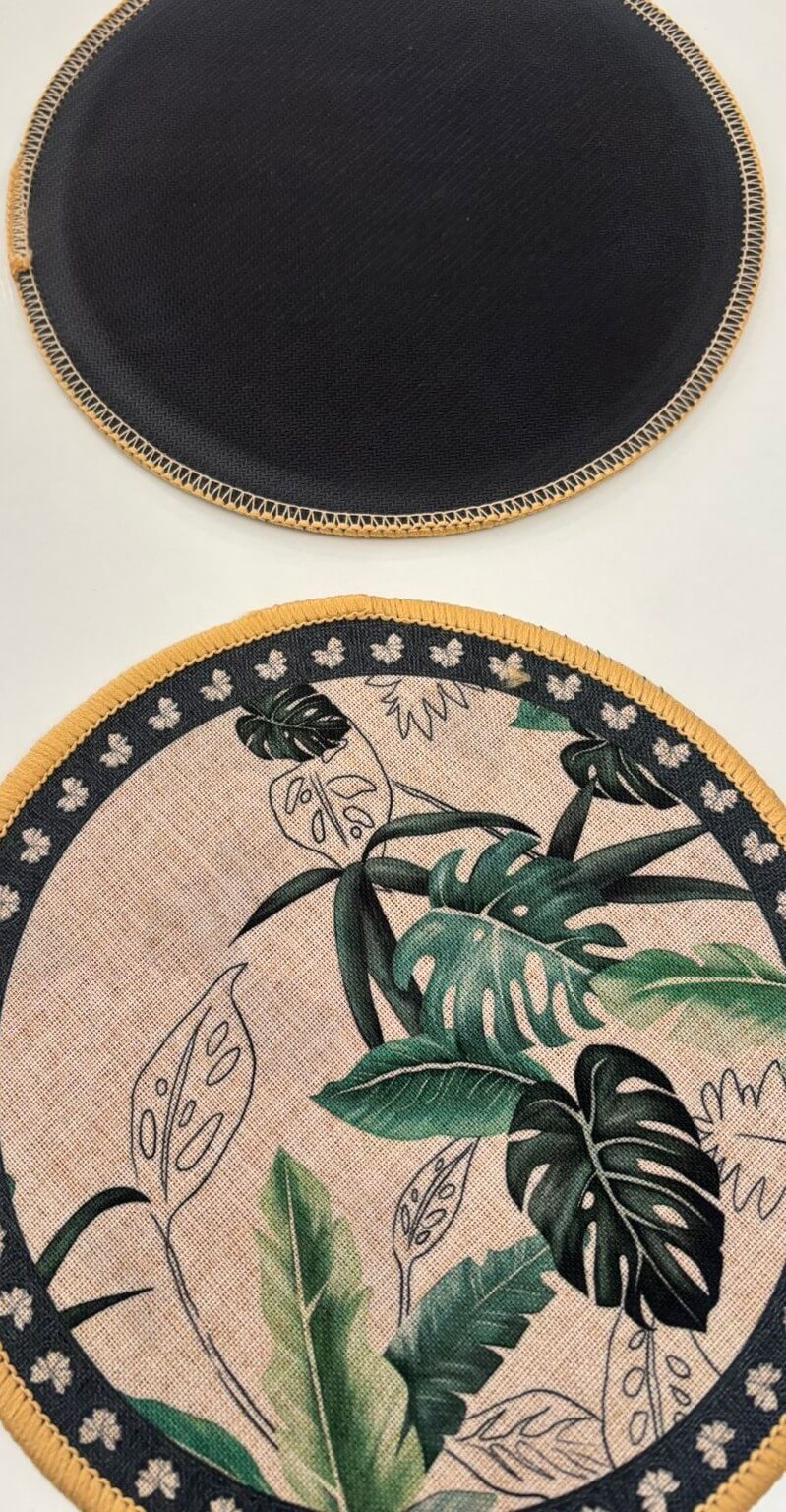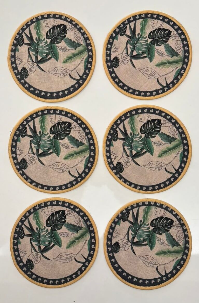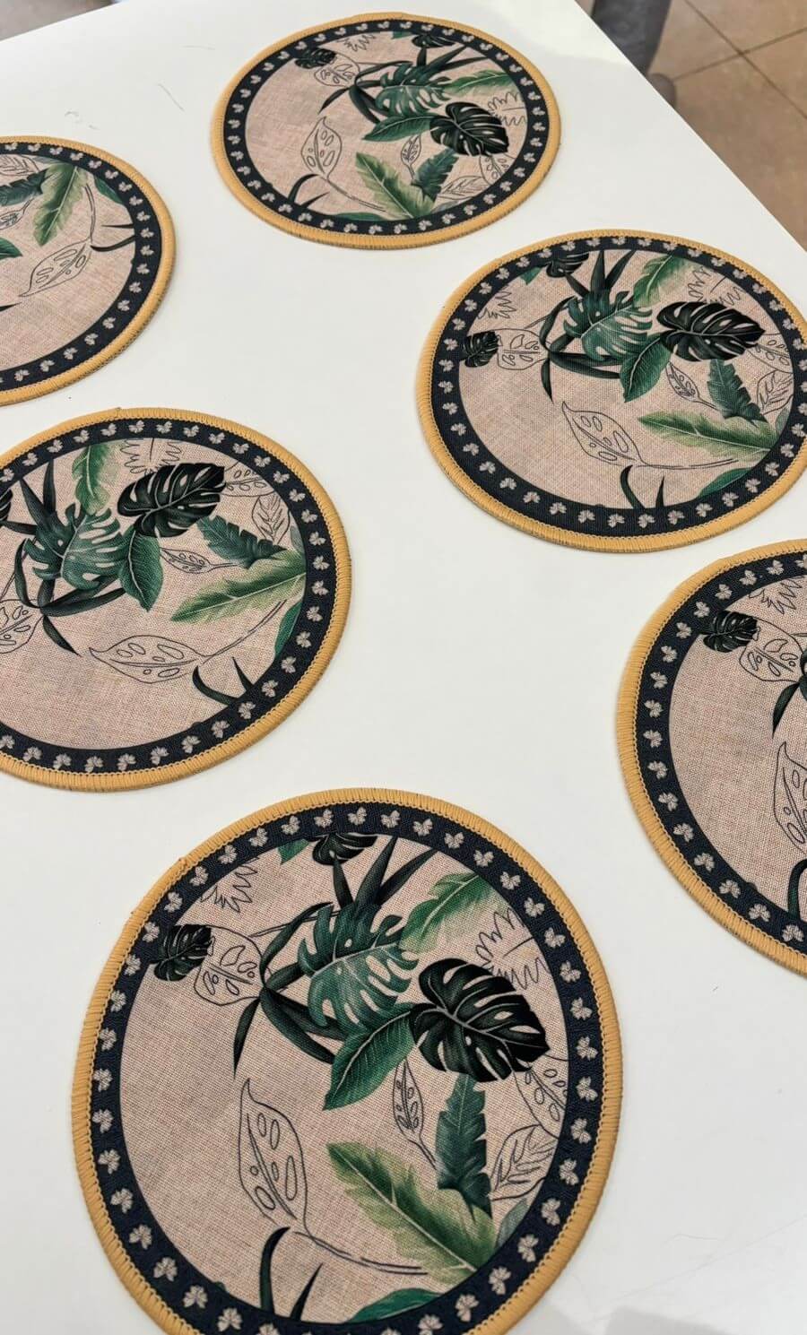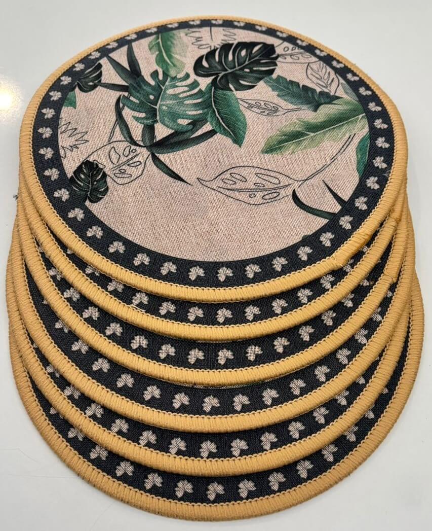Round fabric table mats featuring a tropical leaf print center, decorative patterned border, and sturdy golden edging. Made from durable cotton/poly-cotton blend fabric—ideal for dining tables, tea settings, or home décor.”