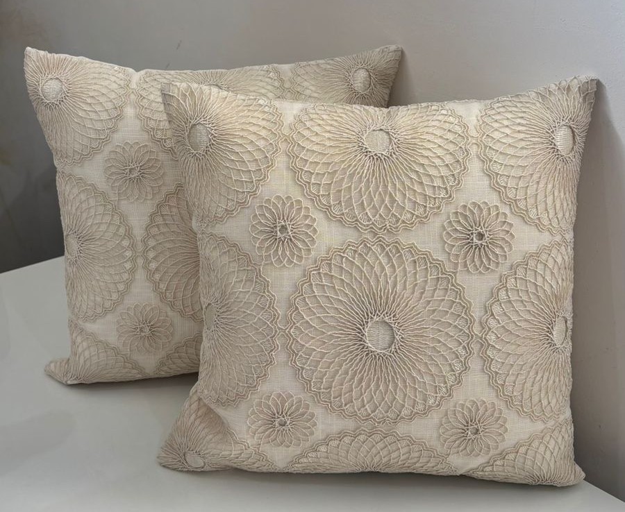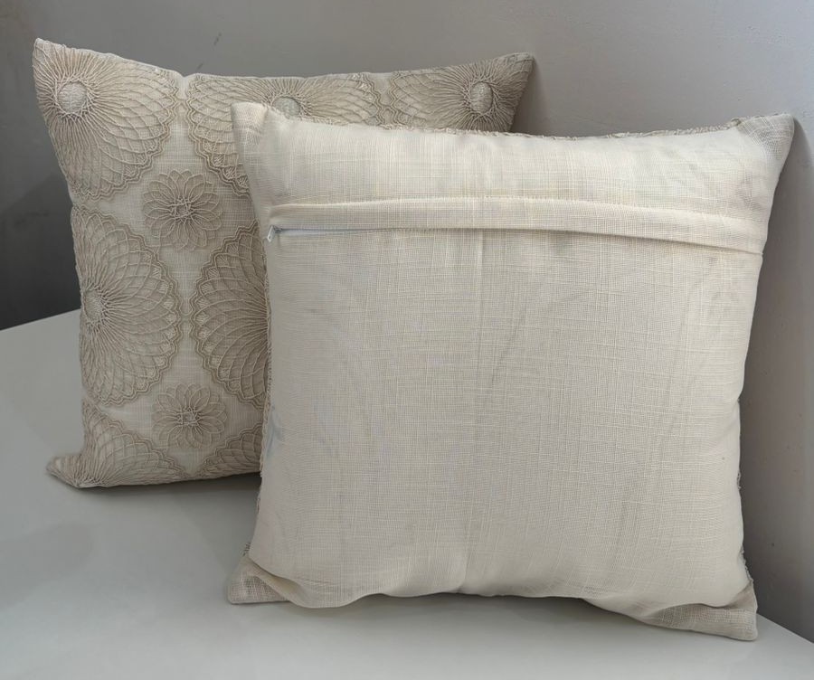 Add a refined and luxurious touch to your home décor with this beautifully embroidered cushion cover. Featuring an intricate all-over floral medallion embroidery pattern in soft ivory tones, it creates a rich textured surface with timeless appeal. The detailed embroidery sits on a sturdy upholstery base, giving the cushion a premium look while ensuring durability and shape retention. Perfect for sofas, beds, and accent chairs, this cushion cover blends seamlessly with modern, classic, and luxury interiors.