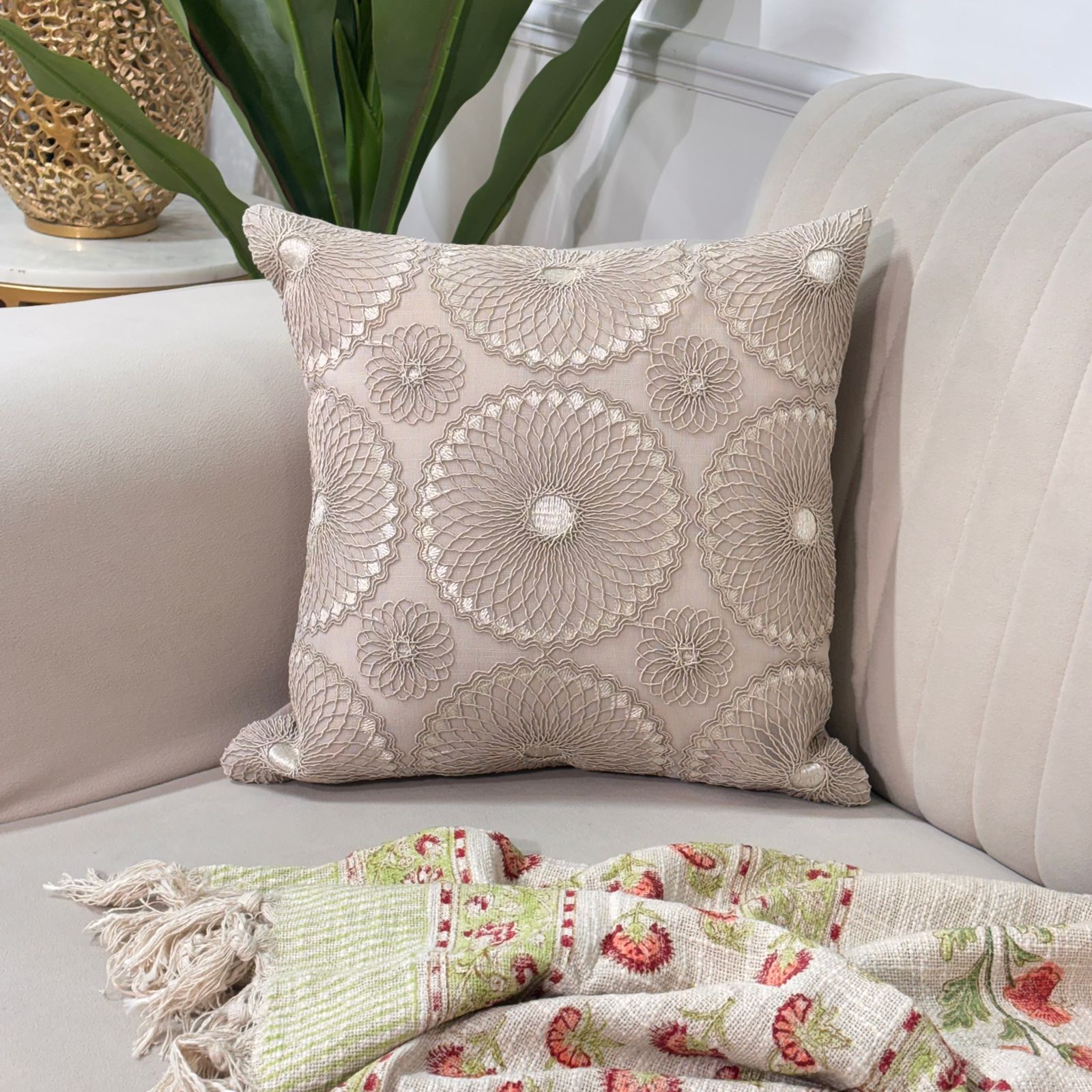Elegant Embroidered Geometric Floral Cushion Cover – Beige Taupe