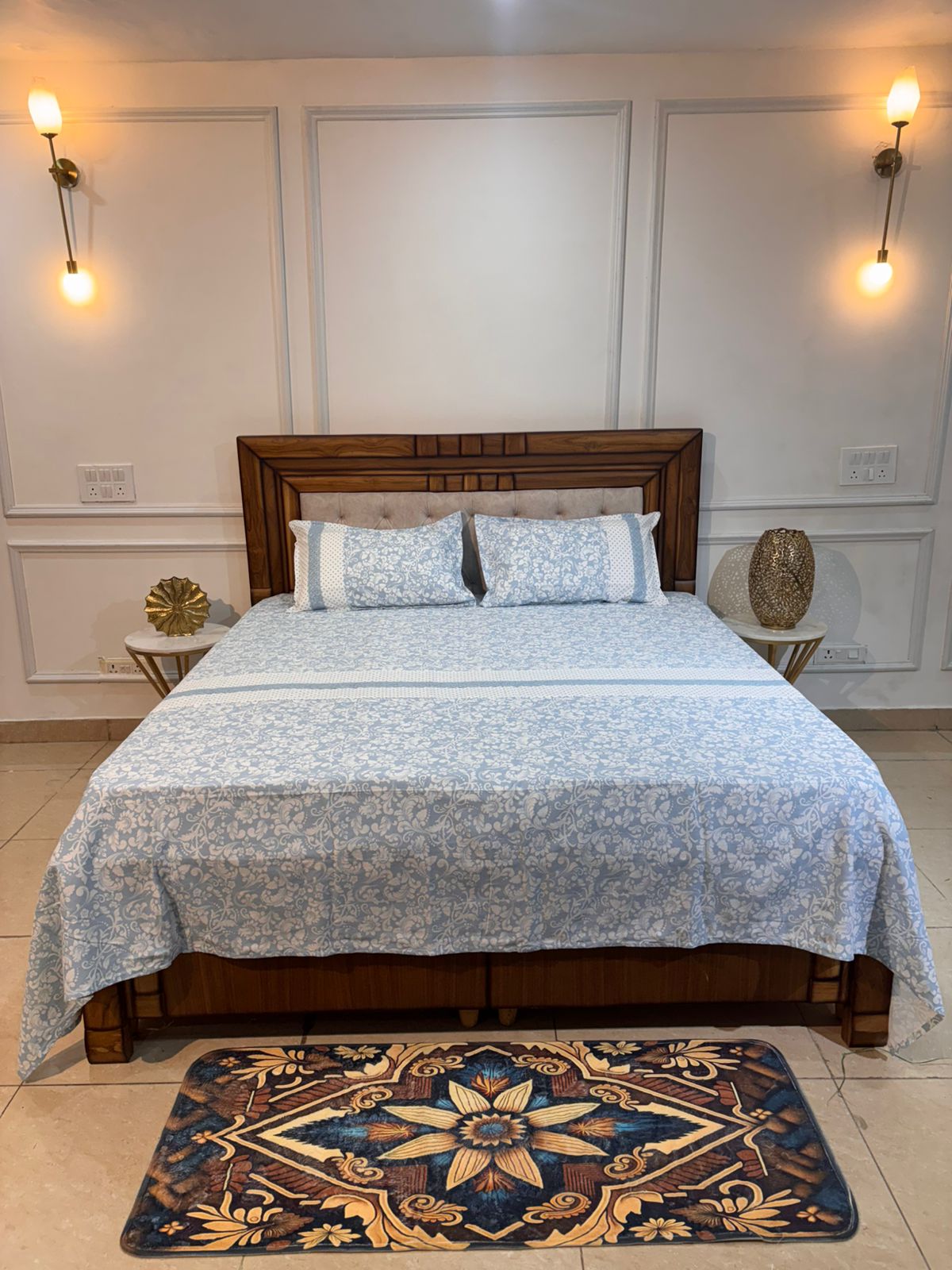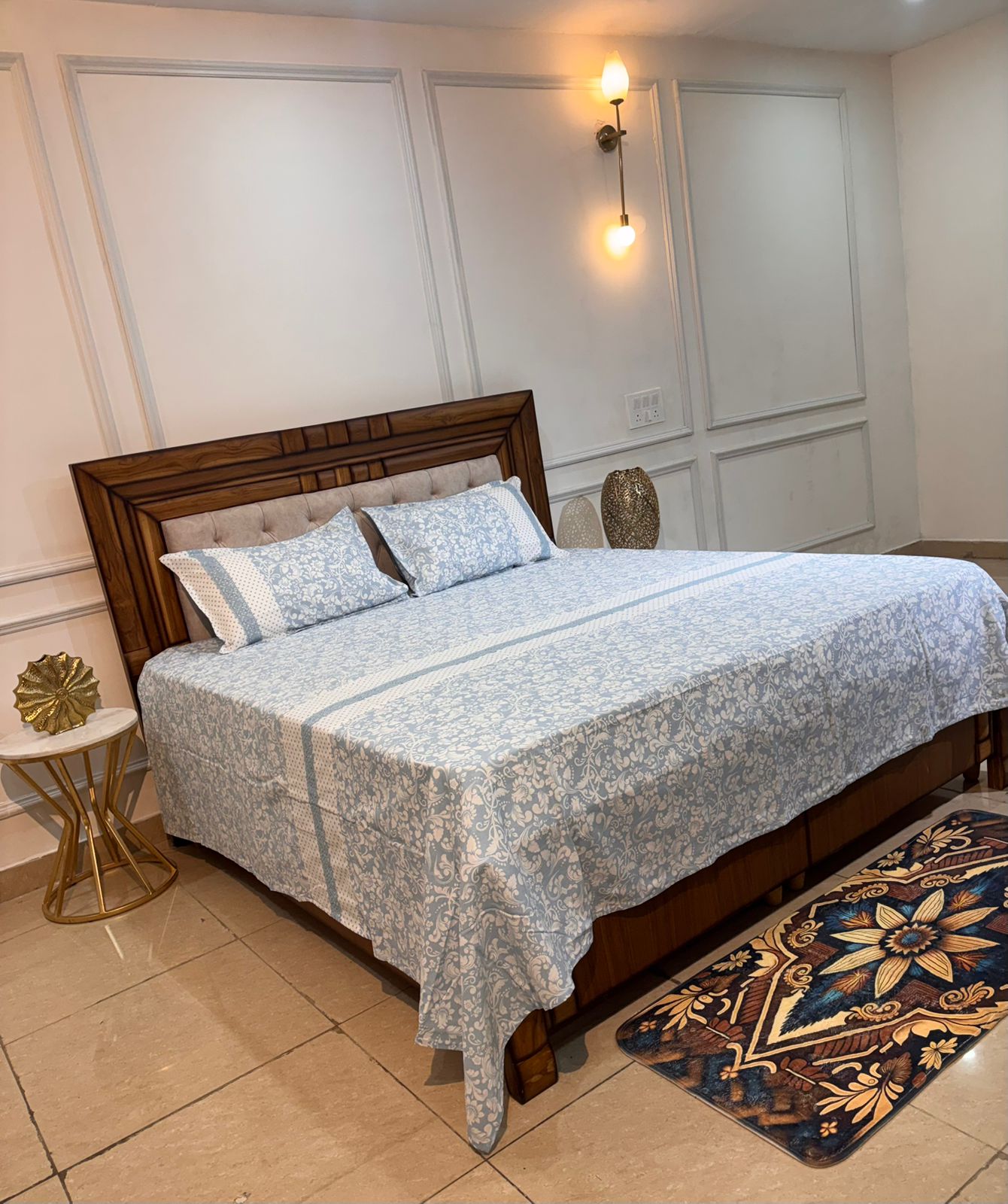 Bring calm elegance to your bedroom with this beautifully designed sky blue and white floral bedsheet set. Featuring delicate traditional floral motifs, this bedsheet adds a fresh, airy charm while maintaining a classy look. The soothing blue base paired with crisp white patterns creates a peaceful and inviting sleeping space.
