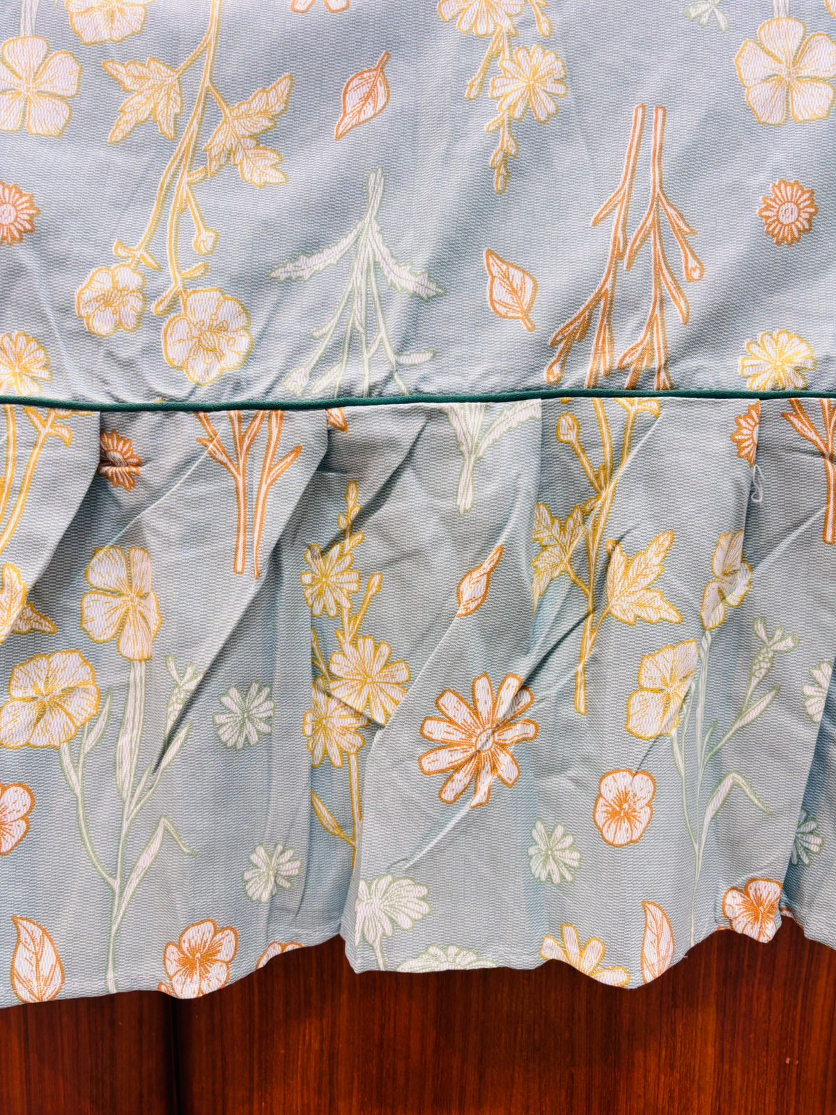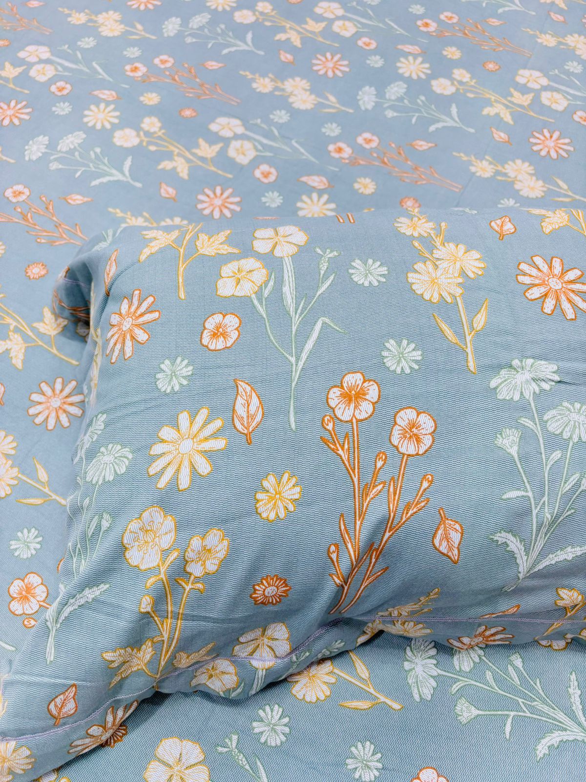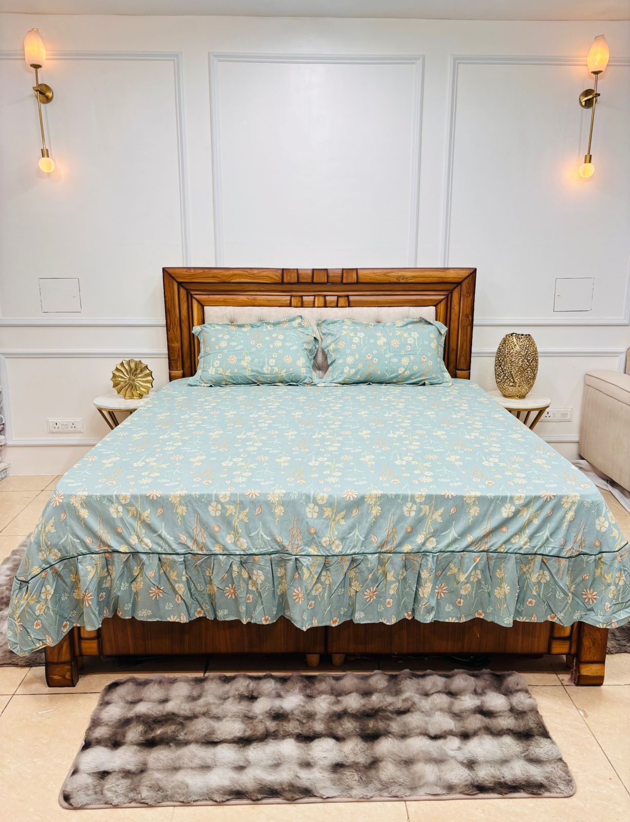 This beautiful pastel blue floral bedsheet with frill detailing is designed to create a soothing and stylish vibe. The delicate flower print paired with a graceful frill border adds a touch of luxury to your everyday bedding 😍