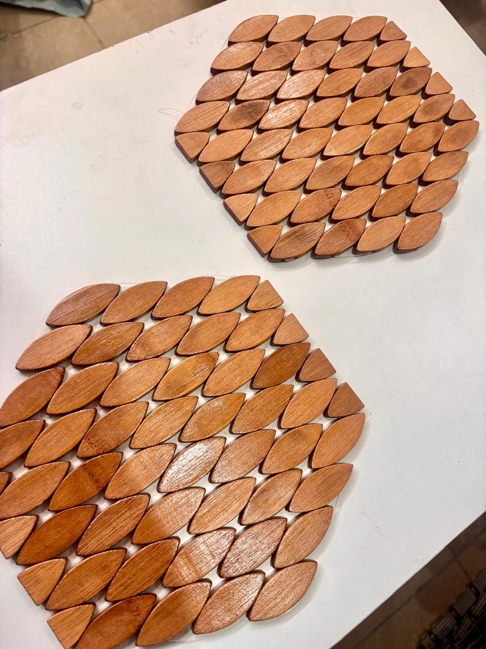 Enhance your dining table with this beautifully crafted hexagon wooden table mat featuring a stylish layered leaf pattern. Designed with smooth, polished wooden pieces arranged in a honeycomb-style hexagon shape, this mat adds a modern yet natural touch to your table setting.