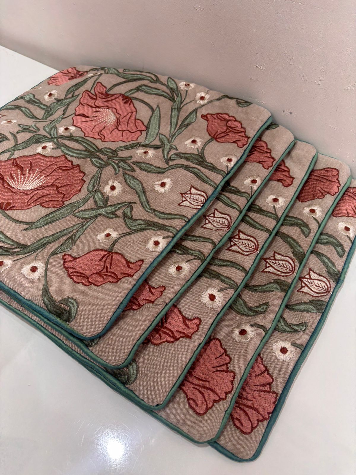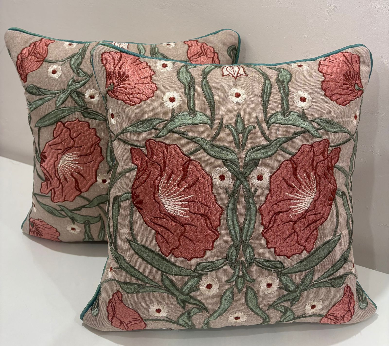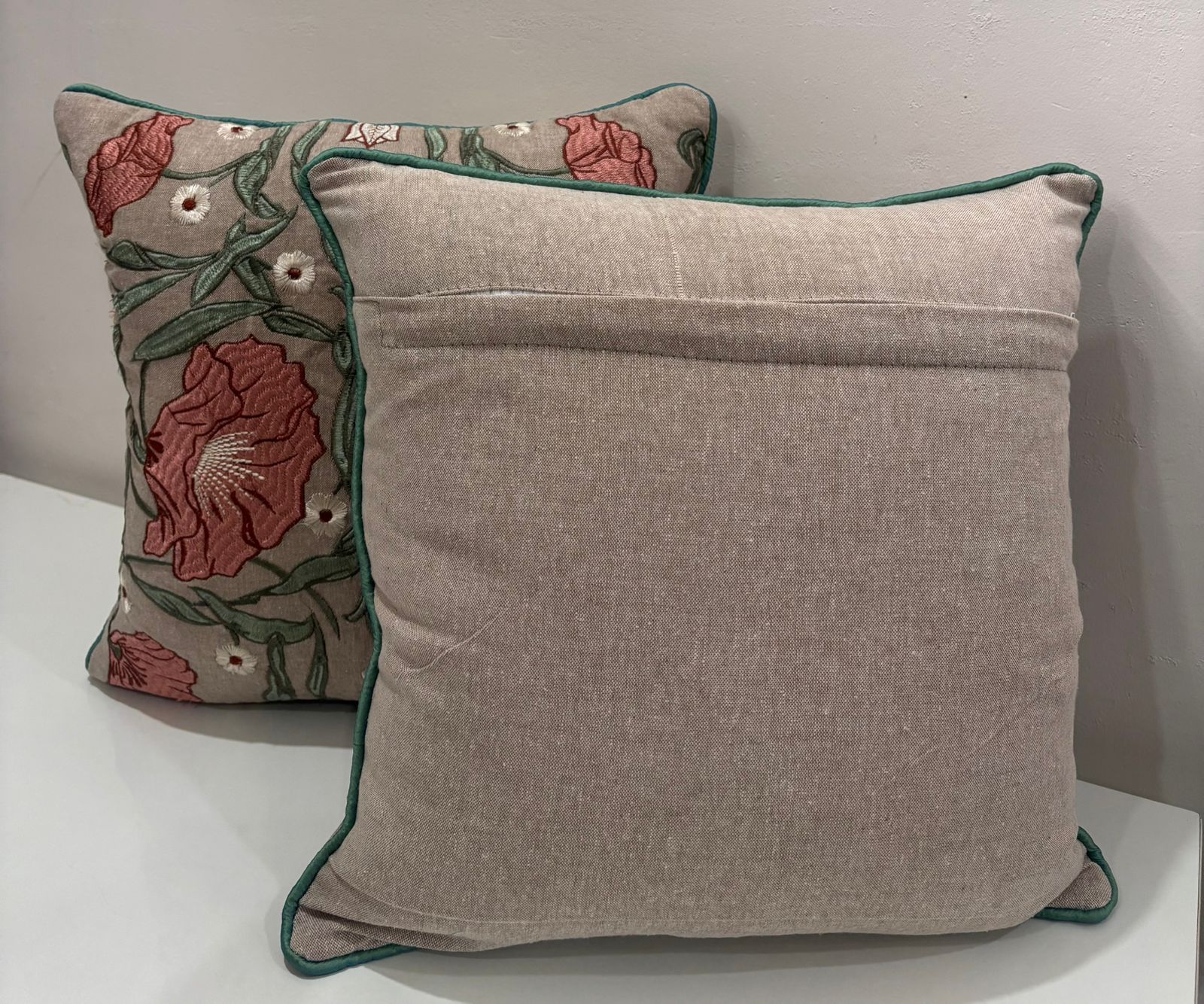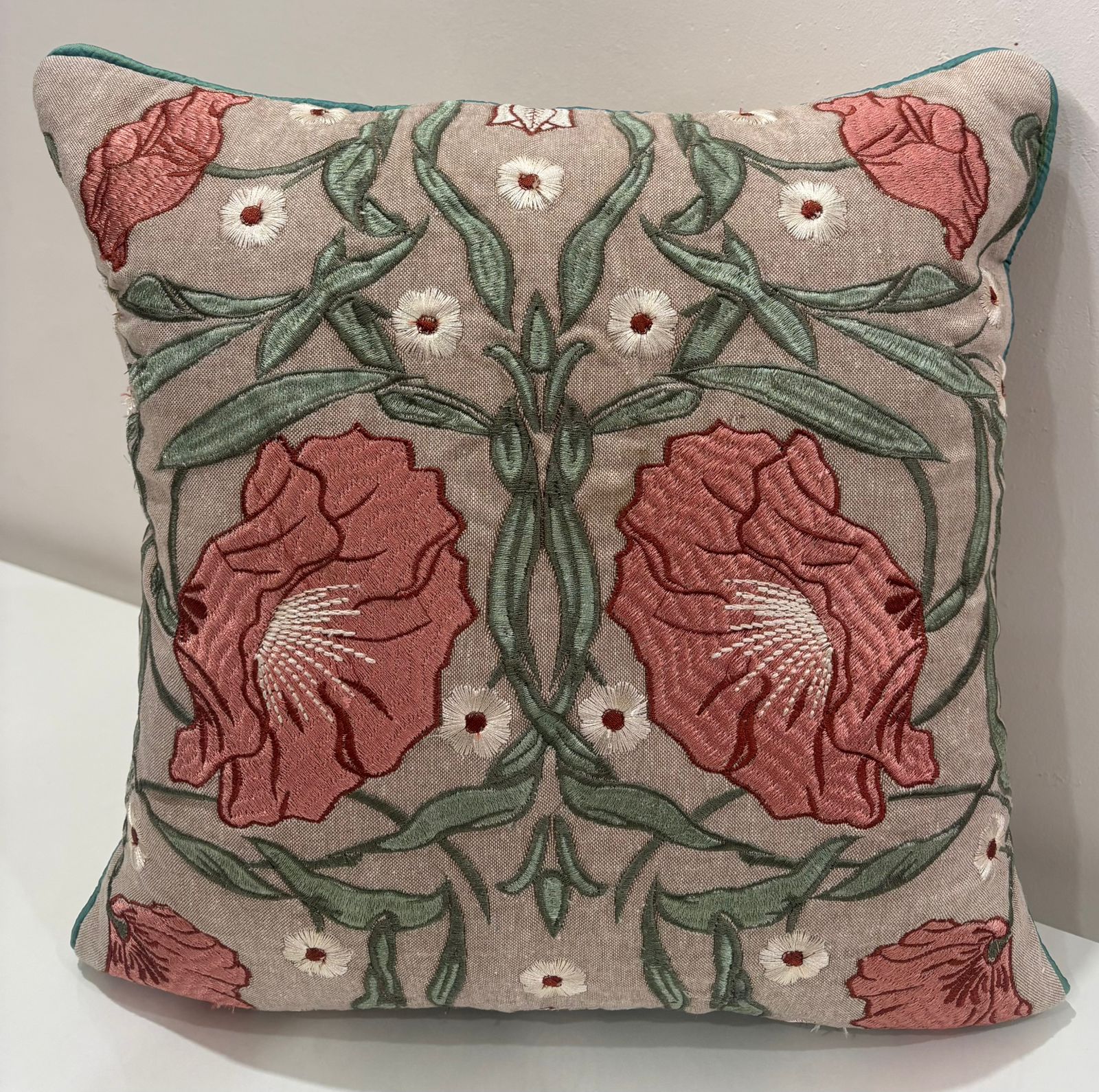 Enhance your living space with the warm charm of this beautifully embroidered cushion cover. Set on a soft neutral base, the rich rose-pink floral embroidery paired with subtle green detailing creates a refined and graceful look.
