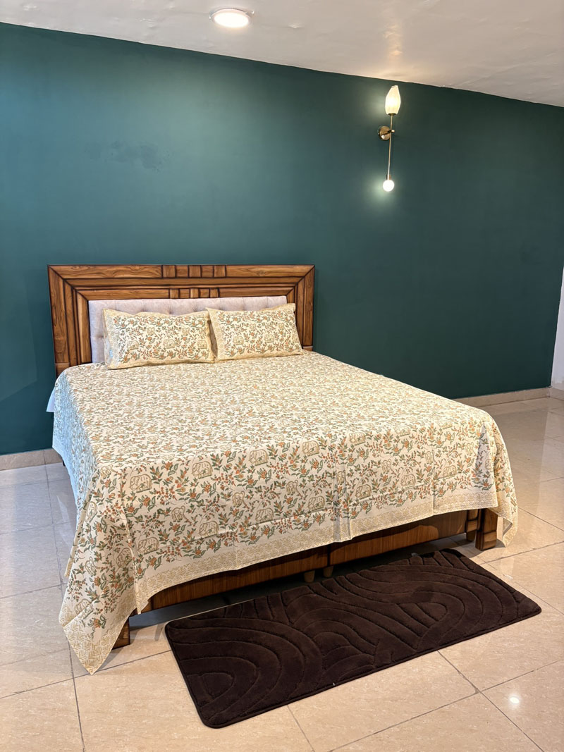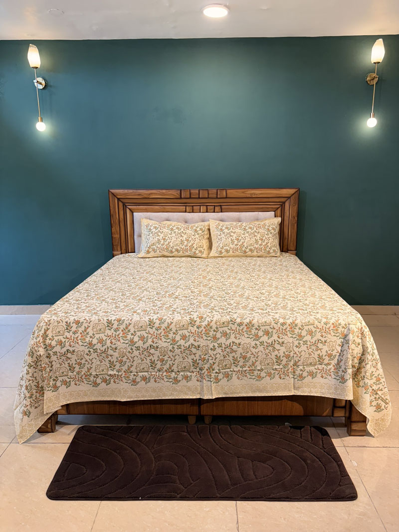 Elegant and earthy, this Elephant Garden bedsheet showcases a charming hand block printed design with floral motifs and traditional elephants on soft, breathable 100 percent cotton. A perfect fusion of comfort and heritage craftsmanship for your king-size bed.