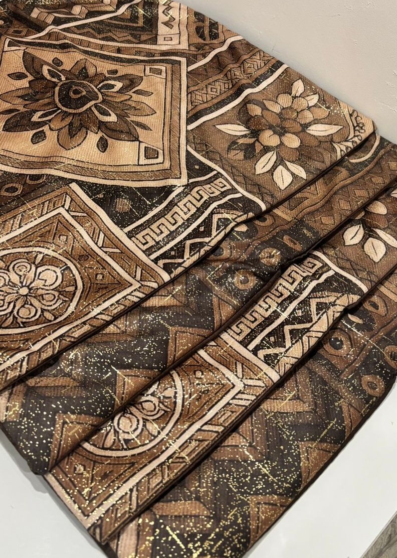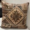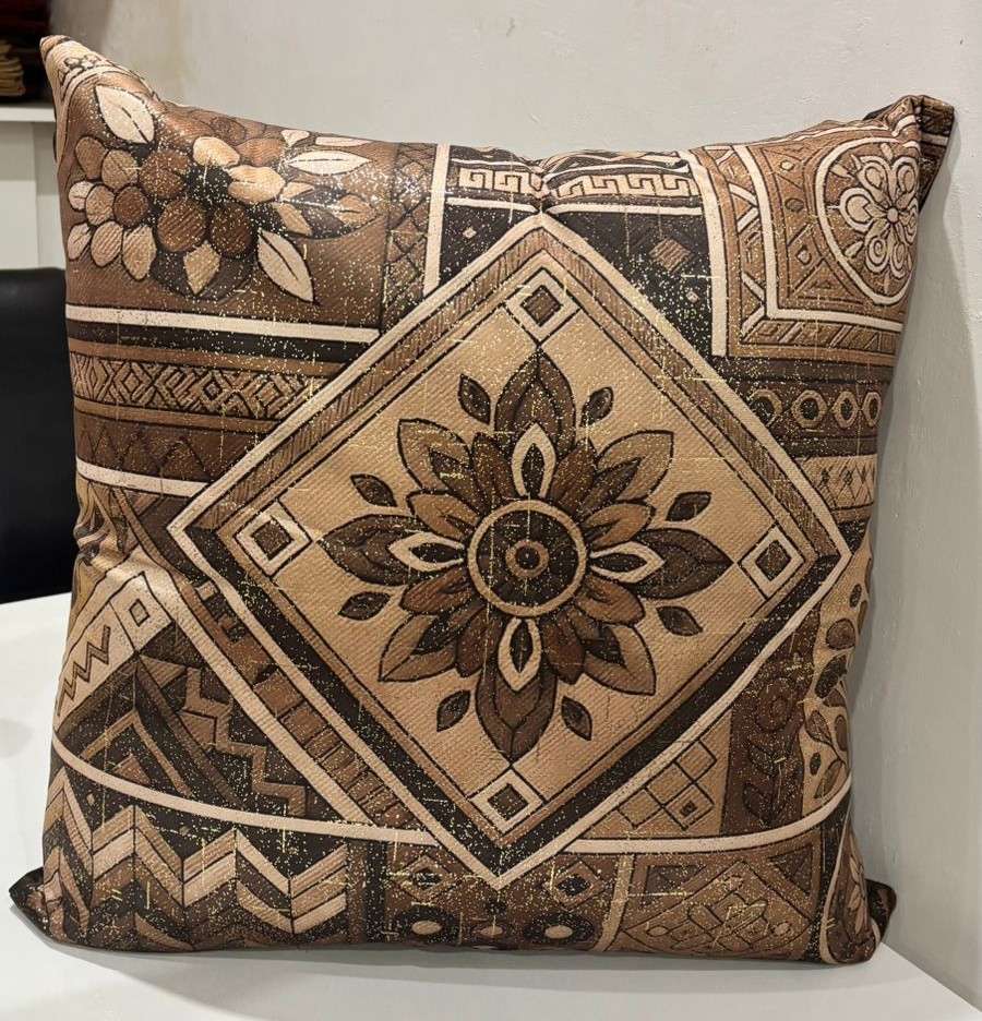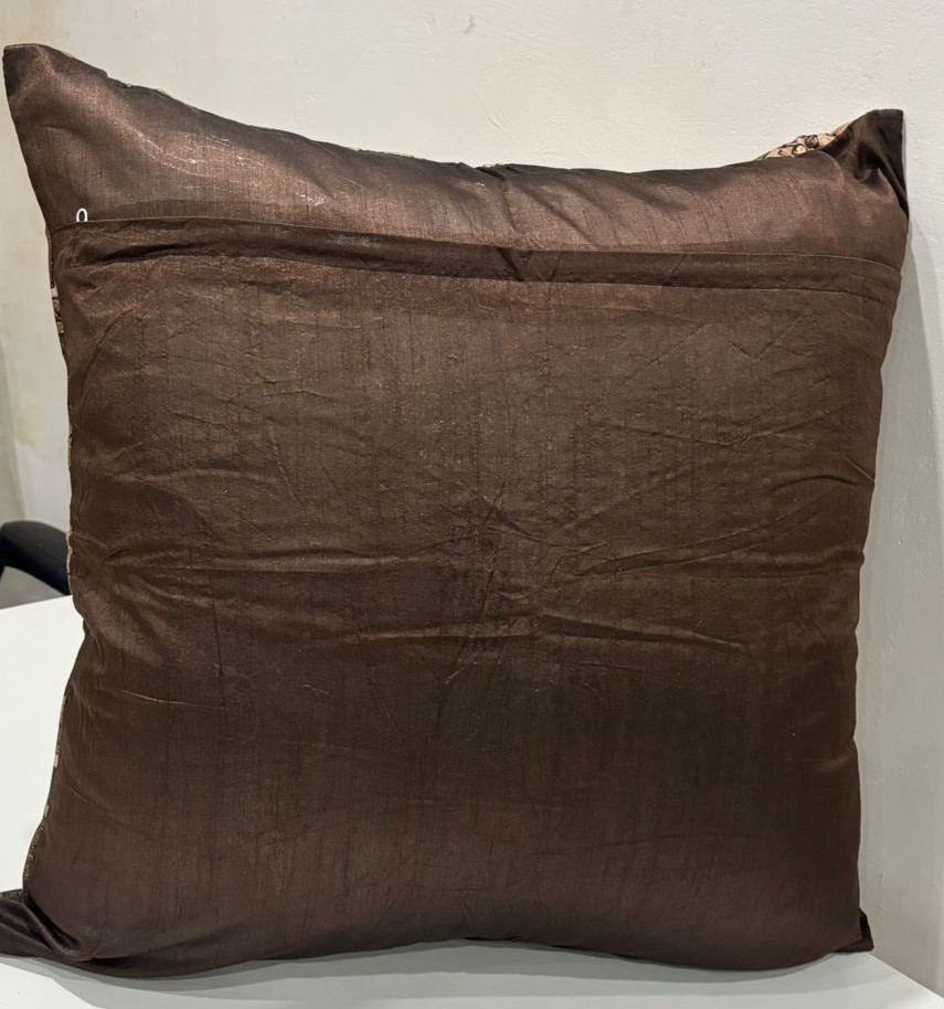 Bring an artistic and handcrafted feel to your space with this striking cushion cover featuring a bold geometric floral design. The central diamond-shaped motif is beautifully detailed with layered floral elements, surrounded by intricate ethnic and tribal-inspired patterns. Rich shades of brown, beige, and black blend harmoniously to create a warm, earthy palette that adds depth and character to your décor.