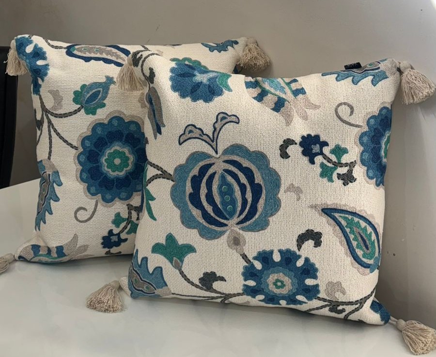 Bring timeless charm to your home décor with this beautifully crafted cushion cover featuring a graceful floral pattern in soothing shades of blue, teal, and grey. Made from premium cotton-blend fabric with a subtle handloom texture, it offers a natural, breathable feel and a refined look. The delicate tassels on each corner add a touch of artisanal elegance, making it perfect for sofas, beds, and cozy seating spaces. Ideal for both modern and classic interiors, this cushion cover effortlessly enhances your décor with comfort and style.
