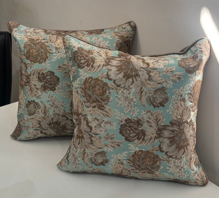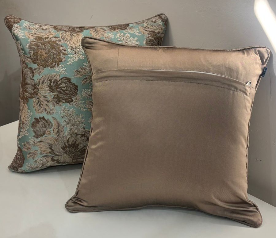 Elevate your home décor with this elegant cushion cover crafted from premium jacquard upholstery fabric. Featuring a beautifully woven floral pattern in warm beige tones over a soothing teal base, the design offers rich texture and depth. The jacquard weave gives a soft suede-touch feel while ensuring durability and long-lasting shape. Finished with neat edge piping for a refined look, this cushion cover is perfect for sofas, beds, and accent seating in both modern and classic interiors.