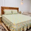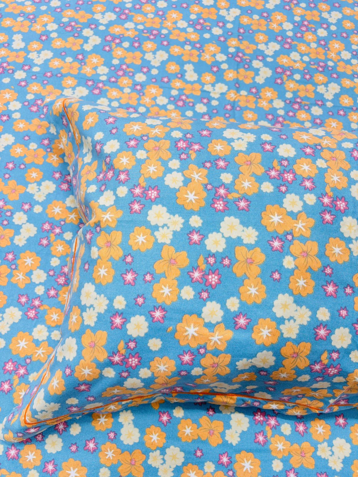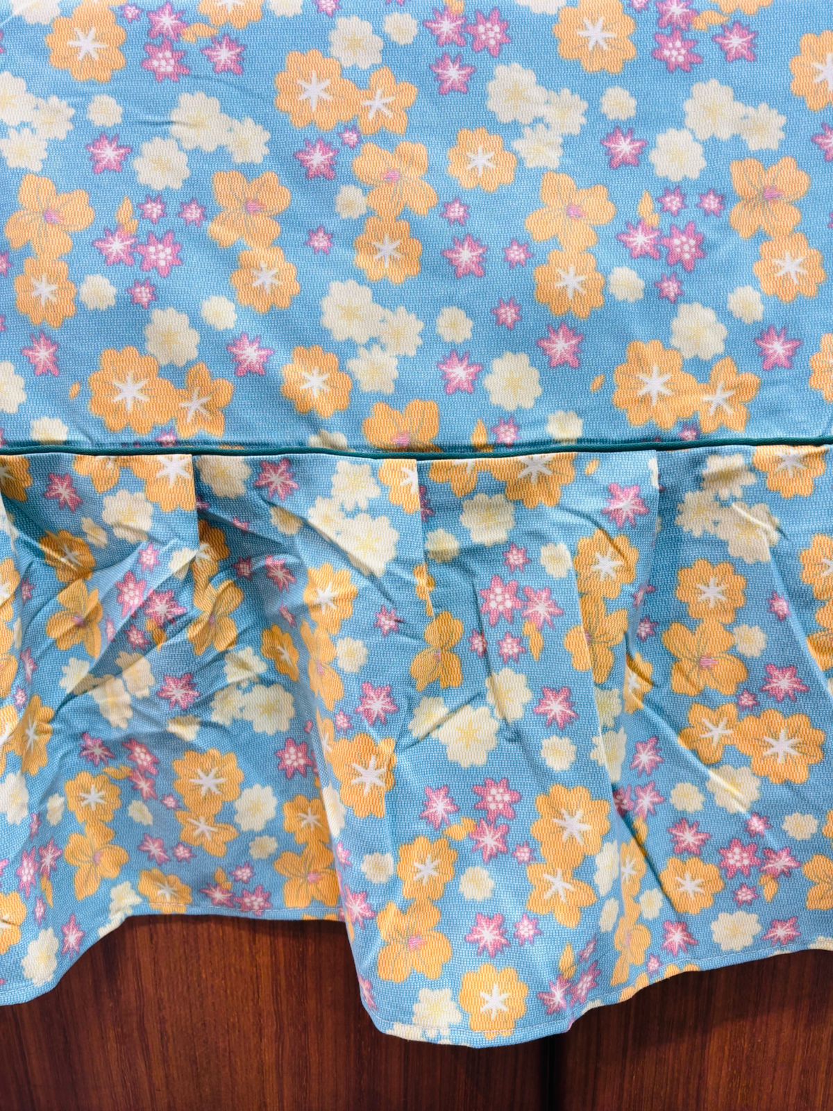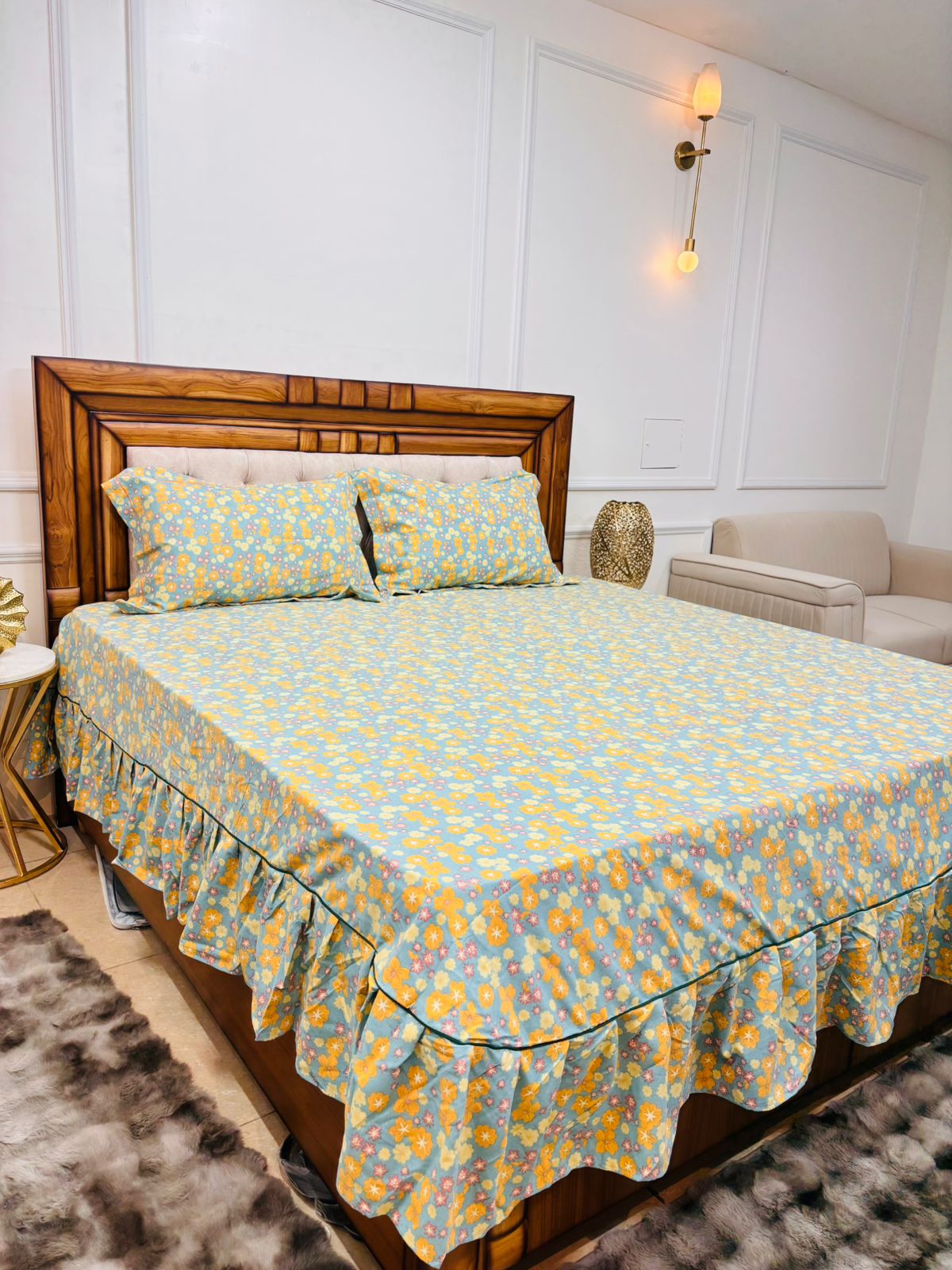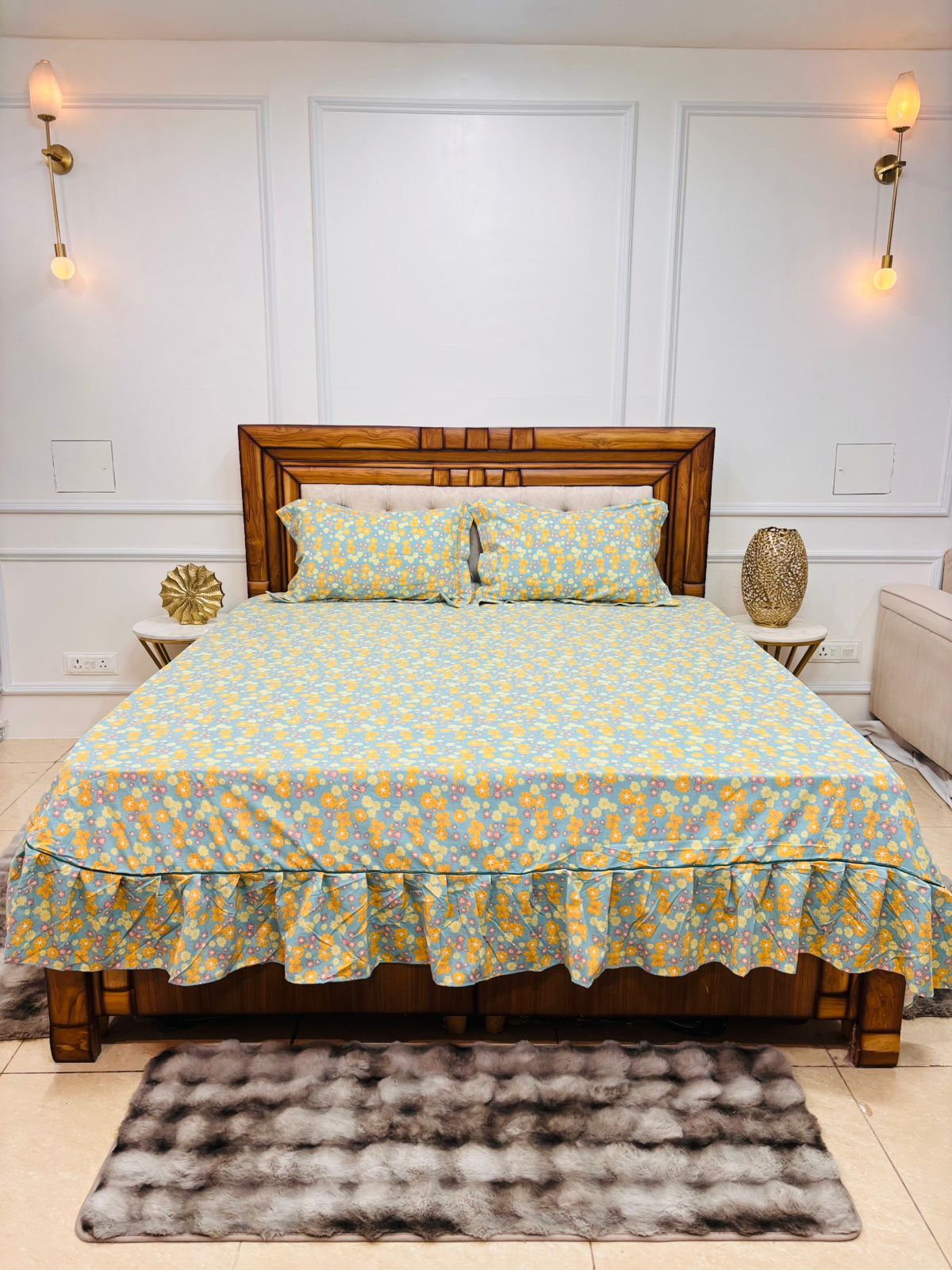 This blue floral frill bedsheet is designed to bring lively energy and soft comfort to your space. The vibrant yellow floral print on a soothing blue base creates a perfect balance of brightness and elegance π