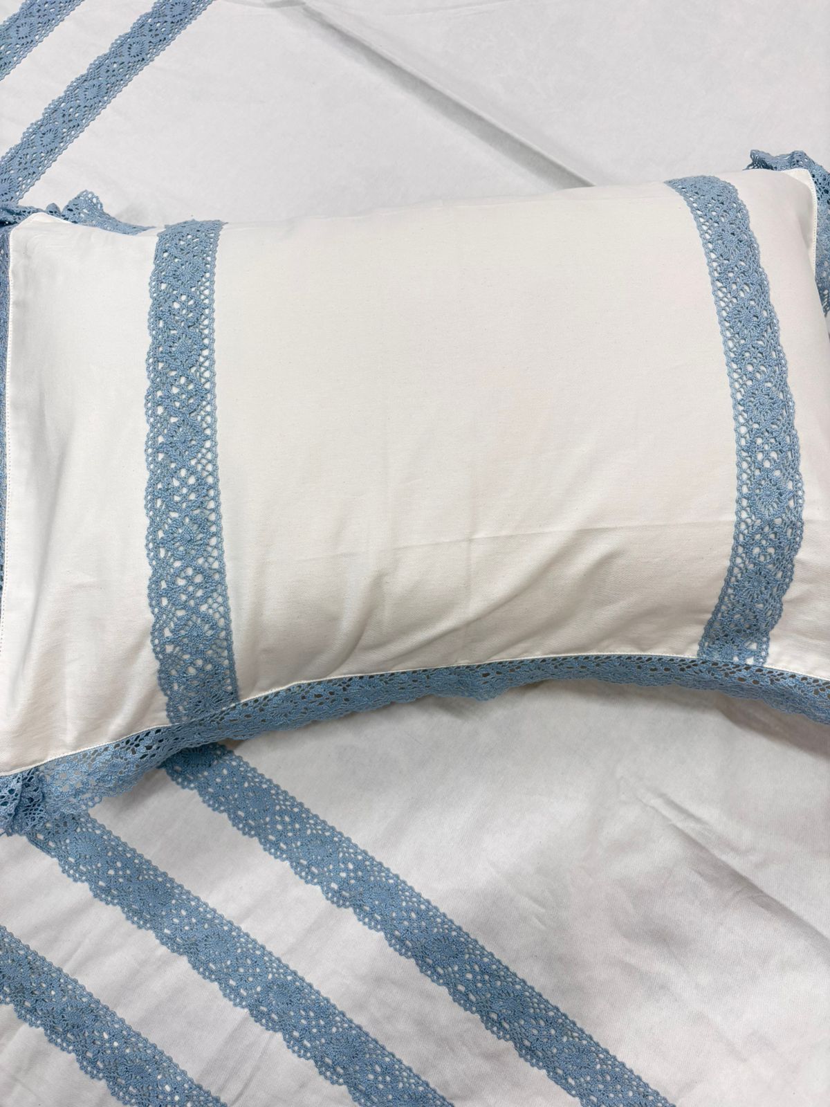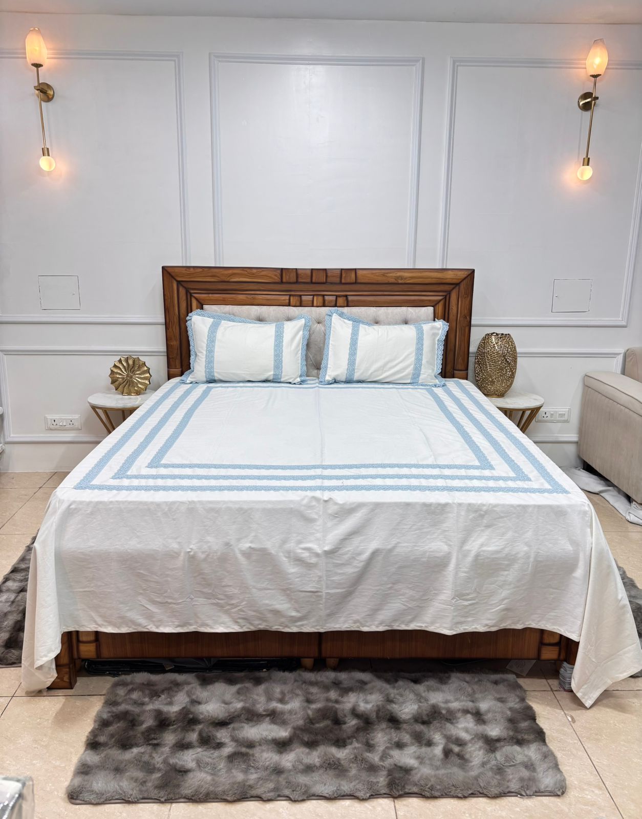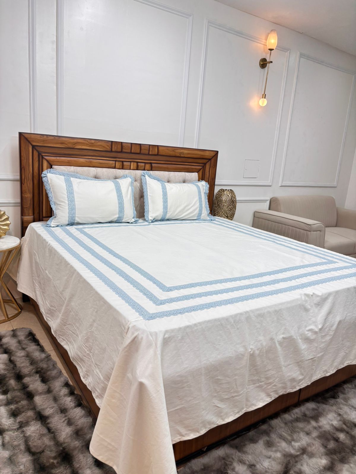 Elevate your bedroom into a tranquil sanctuary with this exquisite white cotton bedsheet. Combining the crisp, clean look of high-quality linens with a delicate sky-blue lace border, this set offers a perfect balance of modern minimalism and vintage charm.
