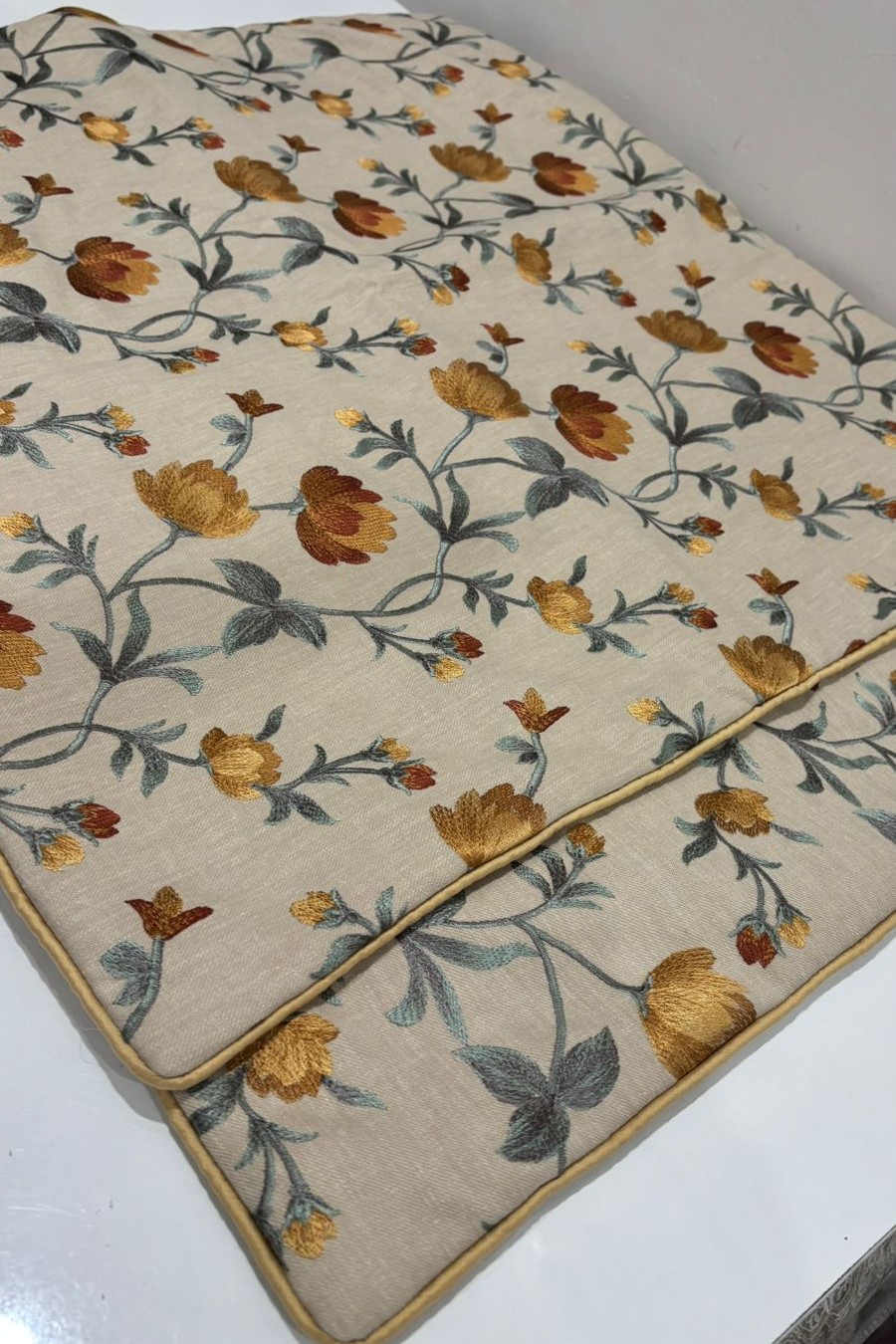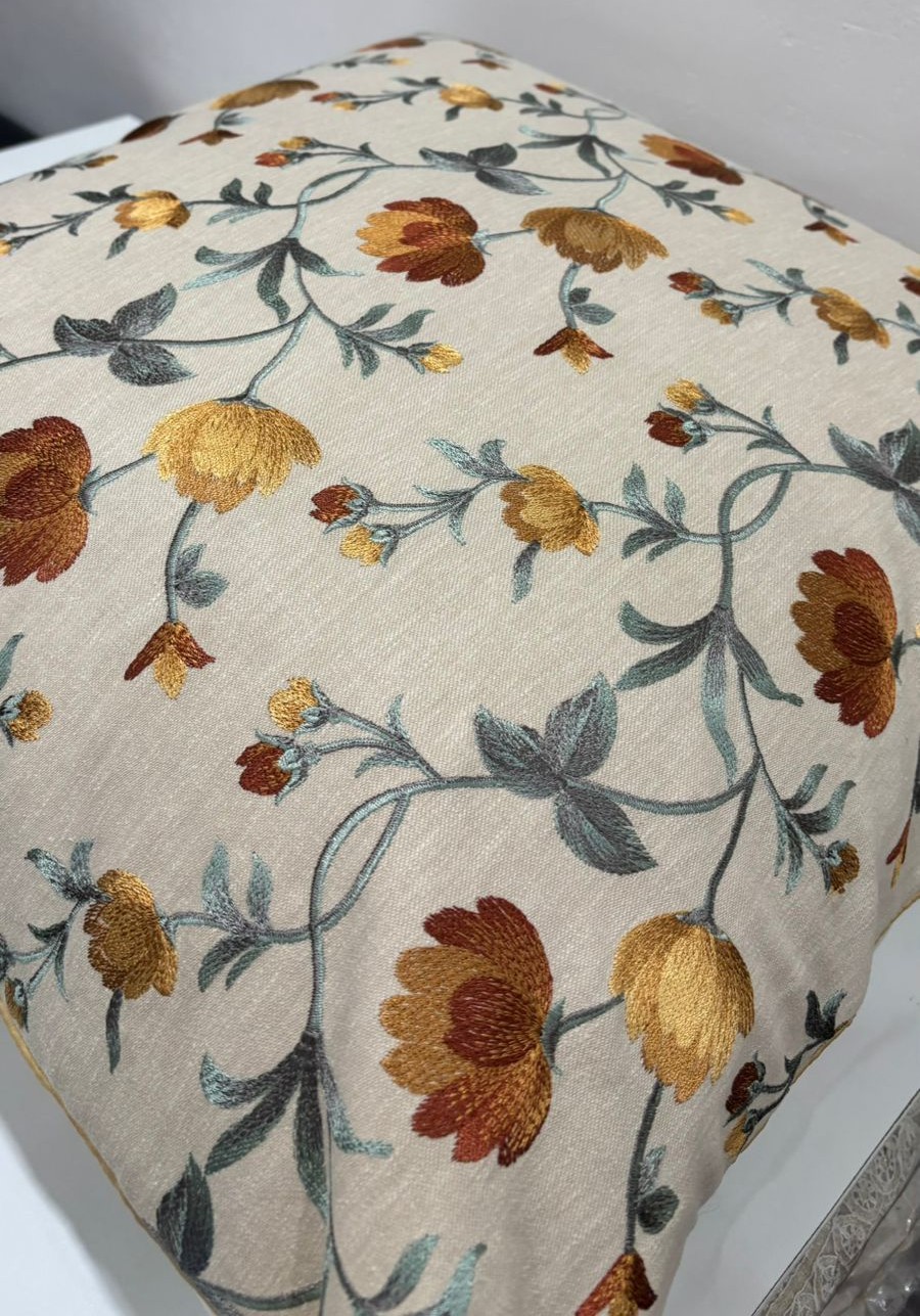 ring warmth and charm to your living space with this beautifully designed floral cushion cover. Set on a soft beige base, the delicate vine pattern features blooming flowers in rich mustard yellow, rust, and earthy brown tones, complemented by subtle grey-green leaves. The classic floral layout adds a timeless, handcrafted feel that suits both traditional and contemporary interiors.