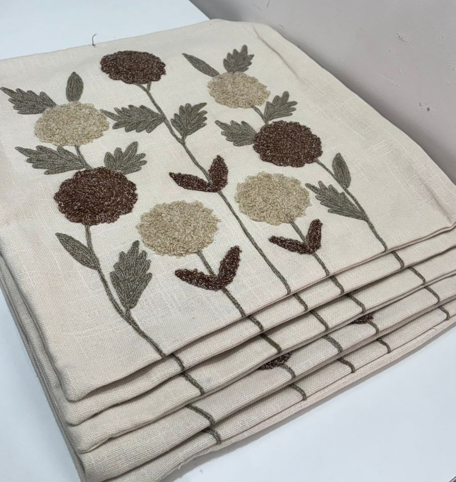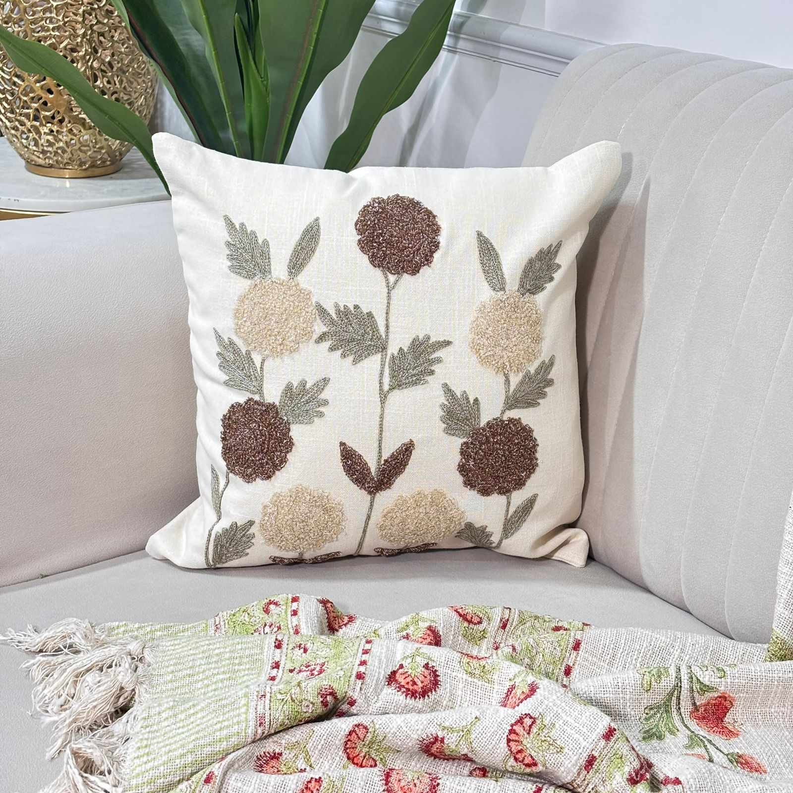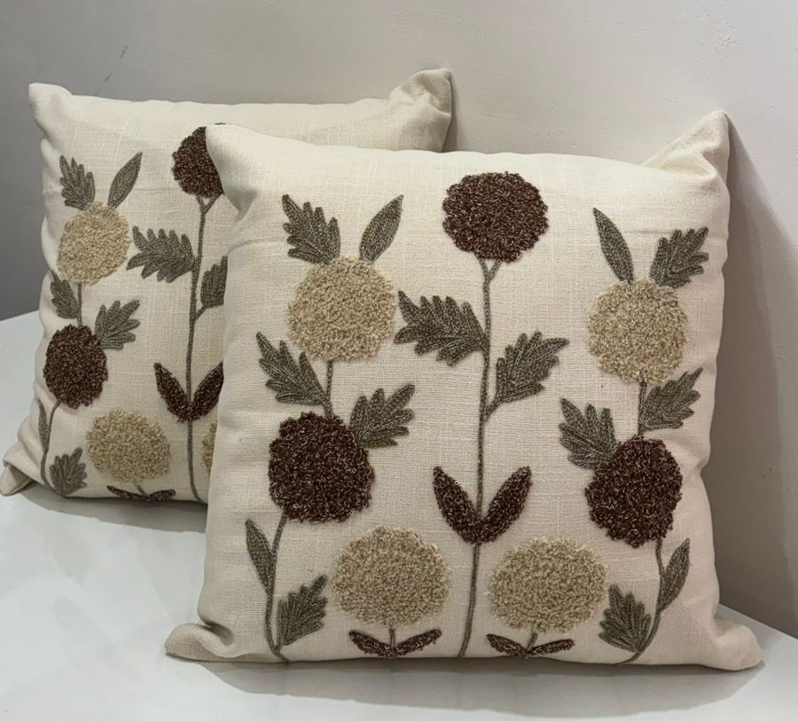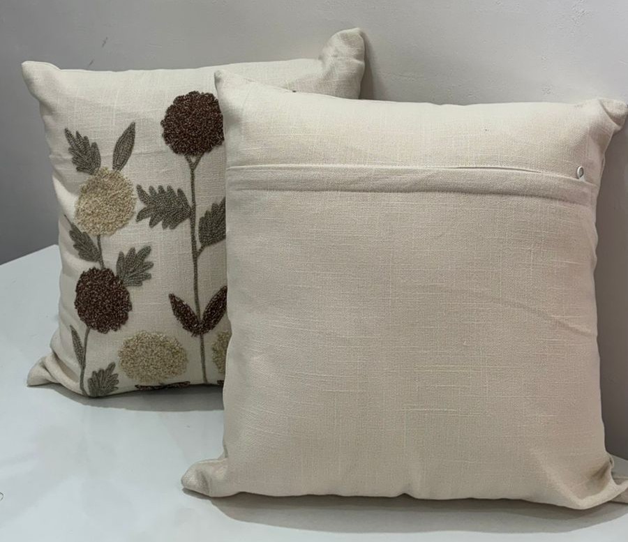 Bring calm, organic elegance into your space with this beautifully crafted cushion cover. Set on a soft natural base, the design features hand-embroidered floral motifs in warm earthy tones of beige, brown, and olive green. The raised embroidery adds rich texture and a handcrafted feel, making it a perfect accent for sofas, armchairs, or beds. Its neutral palette blends effortlessly with both modern and traditional interiors.