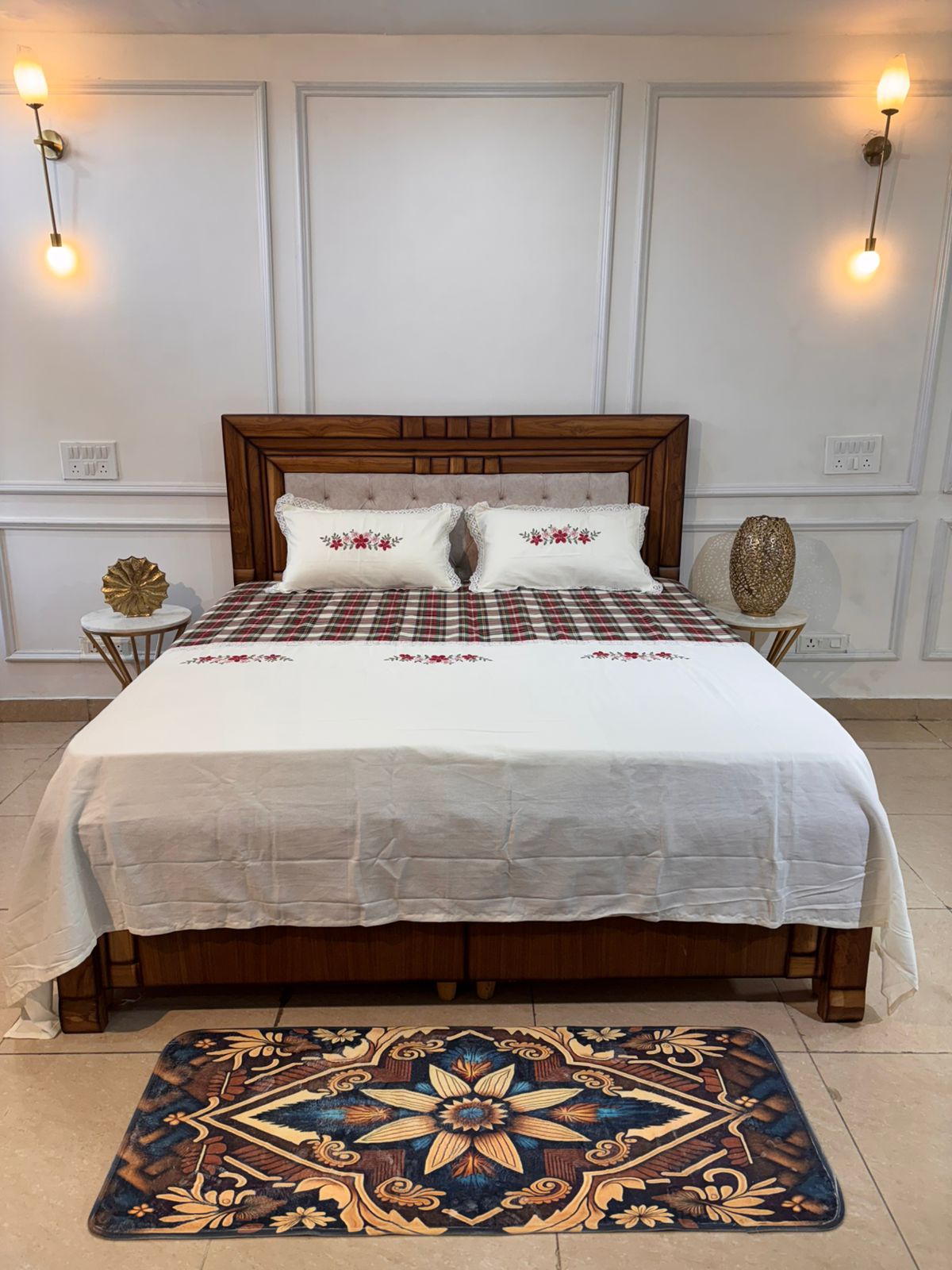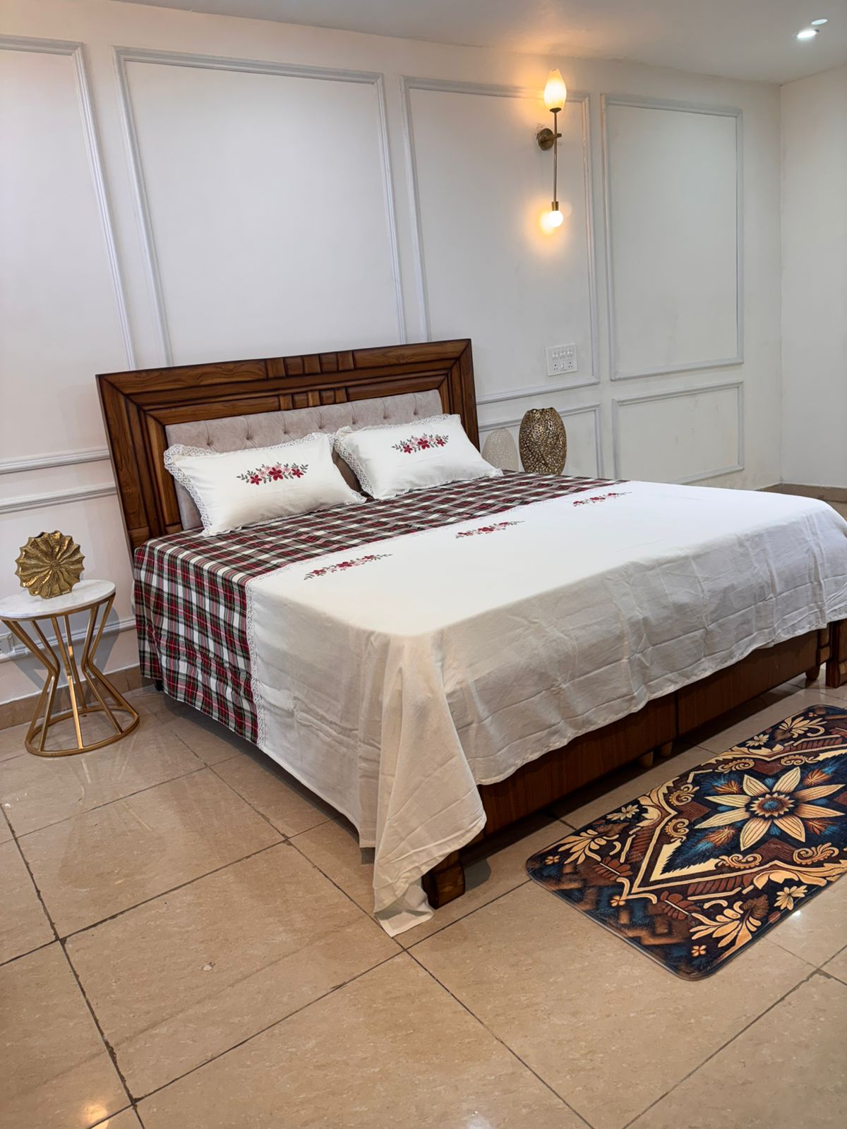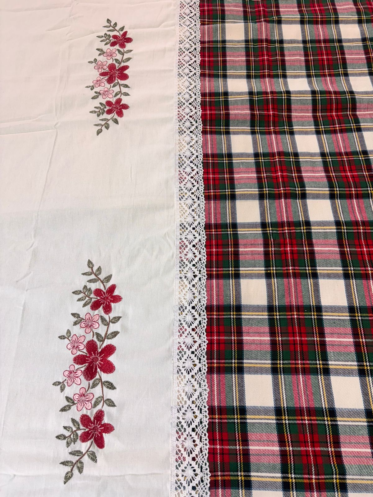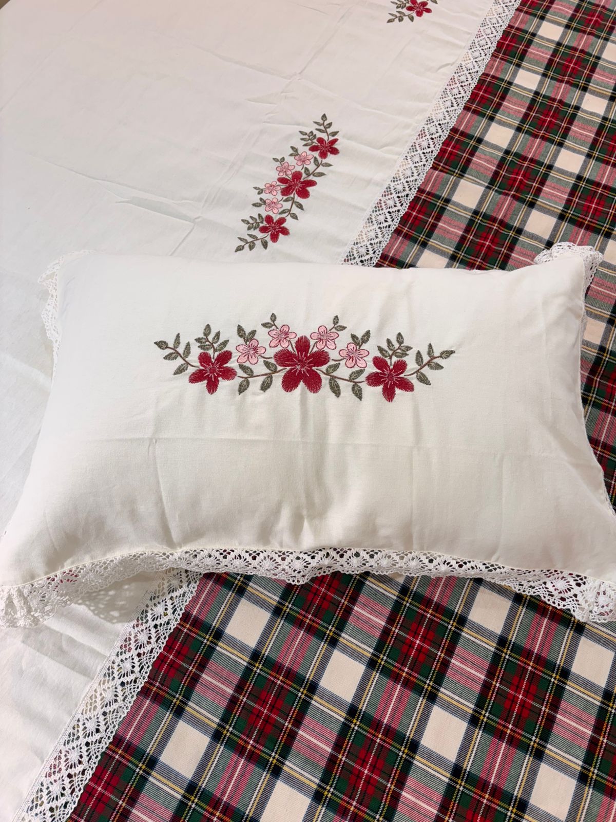 Bring a touch of cozy, cottage-inspired charm to your home with our Rustic Elegance Embroidered Bedsheet. This standout design features a sophisticated dual-pattern aesthetic: a clean white base paired with a bold, multi-colored plaid top panel. The transition is highlighted by meticulous red and pink floral embroidery, creating a handcrafted look that feels both warm and refined.