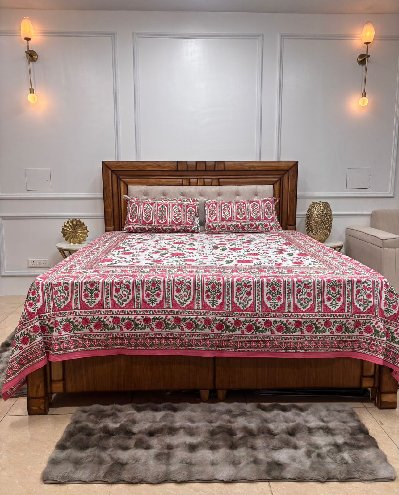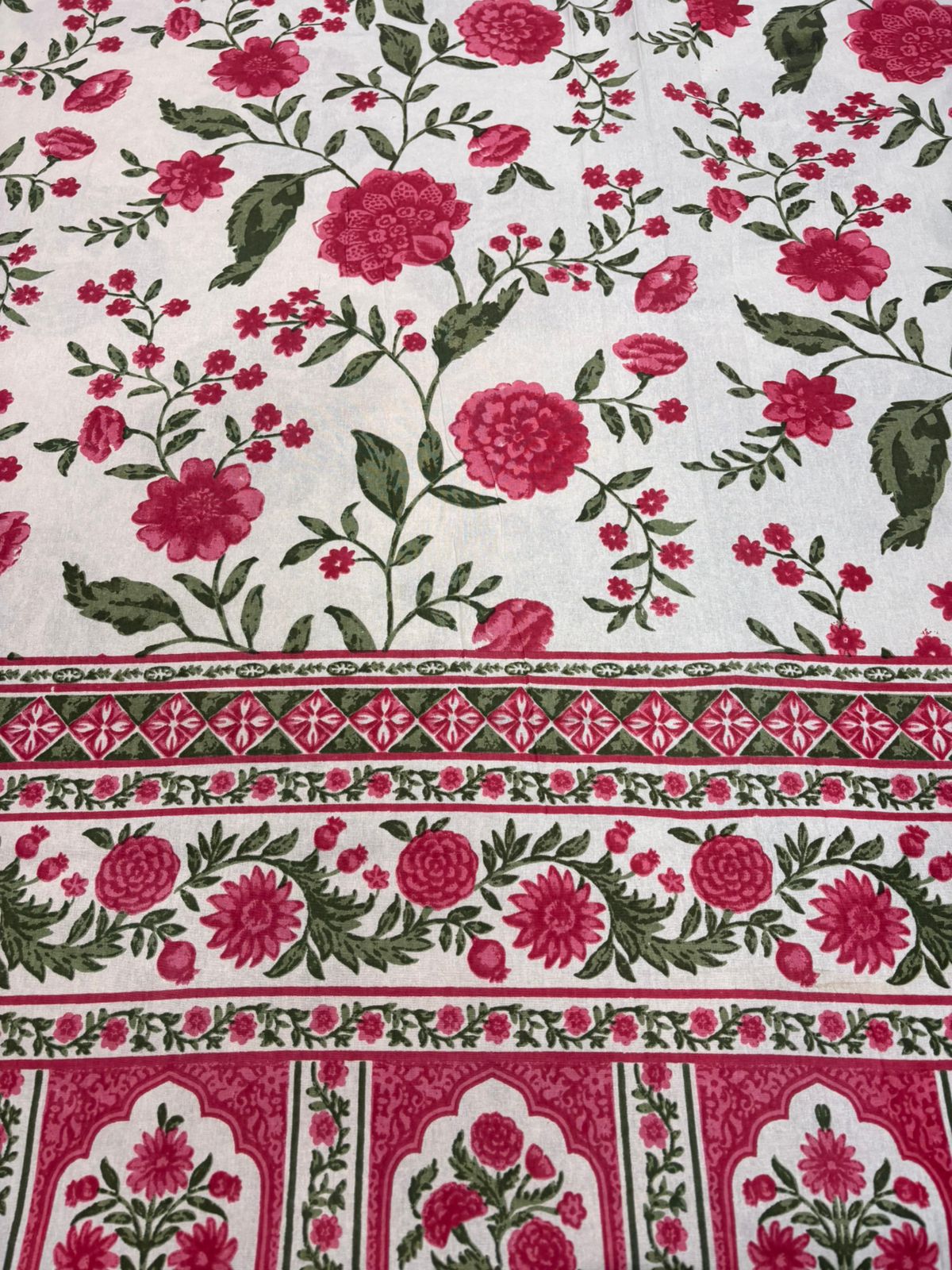 Celebrate classic Indian elegance with this 100% pure cotton bedsheet, adorned with detailed floral motifs and a striking red ethnic border. The breathable cotton fabric ensures a soft, cool, and comfortable sleep experience throughout the year. Designed for durability and everyday use, the colors remain vibrant even after multiple washes.