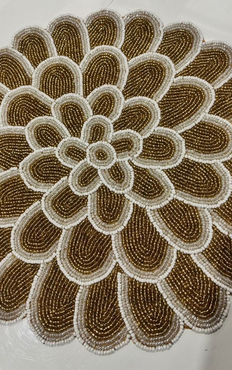 Elevate your table décor with this stunning floral table mat, meticulously handcrafted with shimmering golden beads and soft pearl-white accents. Designed in a layered petal pattern, it reflects refined artistry and timeless elegance. Each bead is carefully hand-stitched to create depth, texture, and a radiant finish that instantly enhances your dining or display table.