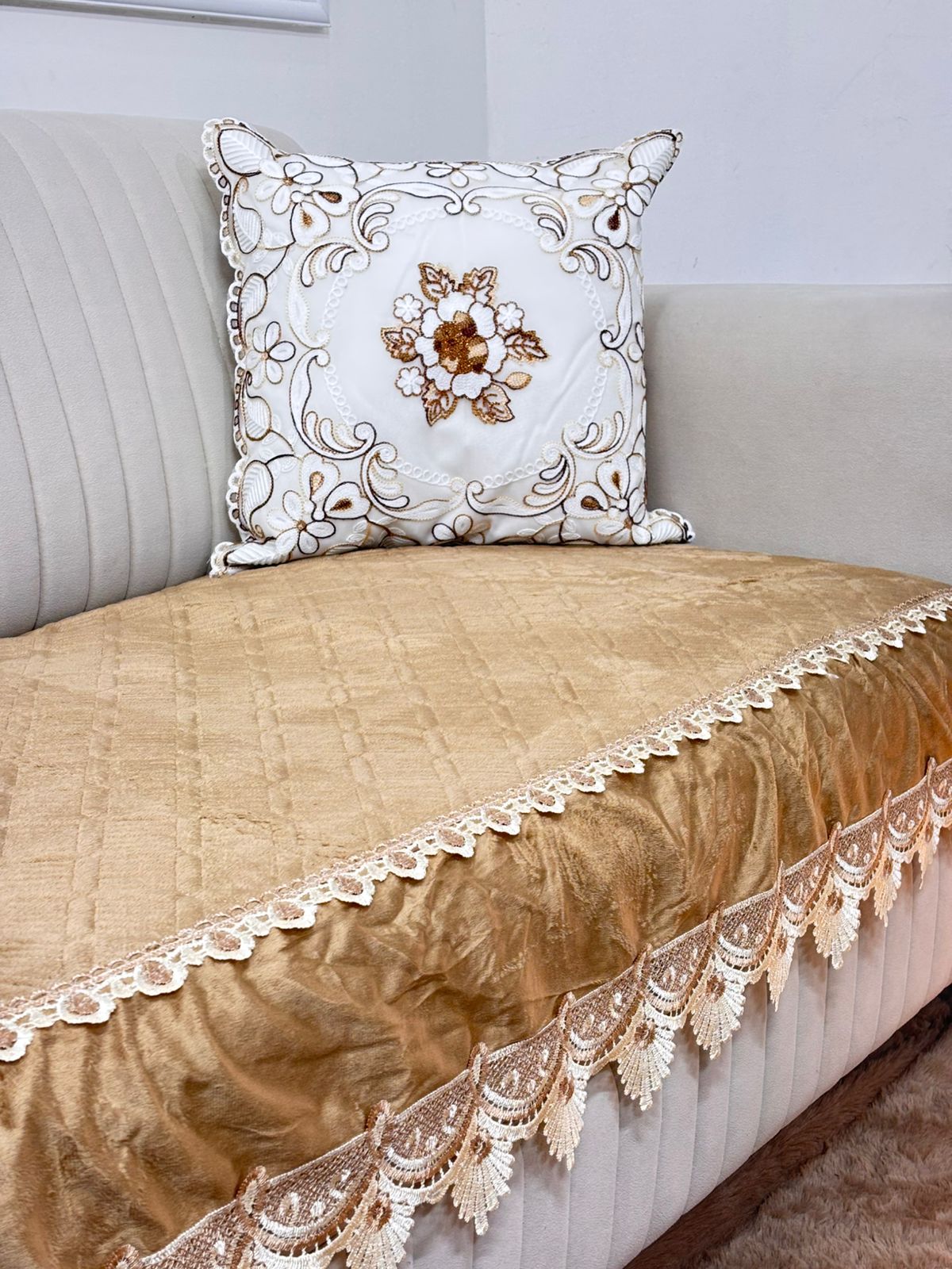 Elevate your home with the warm, majestic glow of our Imperial Gold sofa protector. This cover is the ultimate fusion of protection and palatial style, featuring a rich metallic sheen and an elaborate double-lace border that commands attention in any room.