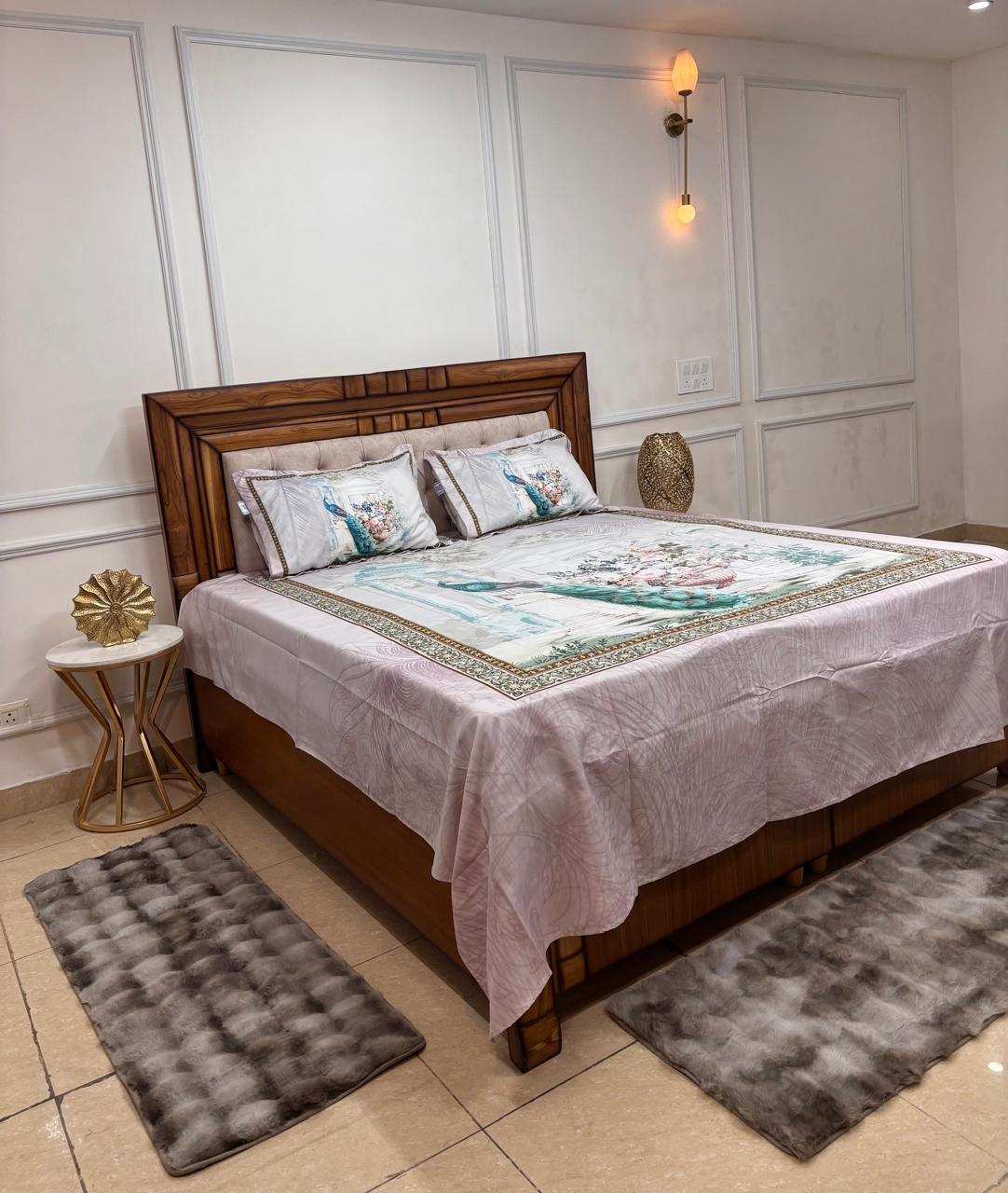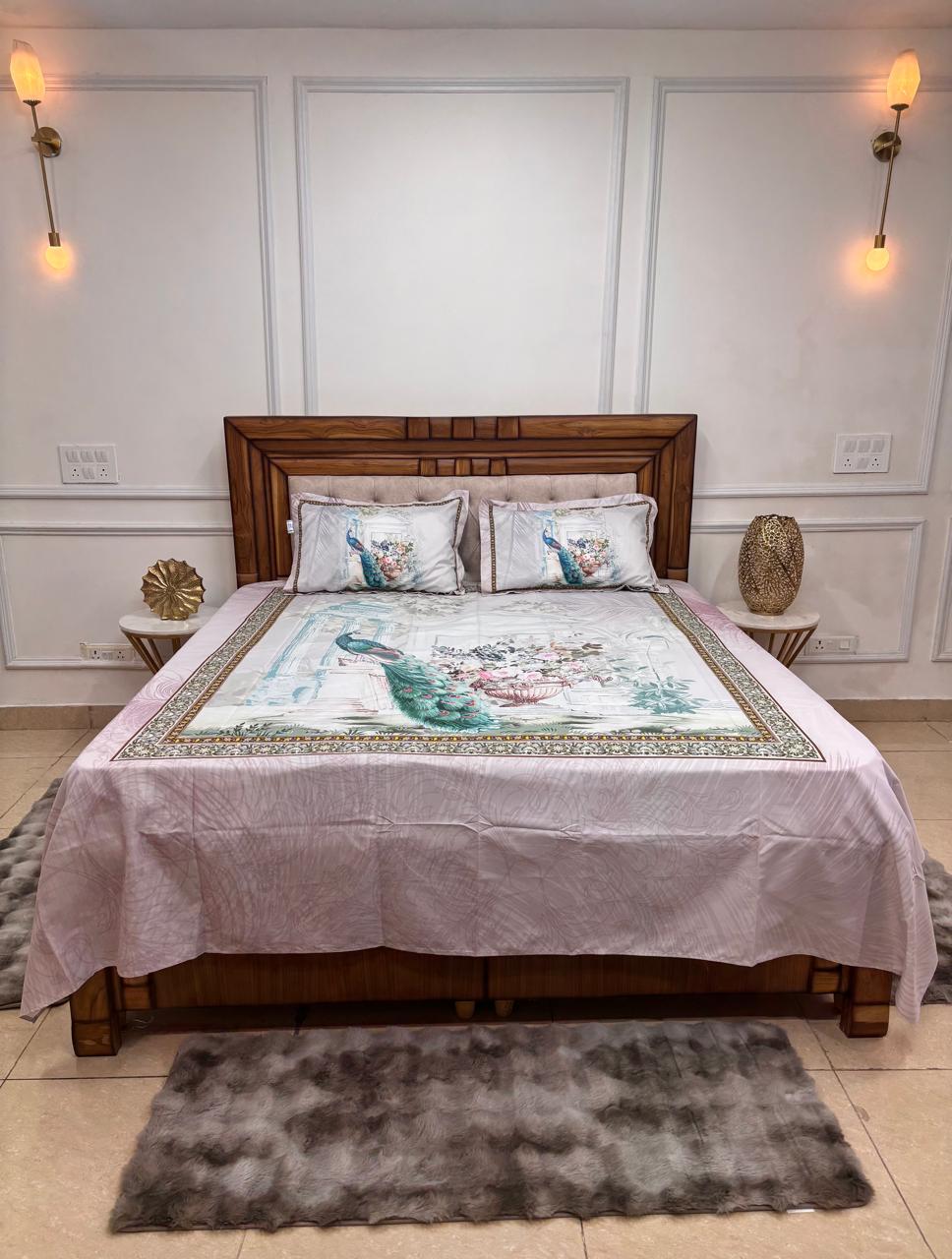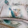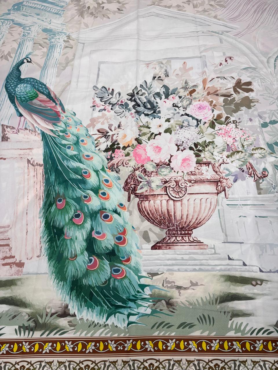 Elevate your bedroom with the majestic beauty of our Imperial Peacock Garden Bedsheet, a piece that combines classical avian artistry with refined botanical borders. This set serves as a sophisticated focal point, blending soft, airy tones with the vibrant elegance of a regal peacock.