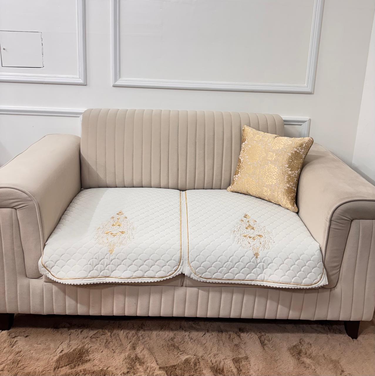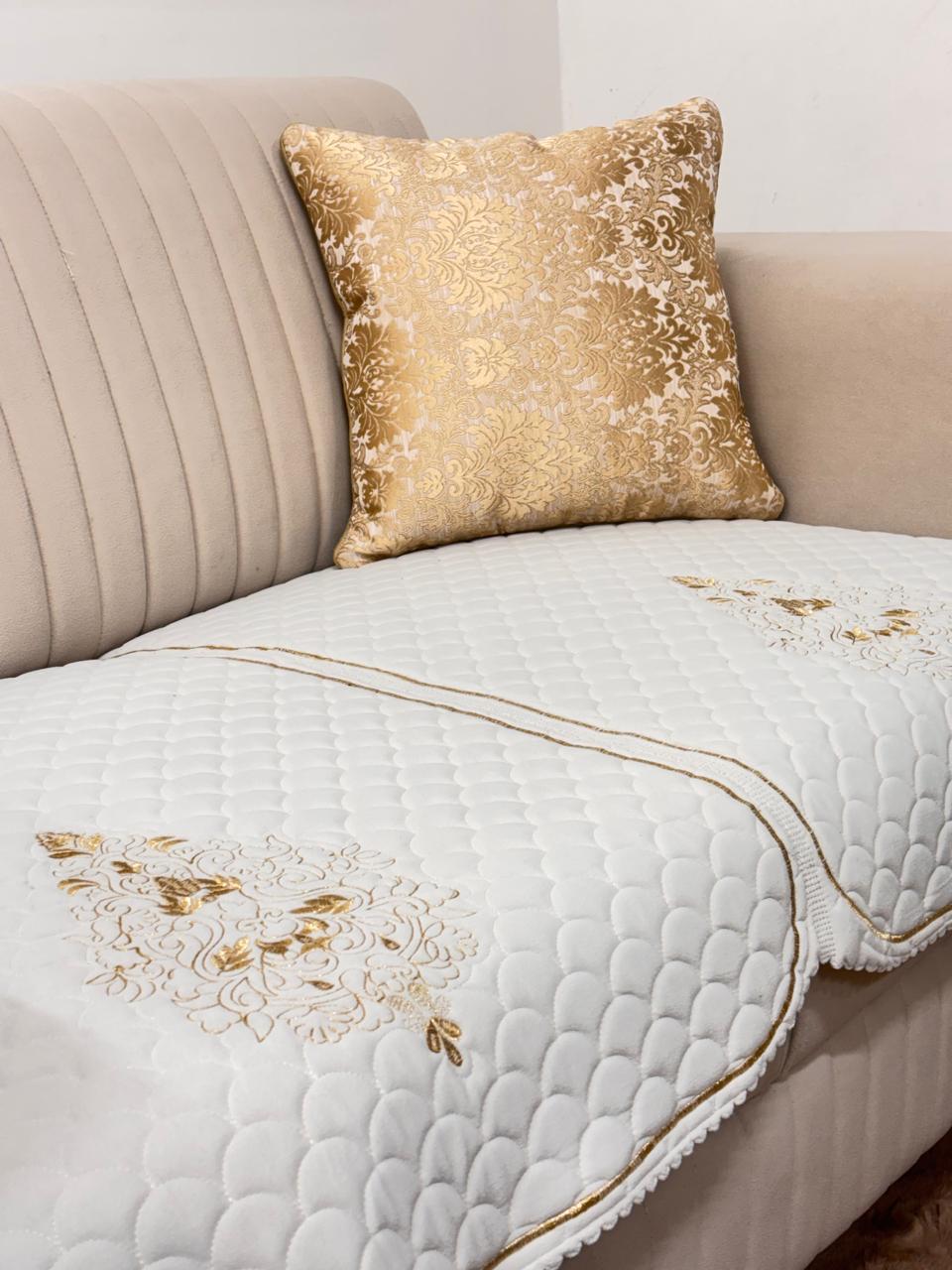Elevate your living space with the timeless beauty of this ivory luxury sofa cover 🤍✨ Designed to reflect elegance and sophistication, this piece brings a clean, graceful look to any modern or classic interior.The soft ivory base paired with intricate gold embroidery creates a rich, royal appeal that instantly enhances your sofa’s appearance. The finely quilted texture adds depth and comfort, making every seating moment feel plush and relaxing.