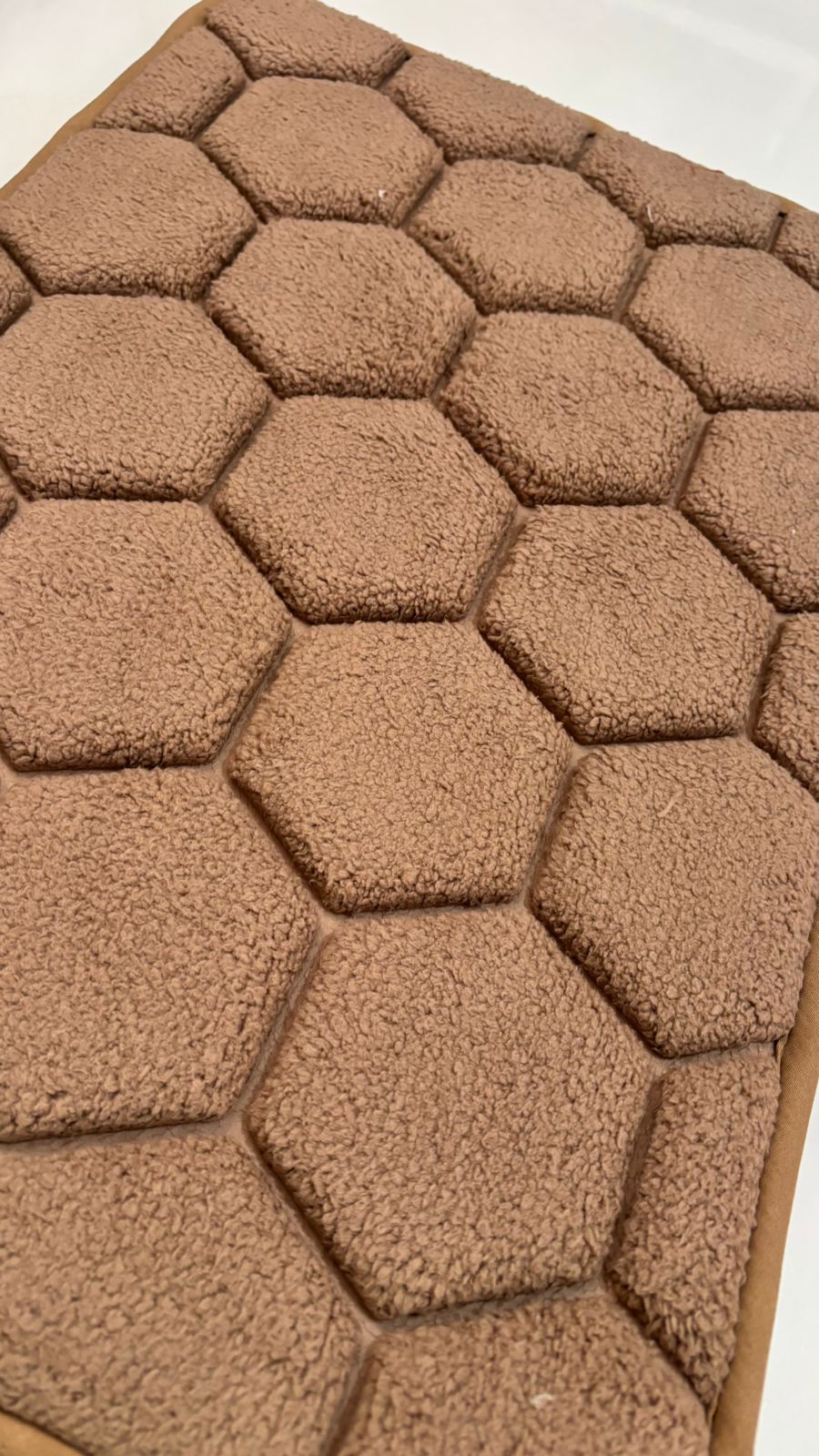 crafted with a plush microfiber fabric, this floor mat features a distinctive honeycomb pattern that adds texture and visual depth to any space. the cushioned surface feels soft underfoot while helping to absorb dust and moisture, making it ideal for bedrooms, living areas, or beside the bed.