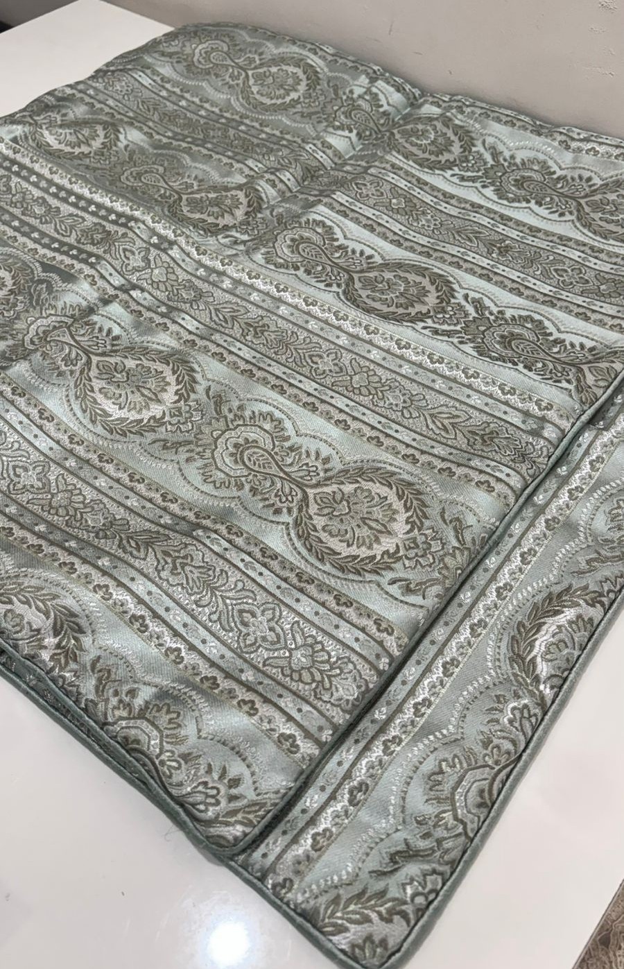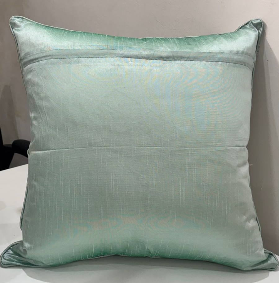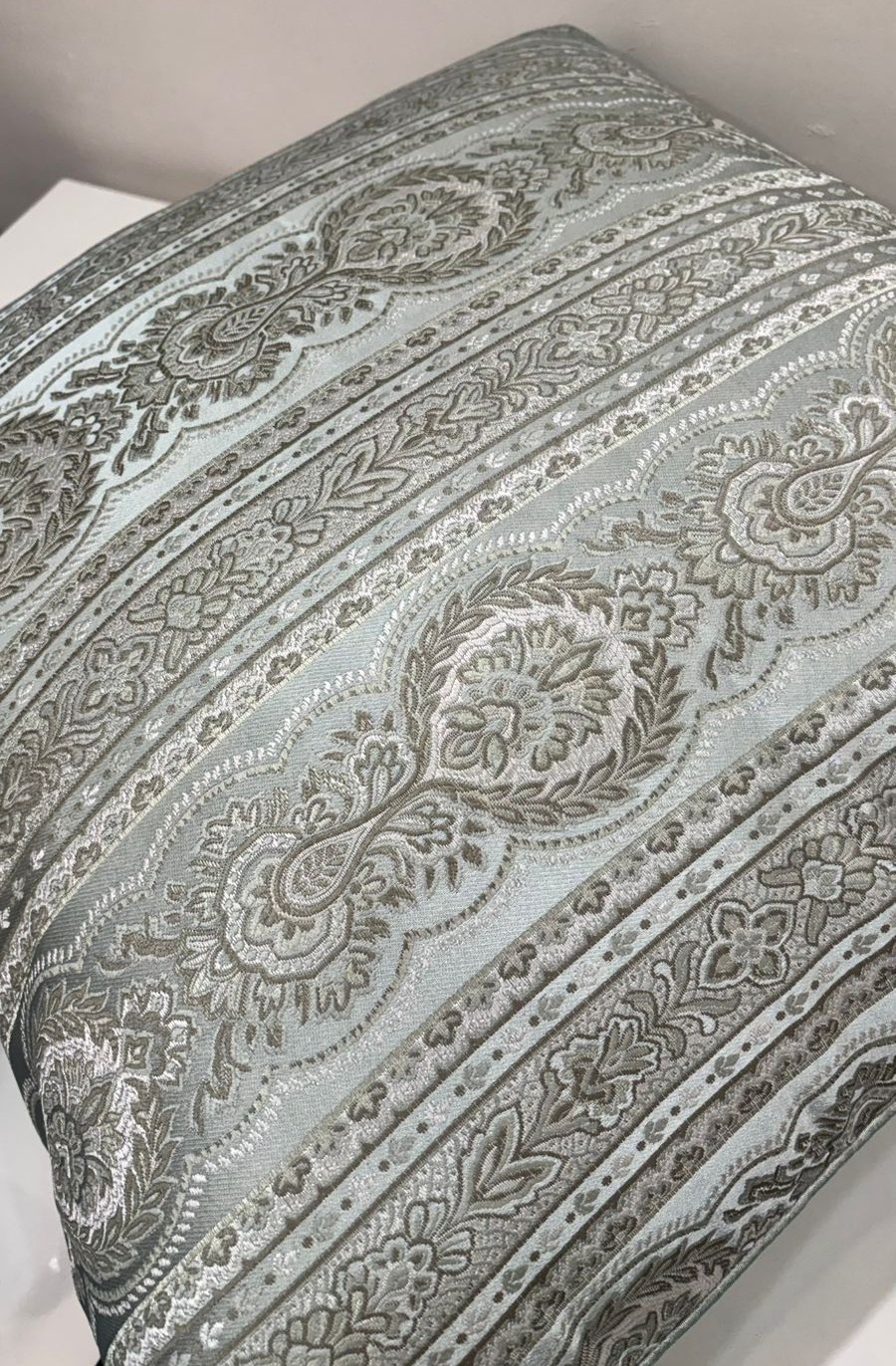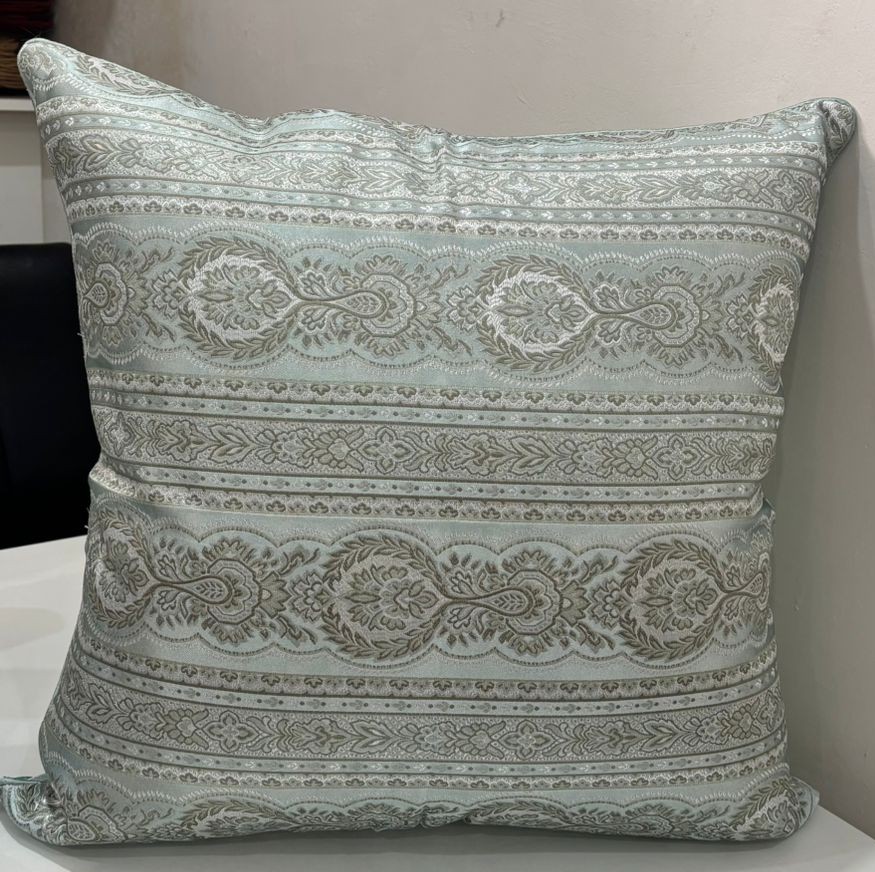 This cushion cover features a timeless heritage-inspired pattern woven into a soothing sage green base, highlighted with delicate ivory and taupe motifs. The intricate horizontal design adds depth and texture, giving the cushion a refined, classic appeal that complements both modern and traditional interiors.
