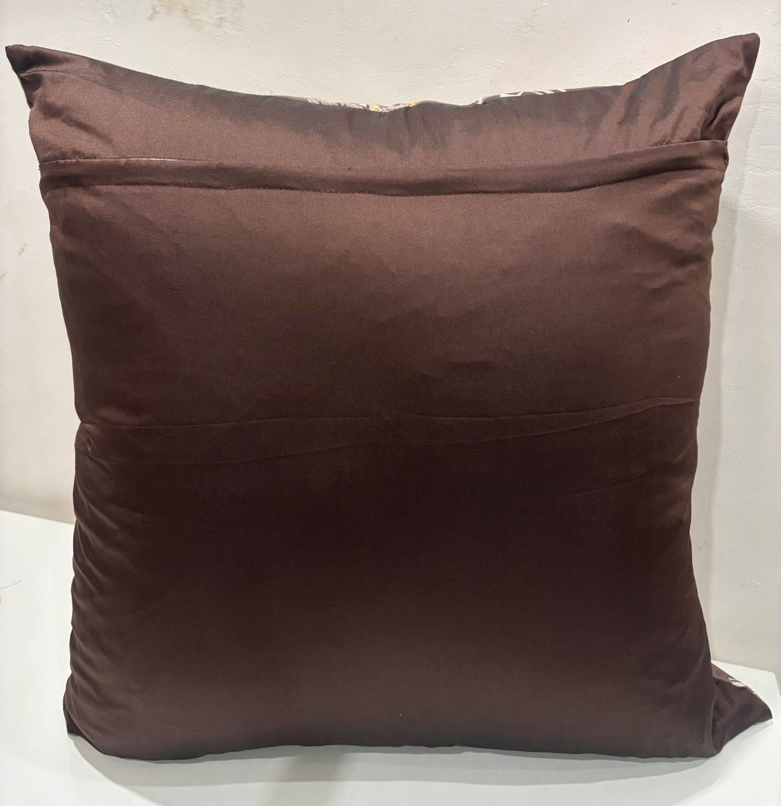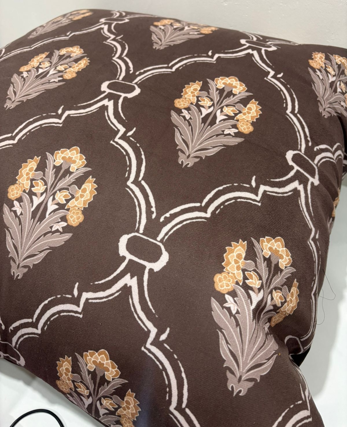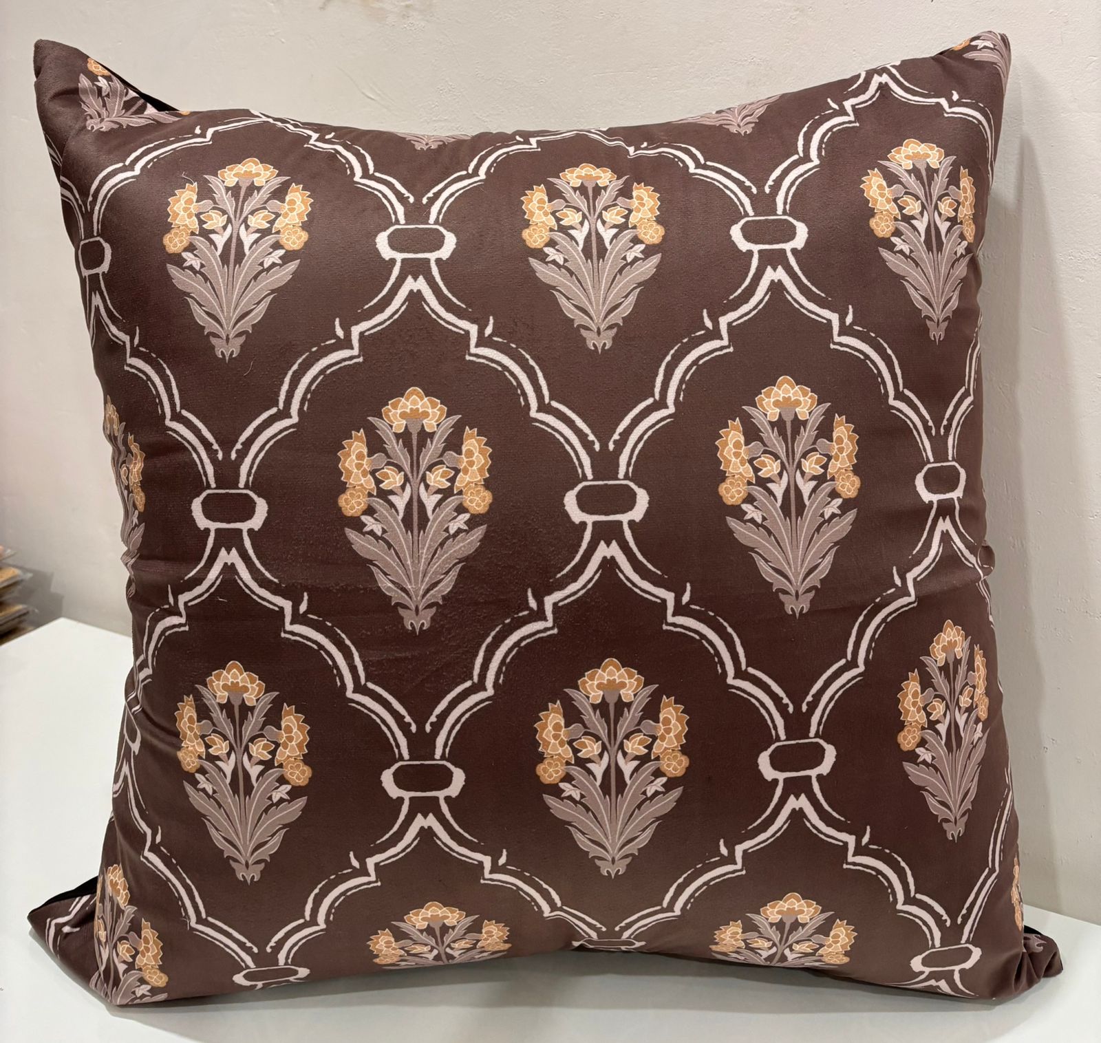Add a sense of warmth and grounded luxury to your space with our Earth & Ochre Mughal Lattice Cushion Cover. This large-format piece features a rich, deep chocolate base that serves as a dramatic canvas for delicate floral artistry, making it a perfect statement anchor for large sofas or floor seating.