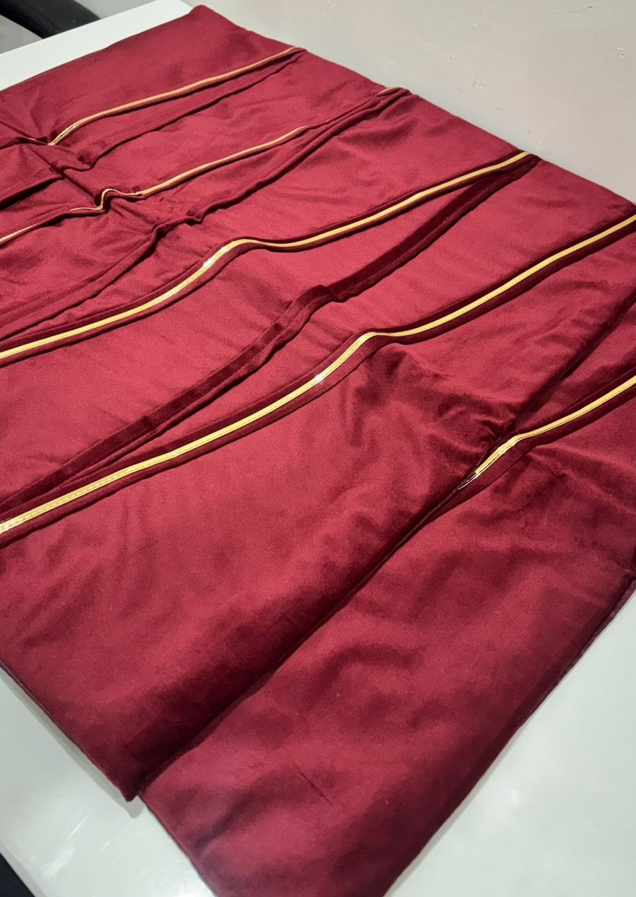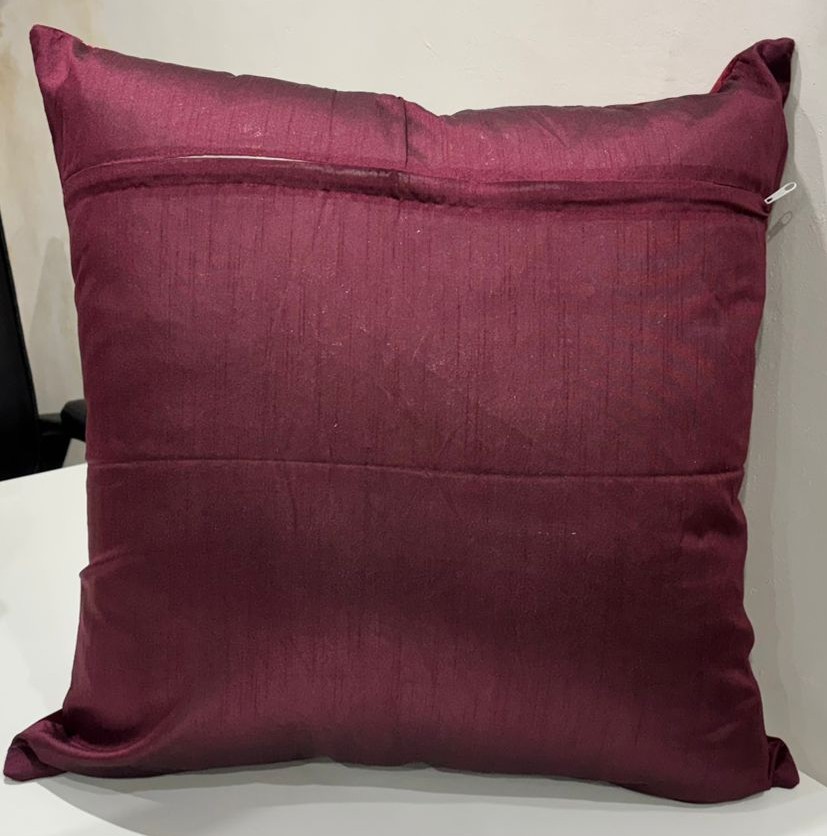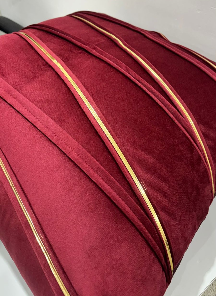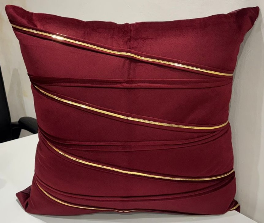 Elevate your home décor with this elegant cushion cover crafted in a rich maroon tone. The design features graceful diagonal golden accent lines that add a touch of sophistication and modern charm. The smooth, slightly lustrous fabric gives the cushion a refined, upscale appearance, making it a perfect statement piece for sofas, lounge chairs, or beds.