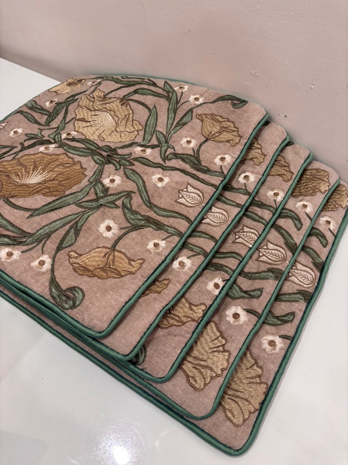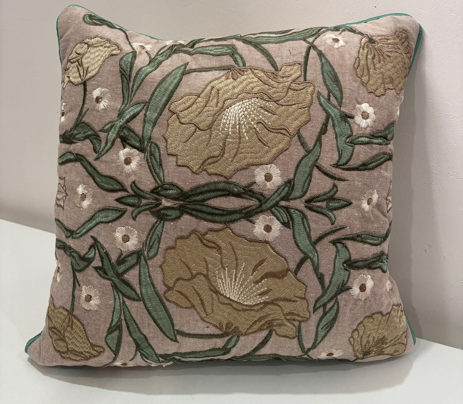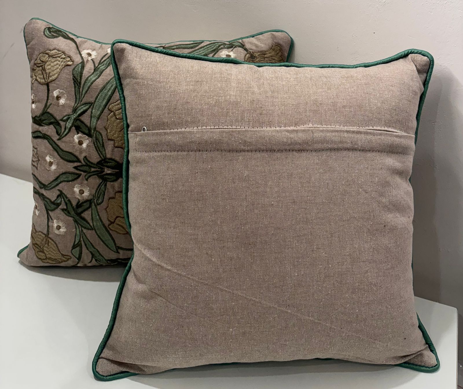 Inspired by a quiet meadow in bloom, this cushion cover features flowing green vines and softly textured floral embroidery on a muted earthy base. The design feels organic and free-flowing, with delicate white accents adding lightness and balance.
