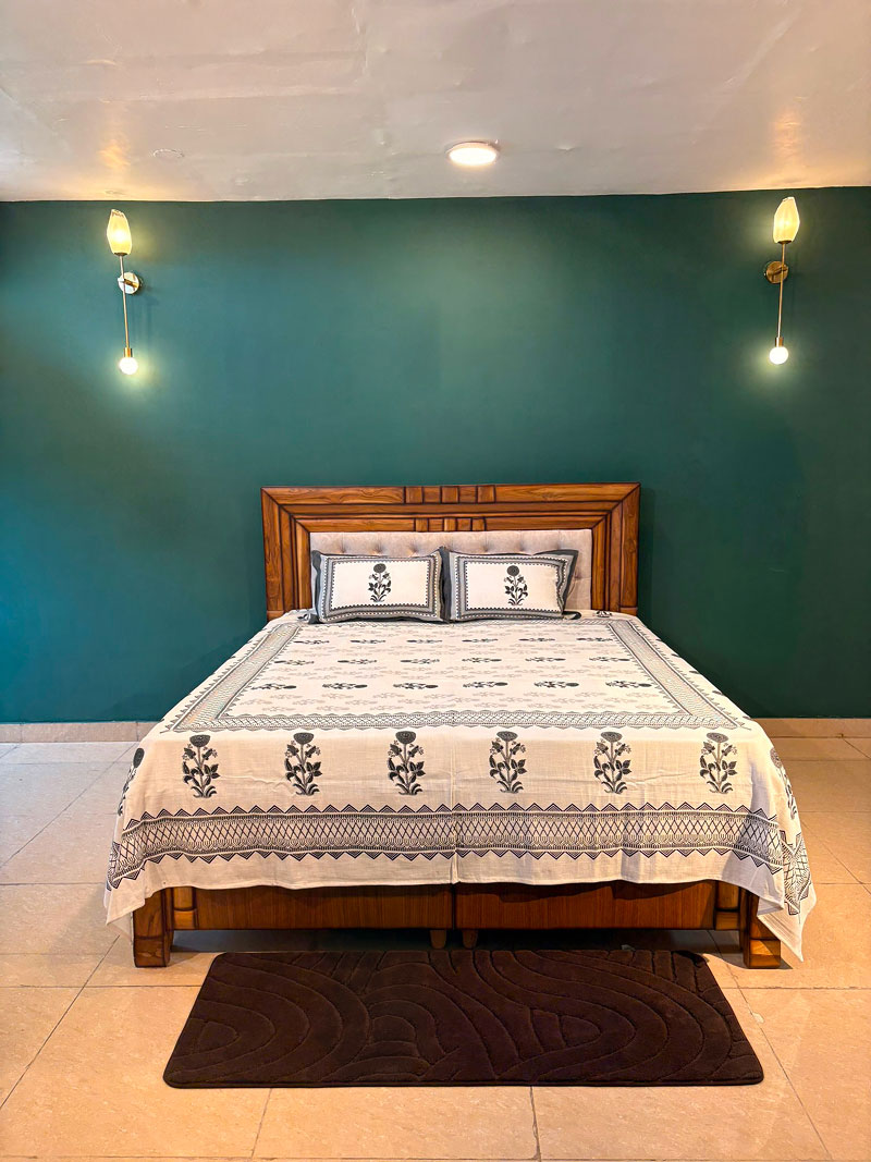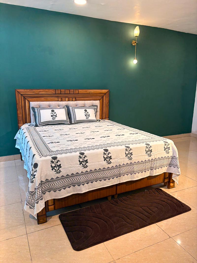 Elevate your space with this Minimalist Black Floral Anokhi print bedsheet, crafted from soft, breathable pure cotton duck fabric. A timeless and elegant choice for any king-size bedroom setup.