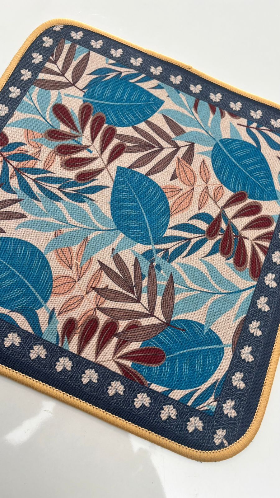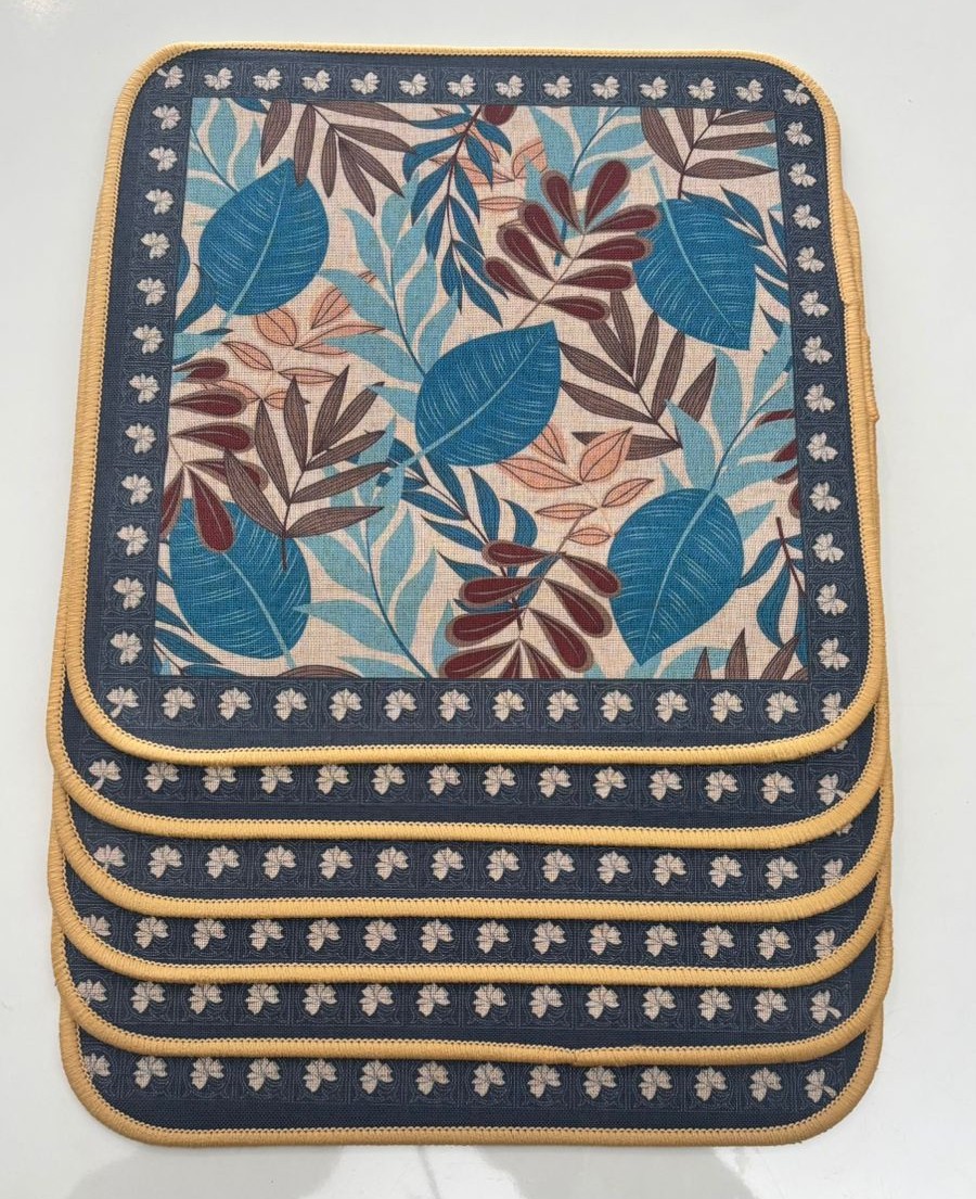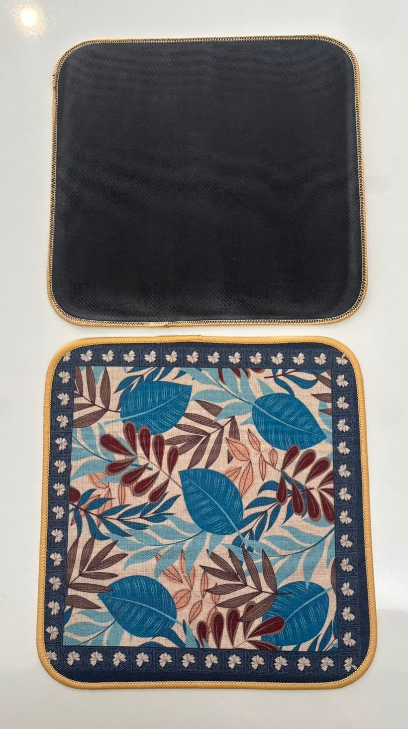 This stylish square fabric mat features a beautifully detailed botanical leaf design inspired by natural foliage. The soothing blend of blue, beige, and earthy brown tones creates a fresh and elegant look, making it ideal for table décor, dining settings, workspaces, or decorative accent use. The neatly patterned border adds a refined finish and enhances the overall visual appeal.