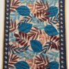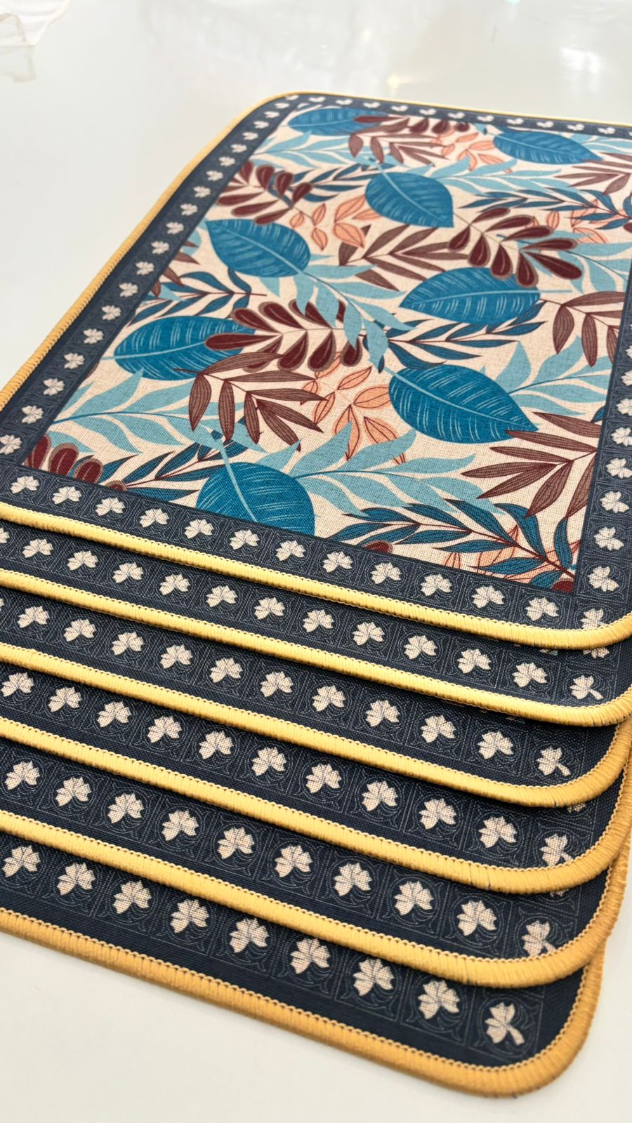 This elegant table mat features an intricate arrangement of tropical foliage in rich hues of blue, maroon, and pastel peach. Surrounded by a navy floral border and finished with reinforced yellow edging, it combines beauty with durability. Ideal for dining tables, coffee tables, or countertops, it brings a touch of natural sophistication to your space.