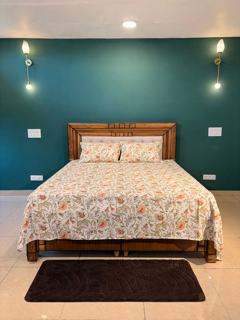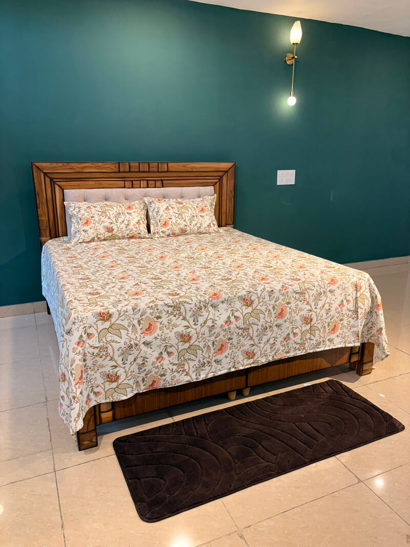 Soft and breathable pure cotton duck fabric bedsheet featuring a graceful olive floral vine print on an ivory base. Traditional Anokhi design meets everyday comfort in this elegant king-size essential.