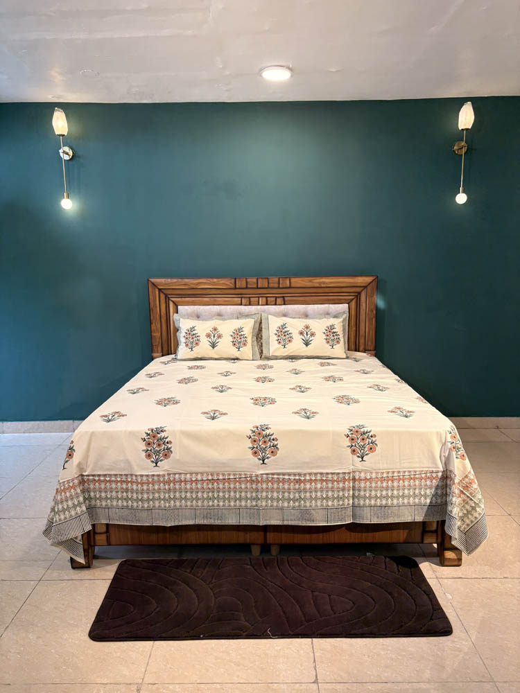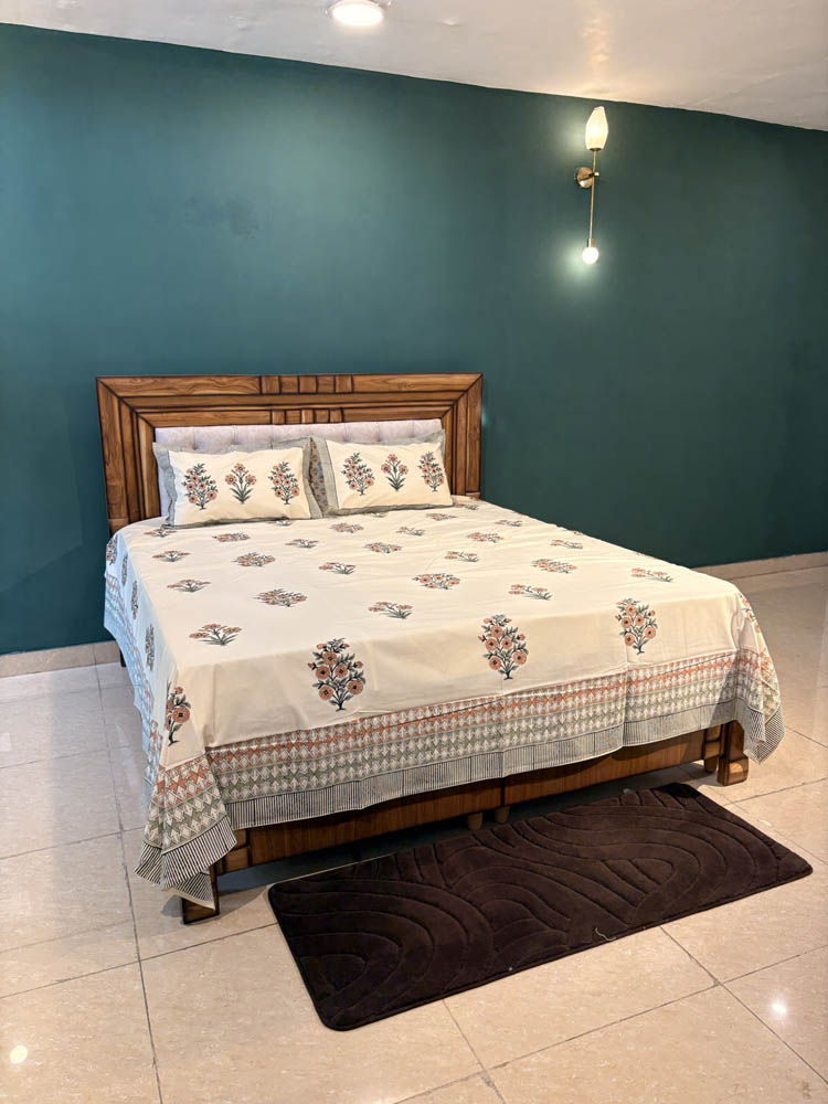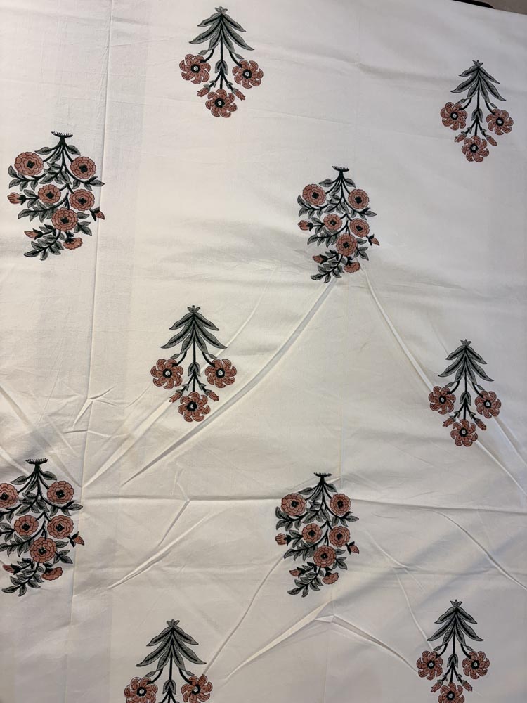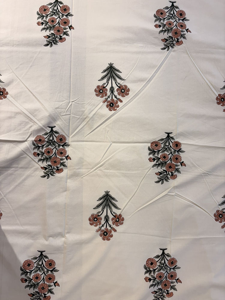 Warm and graceful, this Peach Blossom bedsheet features hand block printed floral bouquets in soft peach tones on breathable 100 percent cotton. An elegant expression of artisanal beauty and everyday comfort for your king-size bed.