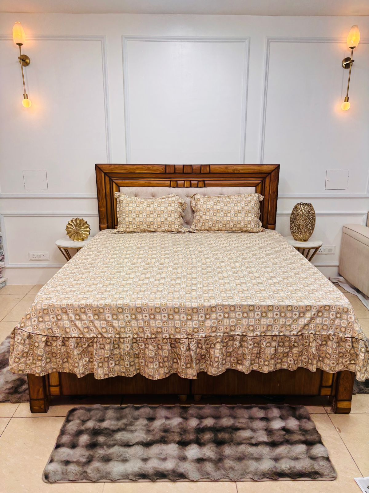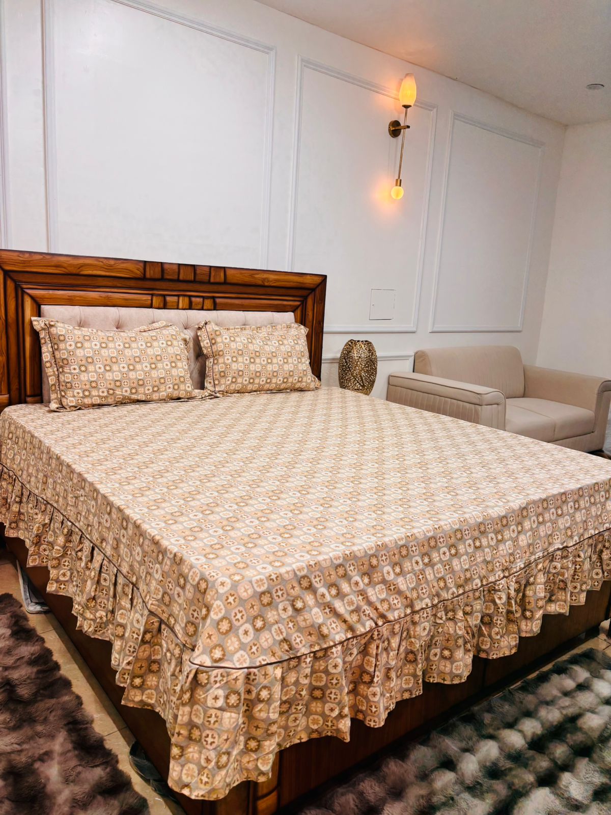This royal beige printed frill bedsheet is designed to bring warmth, sophistication, and elegance to your space. The intricate geometric-floral pattern combined with a graceful frill border creates a premium designer look that instantly enhances your bedroom dรฉcor ๐