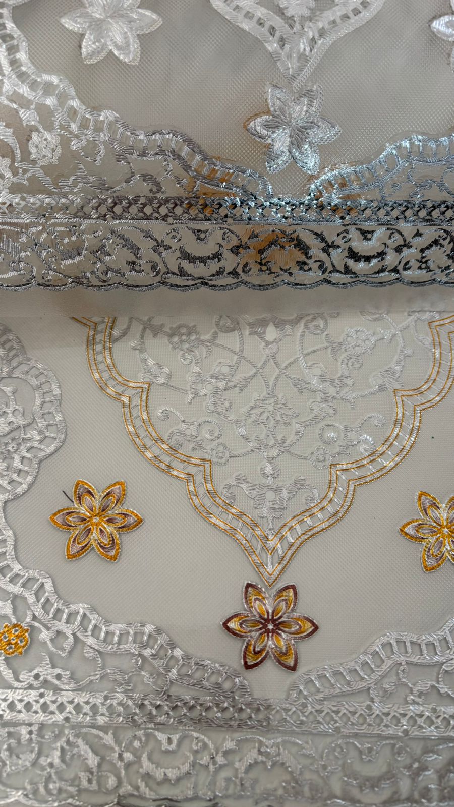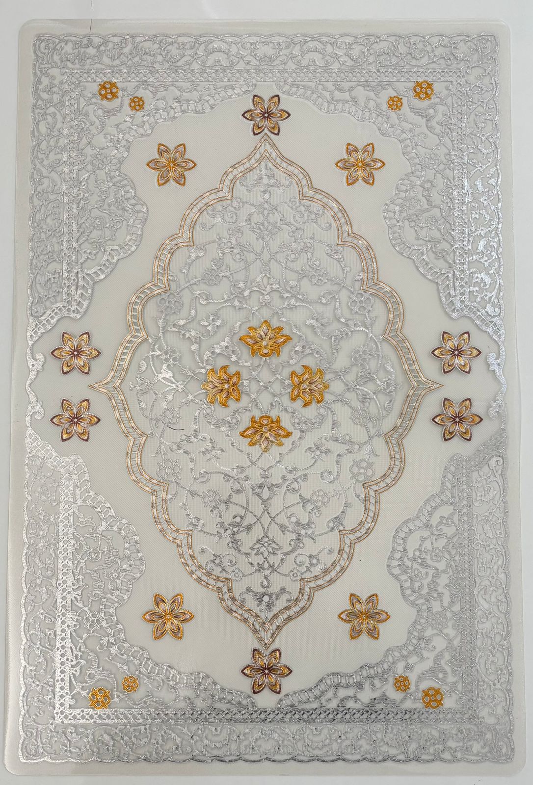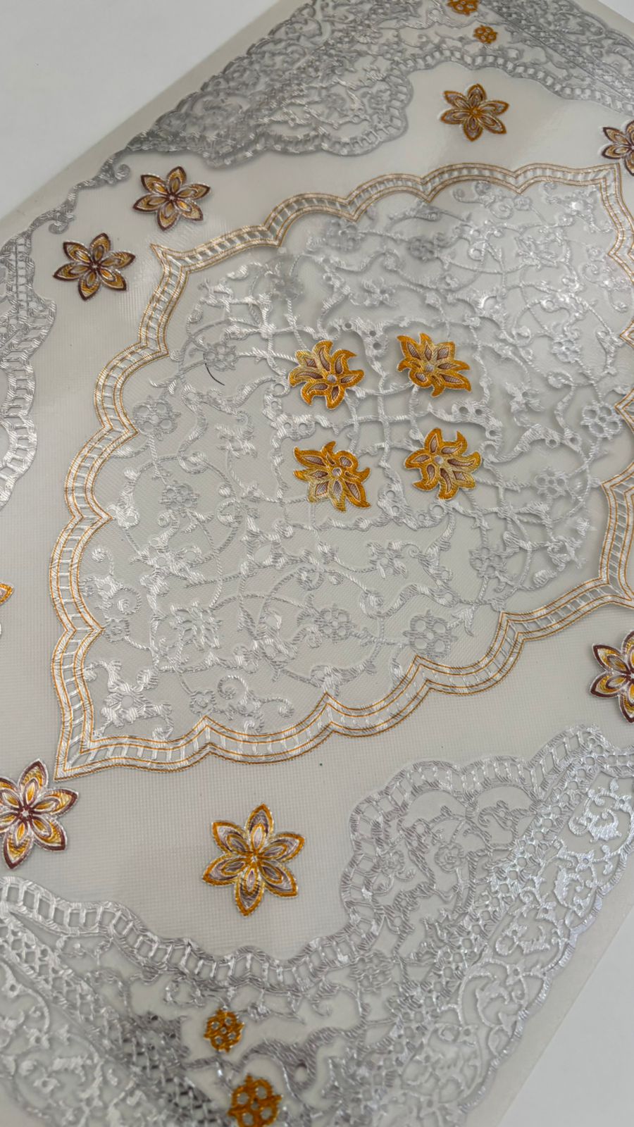 Transform your table into a statement piece with this exquisitely crafted embossed table mat, designed to reflect timeless elegance. Featuring a regal central medallion surrounded by finely detailed lace-inspired patterns and shimmering golden floral highlights, this mat adds depth and luxury to any setting. Made from high-grade PVC, this table mat is completely non-cotton, offering superior durability, water resistance, and effortless maintenance. Its smooth yet textured finish protects your tabletop while delivering a refined decorative appeal that lasts.