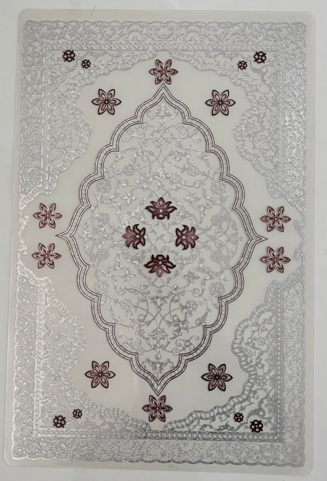 Designed to impress at first glance, this table mat showcases an exquisite lace-effect pattern with refined floral geometry that radiates elegance. The detailed embossed surface creates a soft three-dimensional look, while the harmonious silver base with deep brown accents adds richness without overpowering the table setting. Crafted from high-grade PVC (non-cotton), this mat combines ornamental beauty with everyday practicality, making it a perfect blend of décor and durability.