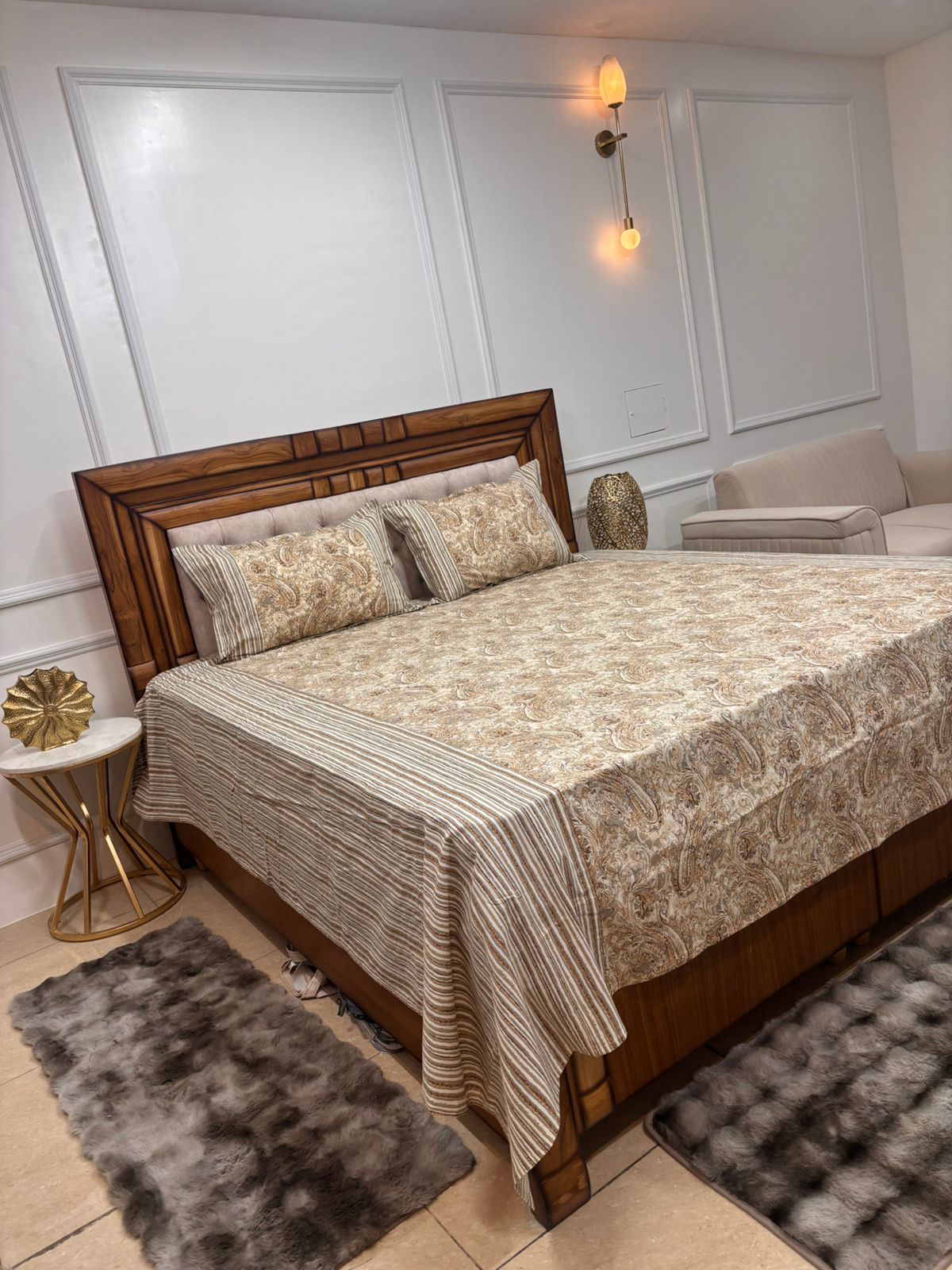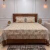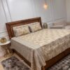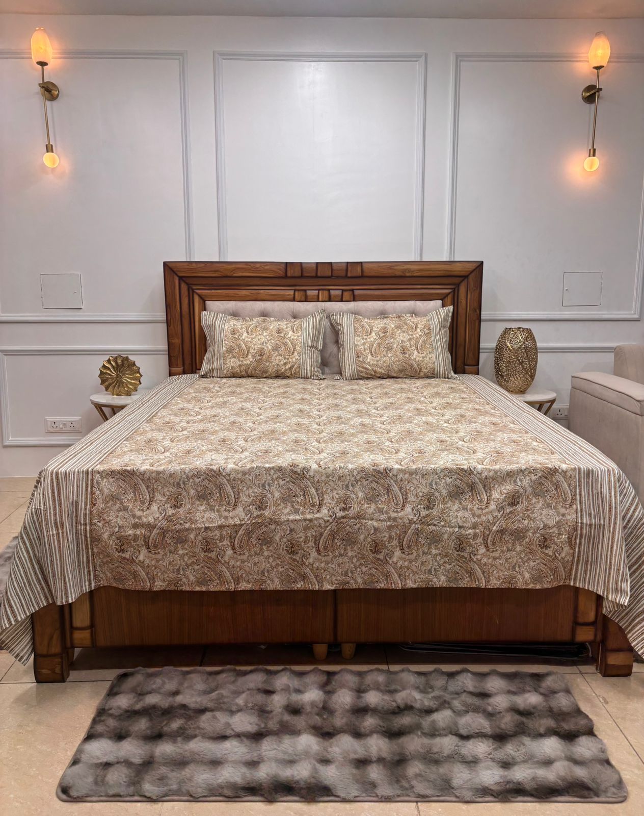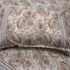 Infuse your bedroom with timeless elegance. This set features a rich, flowing vine and leaf pattern in deep burgundy, perfectly framed by a complex geometric “Jaali” border with ochre accents. It’s the perfect blend of traditional Mughal motifs and contemporary style.