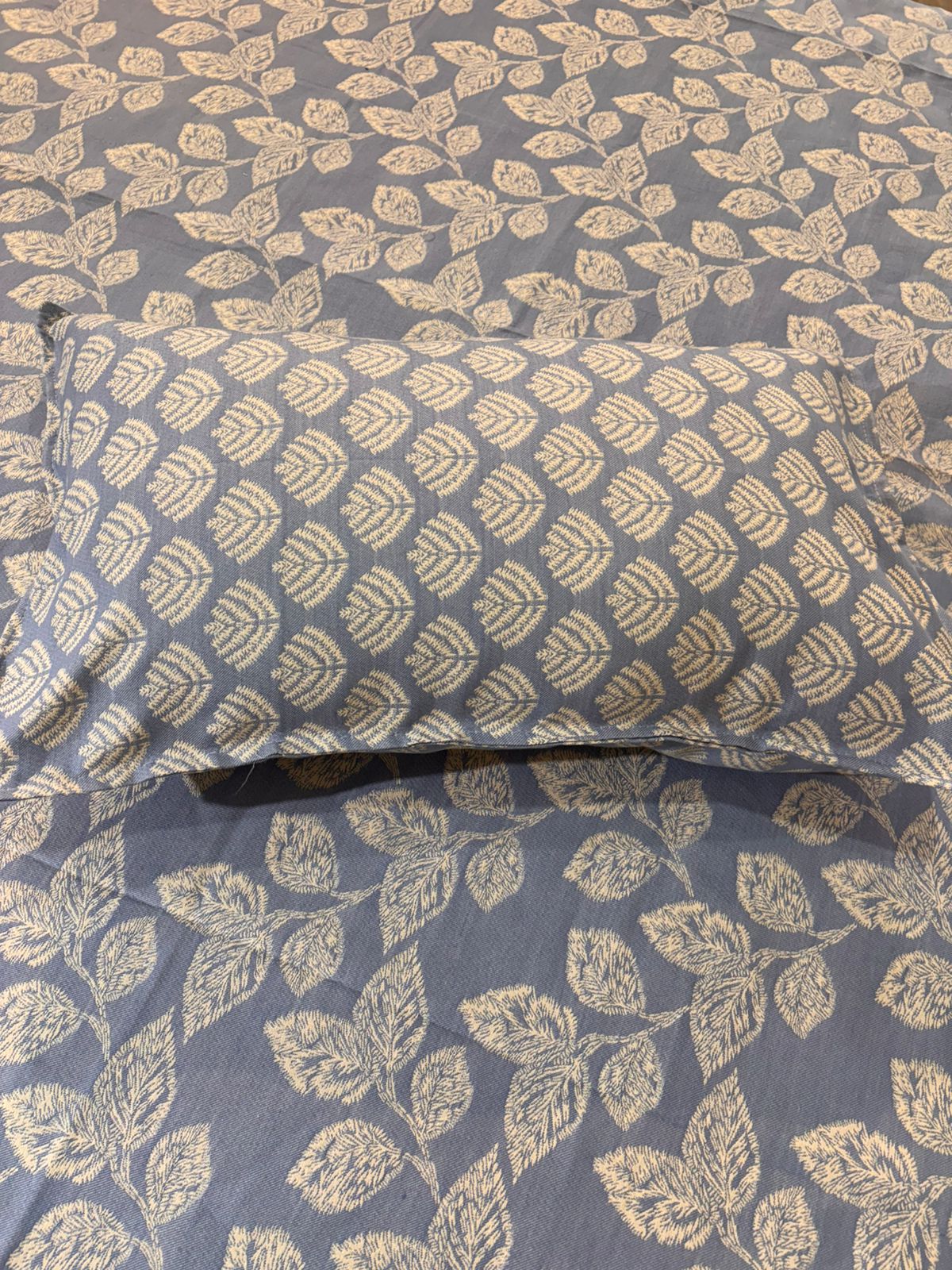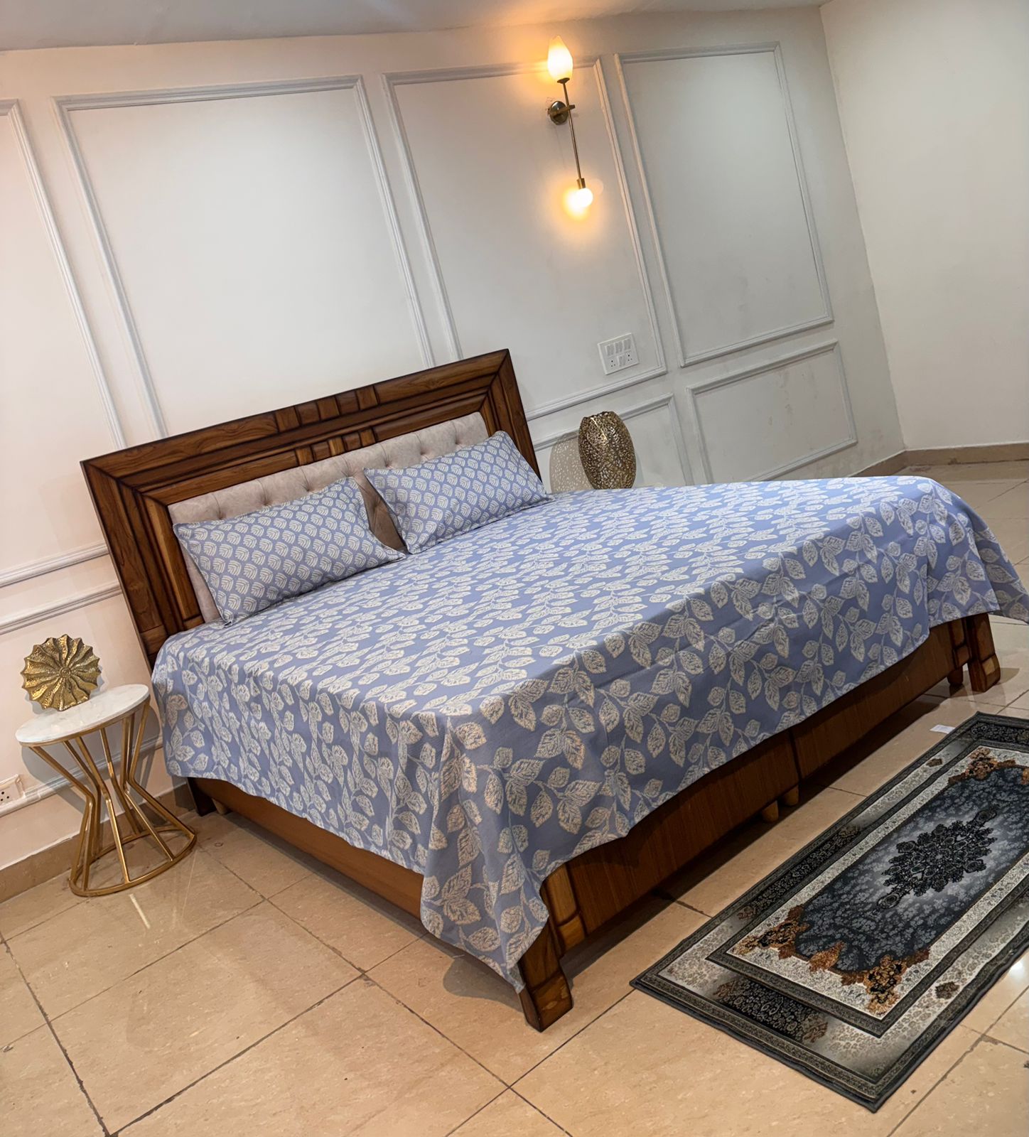 Bring calm and freshness to your bedroom with this soothing sky-blue bedcover, adorned with an all-over delicate leaf print in soft white tones. The minimal yet elegant design creates a light, airy feel that blends effortlessly with both modern and classic interiors.